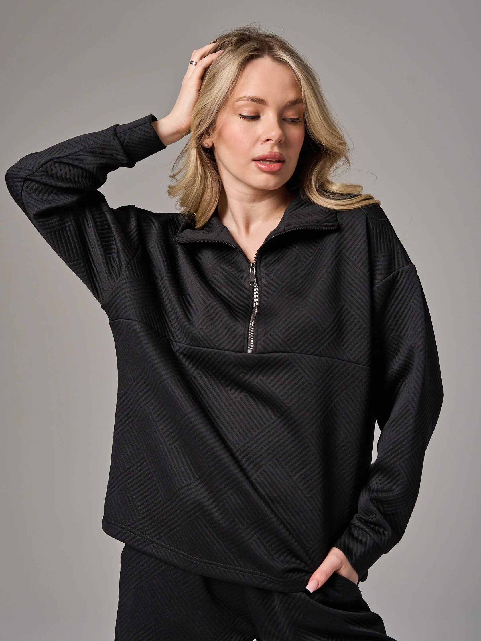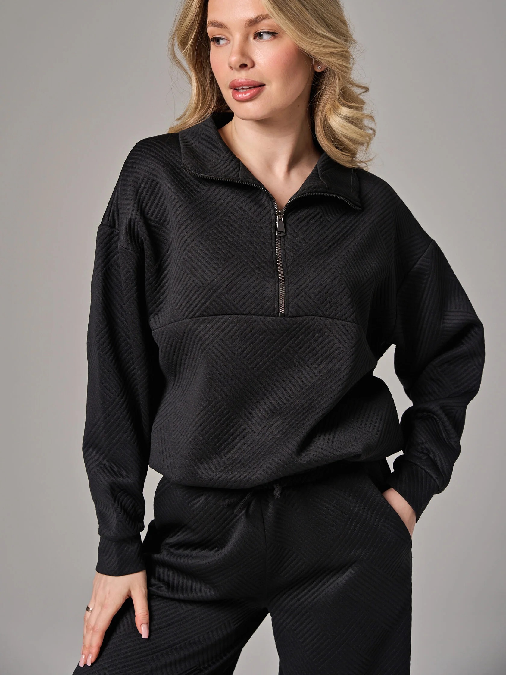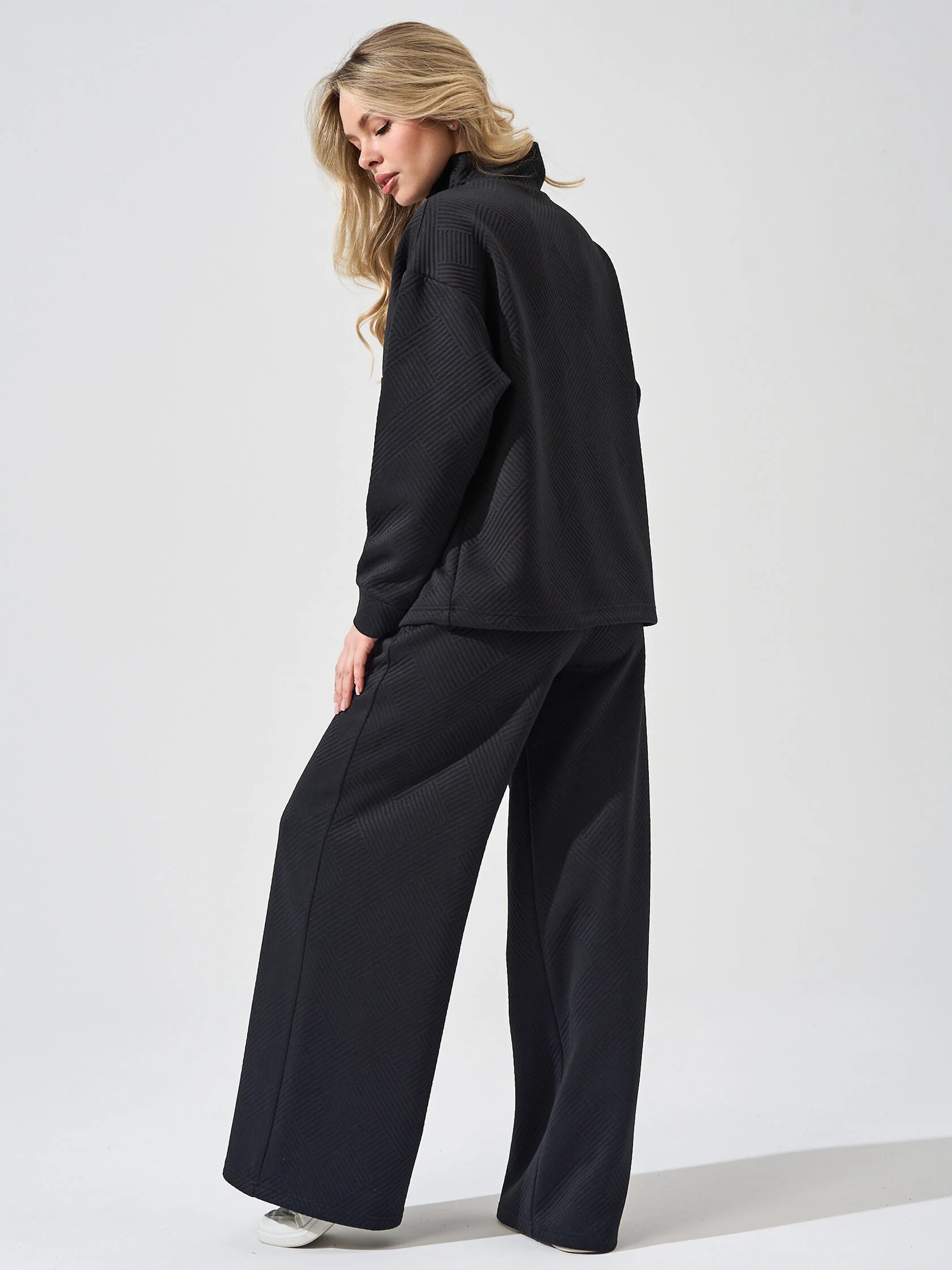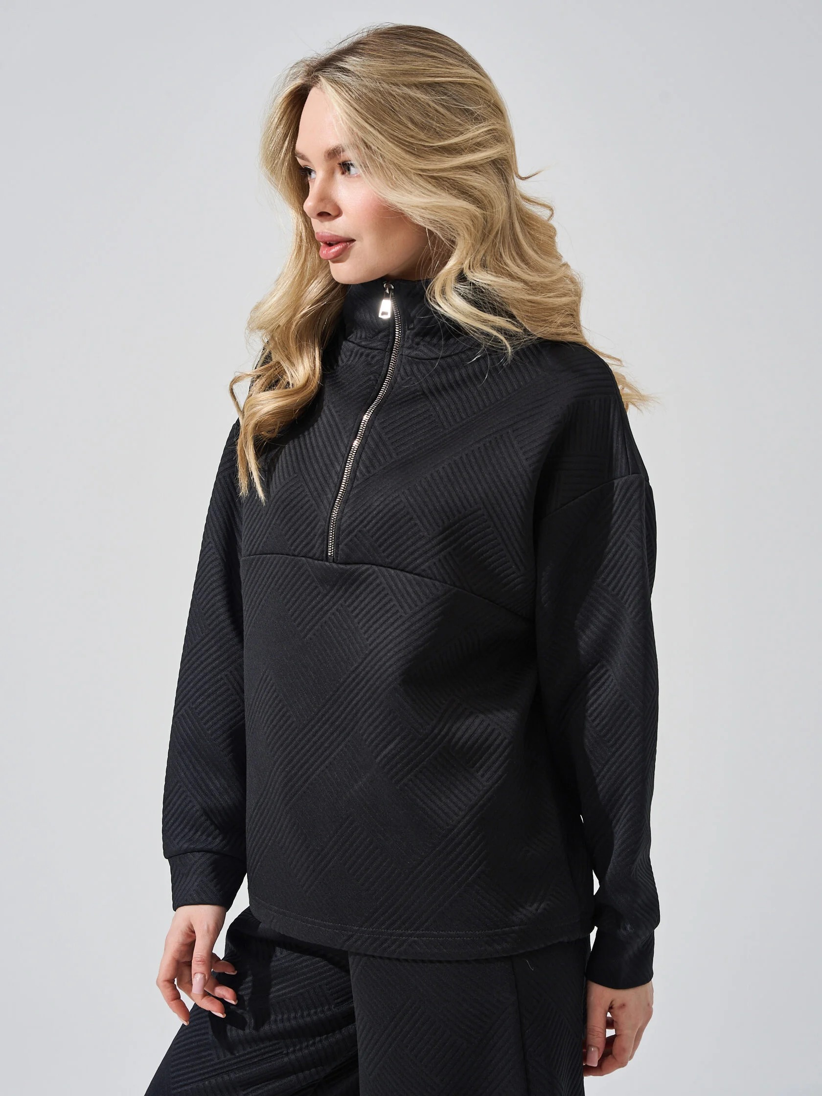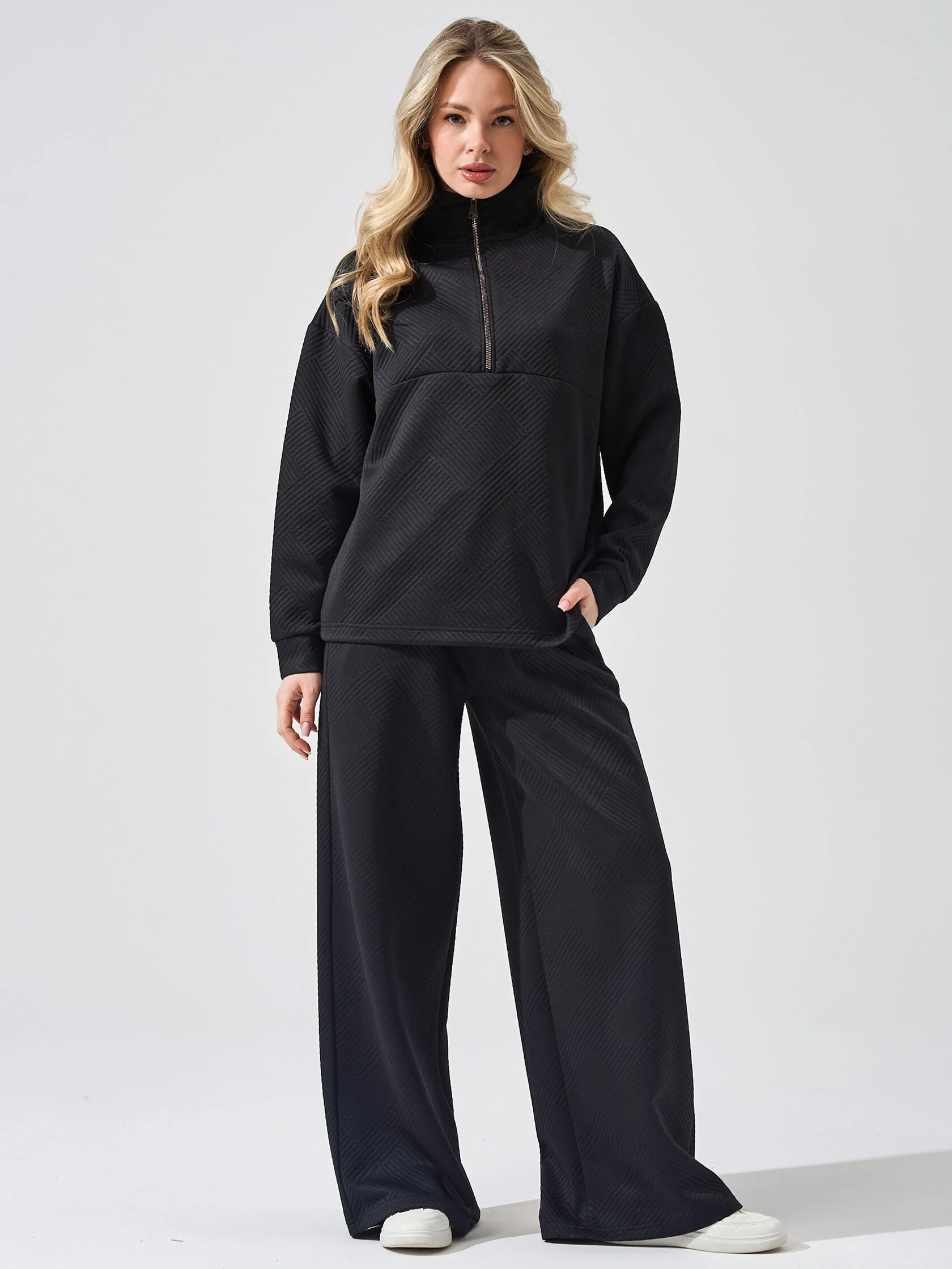 Женский костюм "Жаккард" 2450-Жак, состоящий из толстовки с застежкой на короткую молнию и брюк-палаццо. Толстовка свободной формы со спущенным втачным рукавом, брюки широкие, с поясом на резинке. Костюм отлично подойдёт для занятий спортом и вечерних прогулок.