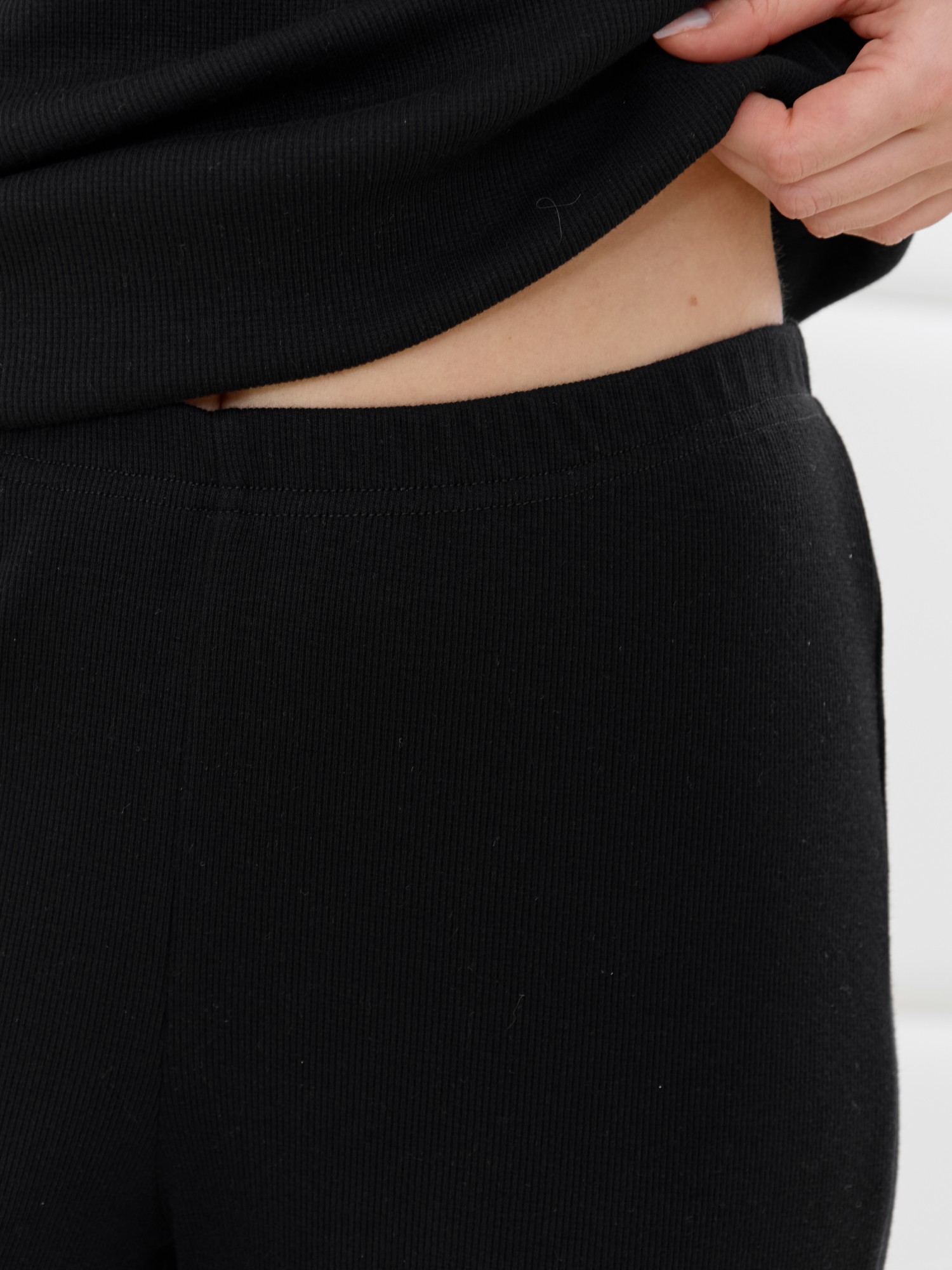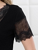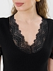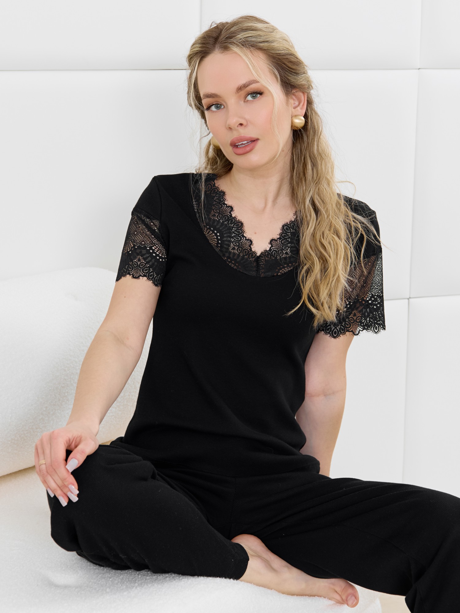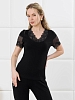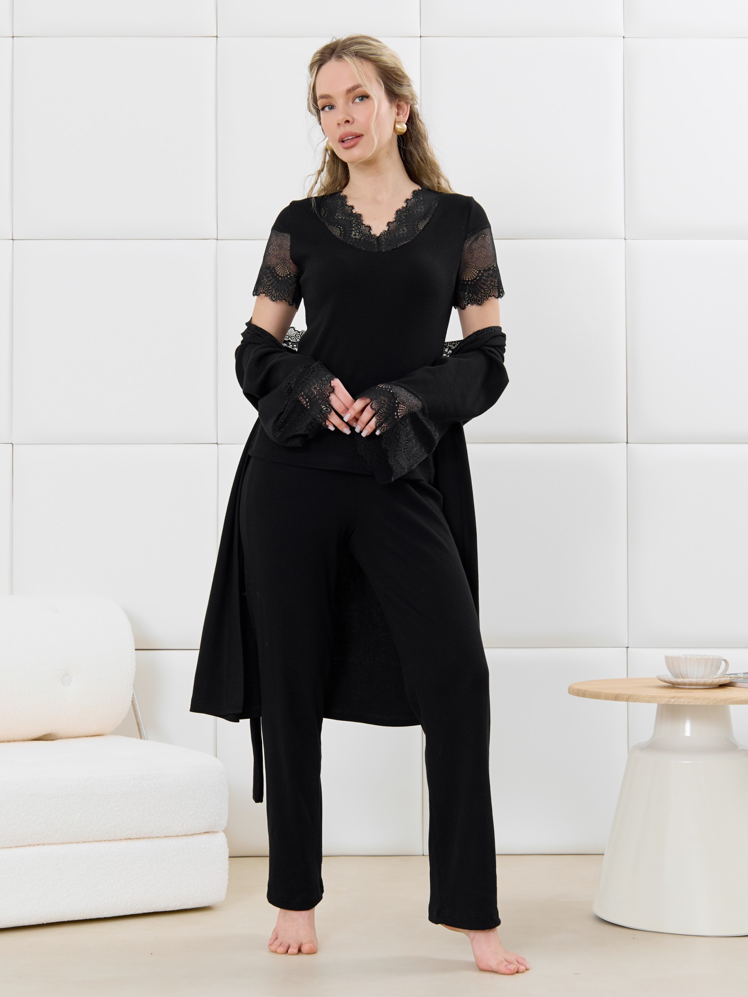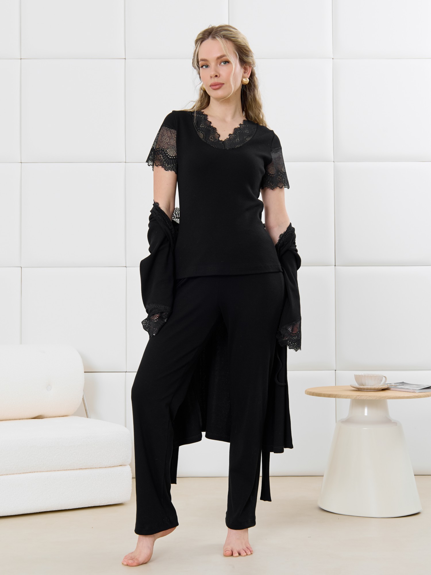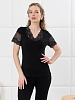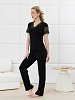 Пижама молодежная из гладкокрашеного трикотажного полотна «кашкорсе», состоящая из футболки и брюк. Футболка – прилегающего силуэта, с V-образным вырезом горловины, короткими втачными рукавами, выполненными из кружева. По всей длине вырез горловины переда отделан кружевной вставкой.