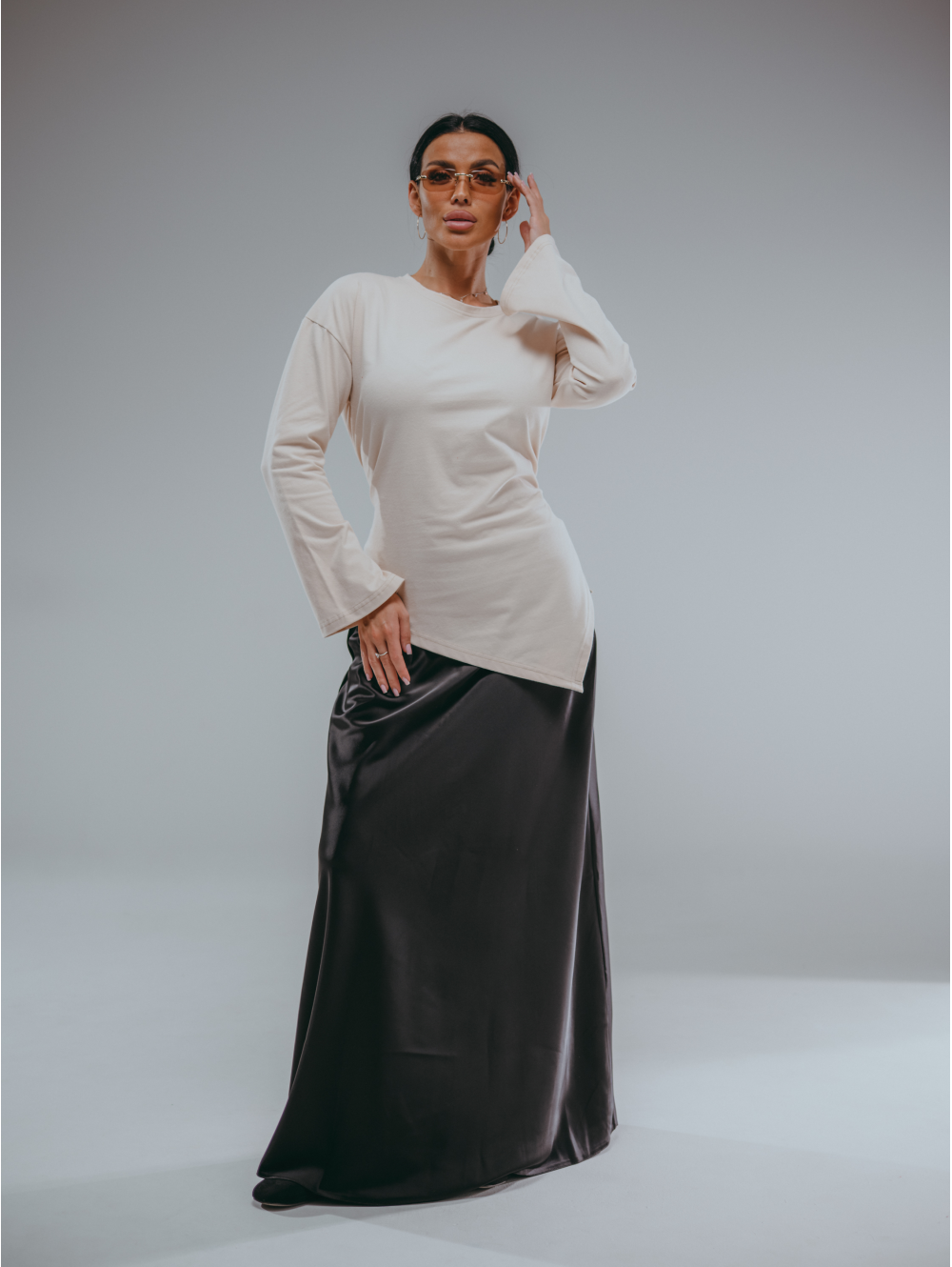 спинке, с длинным расклешенным к низу рукавом, низ ассиметричной геометрической