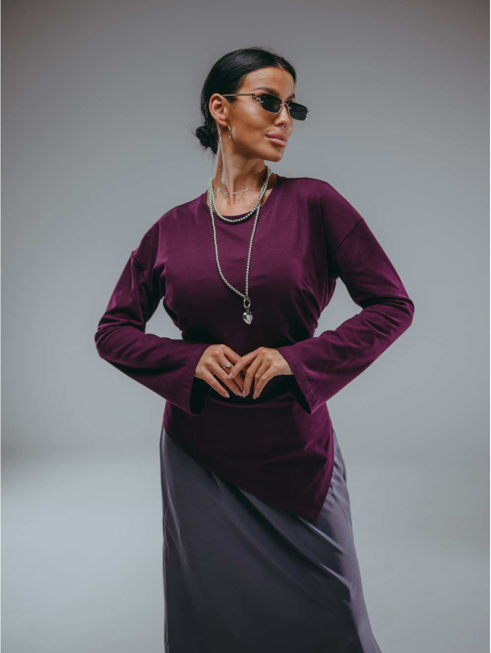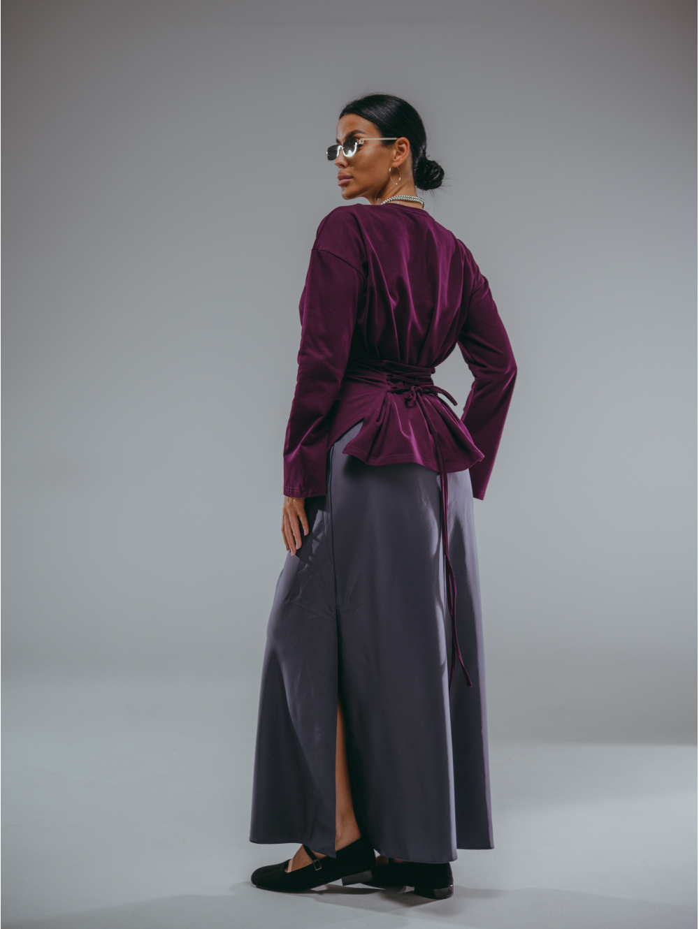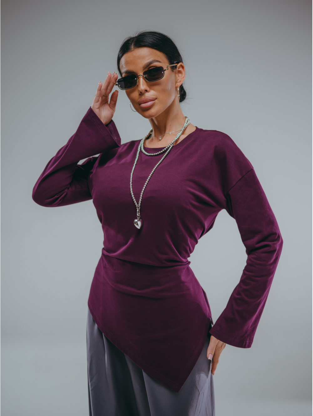 Лонгслив Бренда приталенного силуэта со шнуровкой из окантовки на спинке, с длинным расклешенным к низу рукавом, низ ассиметричной геометрической формы.