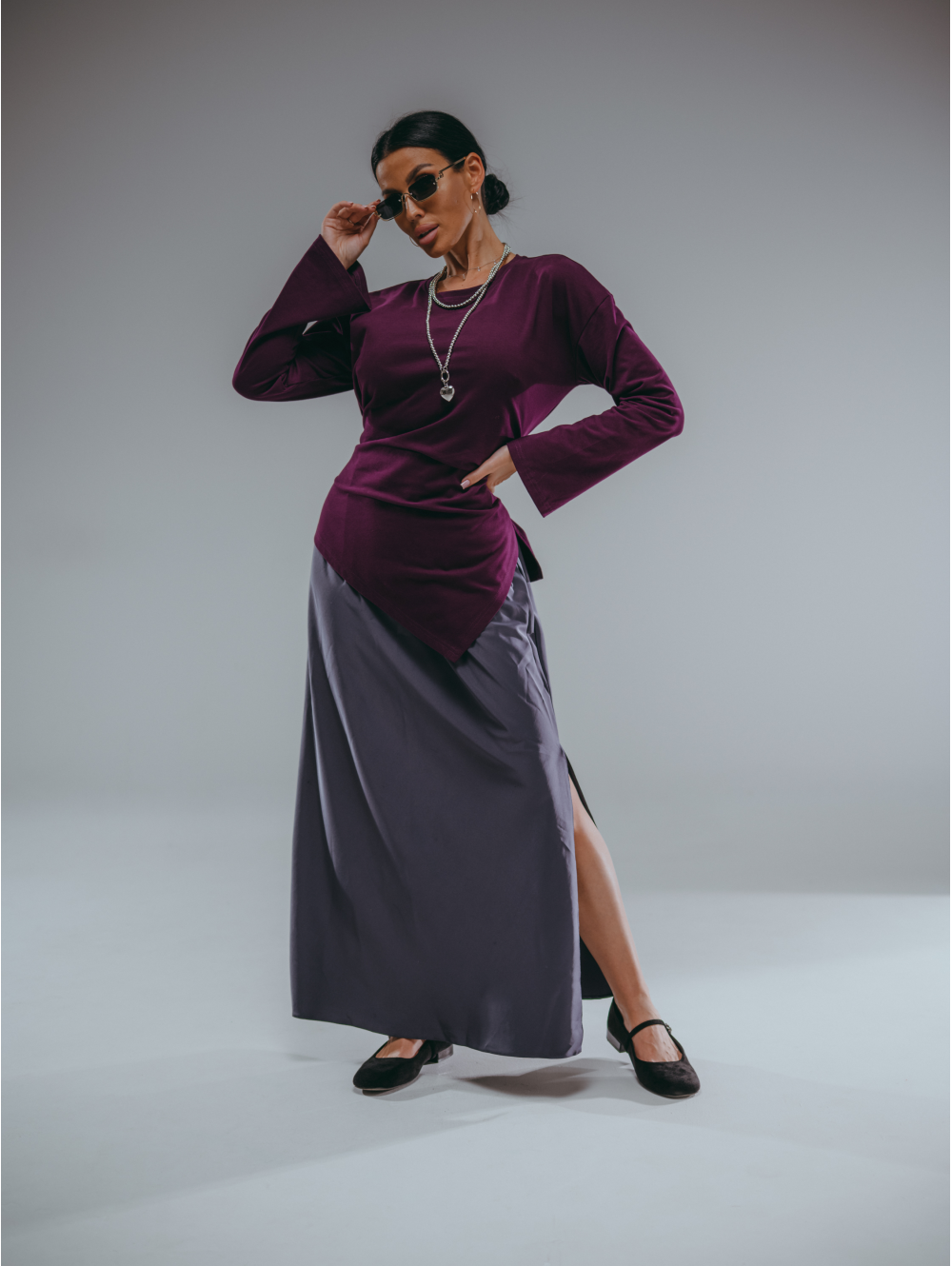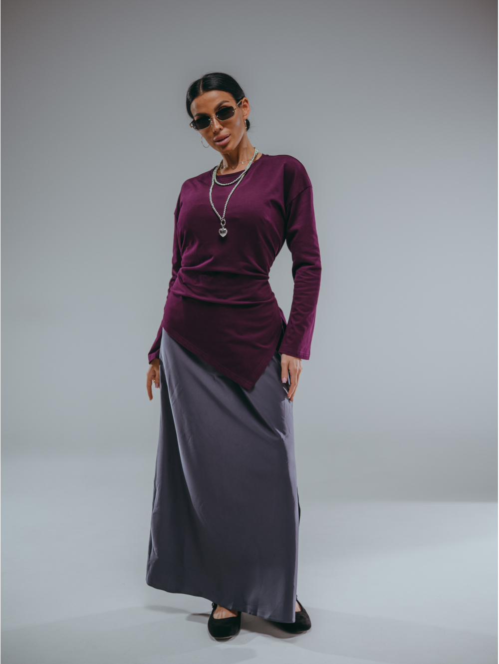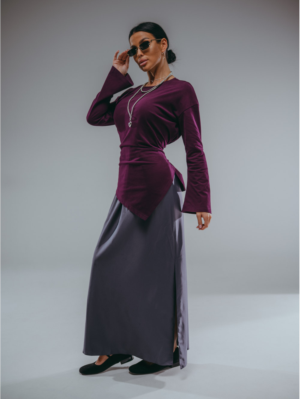 Лонгслив Бренда приталенного силуэта со шнуровкой из окантовки на спинке, с длинным расклешенным к низу рукавом, низ ассиметричной геометрической формы.