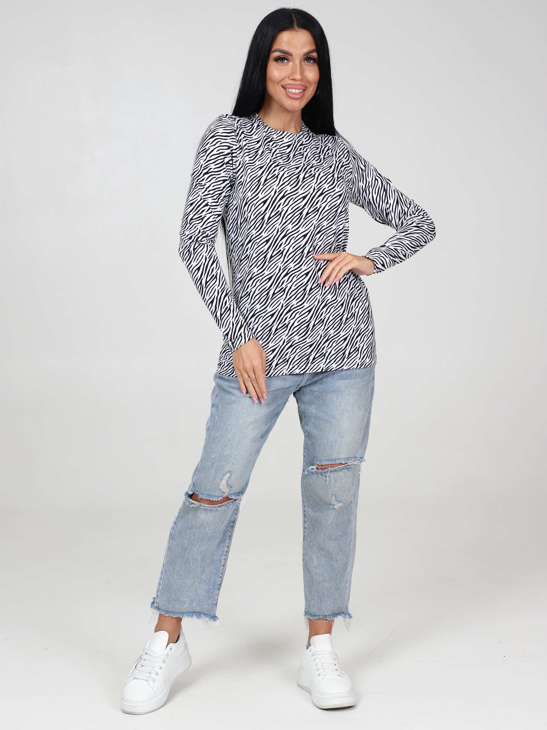 Погрузитесь в мир комфорта и стиля с нашим женским лонгсливом из набивного кулирного трикотажного полотна! Этот белый лонгслив не только станет незаменимой частью вашего гардероба, но и подарит вам уют и уверенность каждый день. У лонга идеальное сочетание стиля и мягкого материала (очень эластичного) обеспечивает максимальный комфорт и позволяет свободно двигаться. У белой кофты длинные рукава. Силуэт делают этот лонгслив универсальным вариантом для любого случая - будь то прогулка по городу или встреча с друзьями. Модная расцветка зебра придаст водолазке яркий и дерзкий образ. Благодаря большой размерной сетке, Вы сможете подобрать маленький или большой размер. Почувствуйте удобство и элегантность с нашим лонгсливом - стиль, комфорт и качество в одном образе!