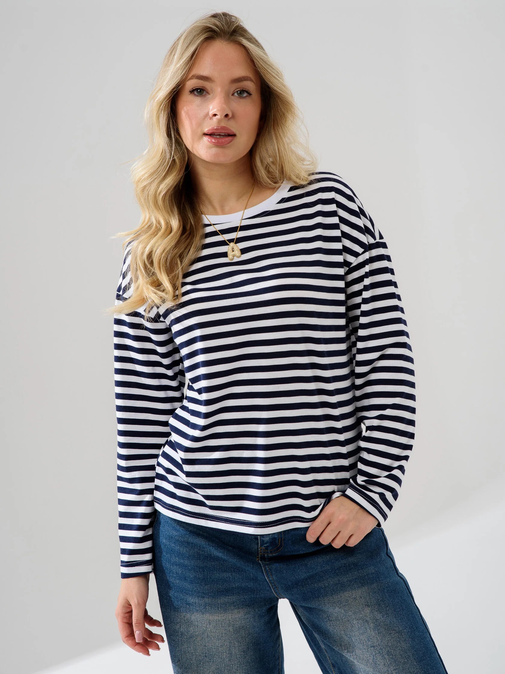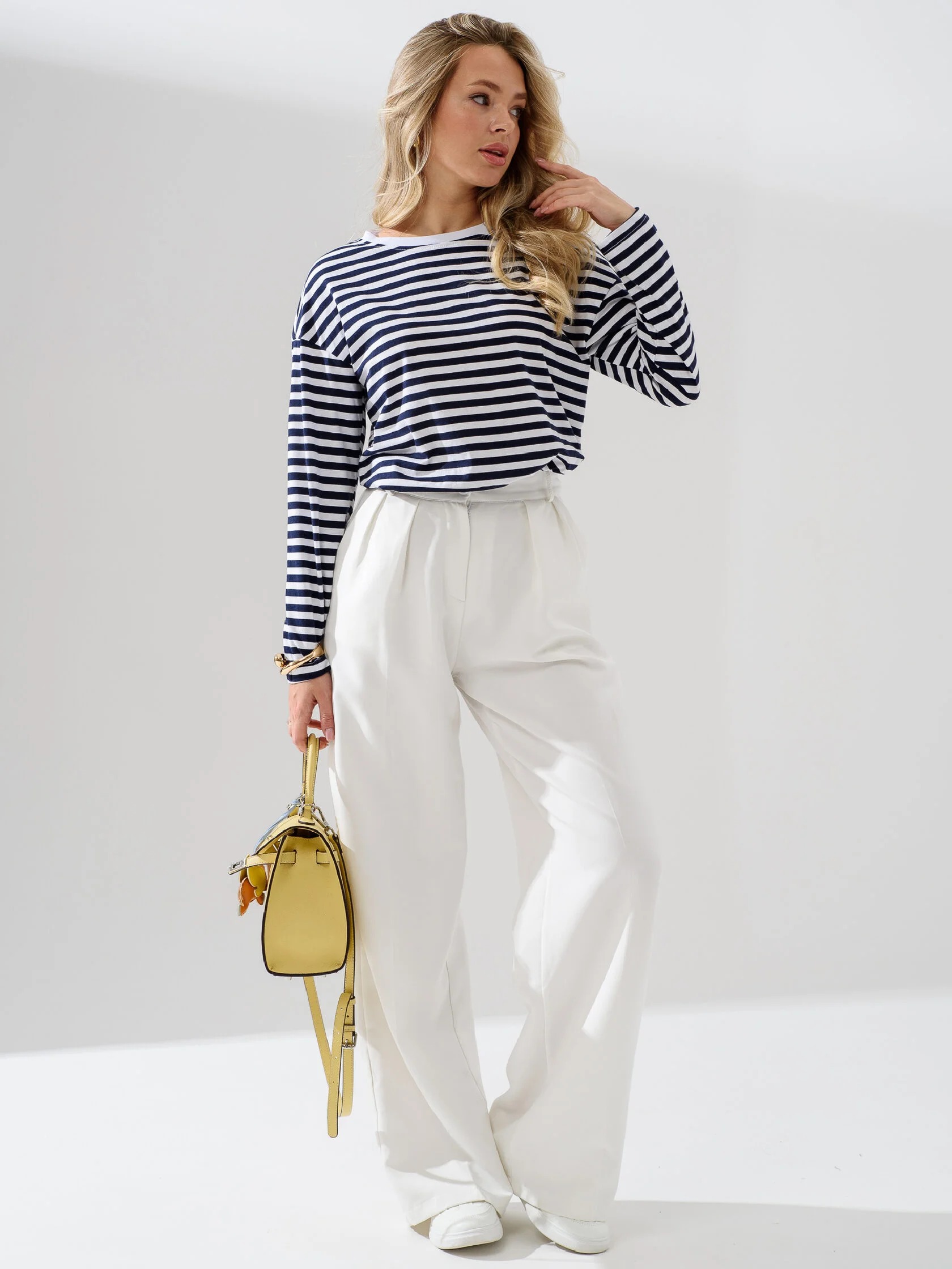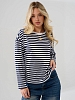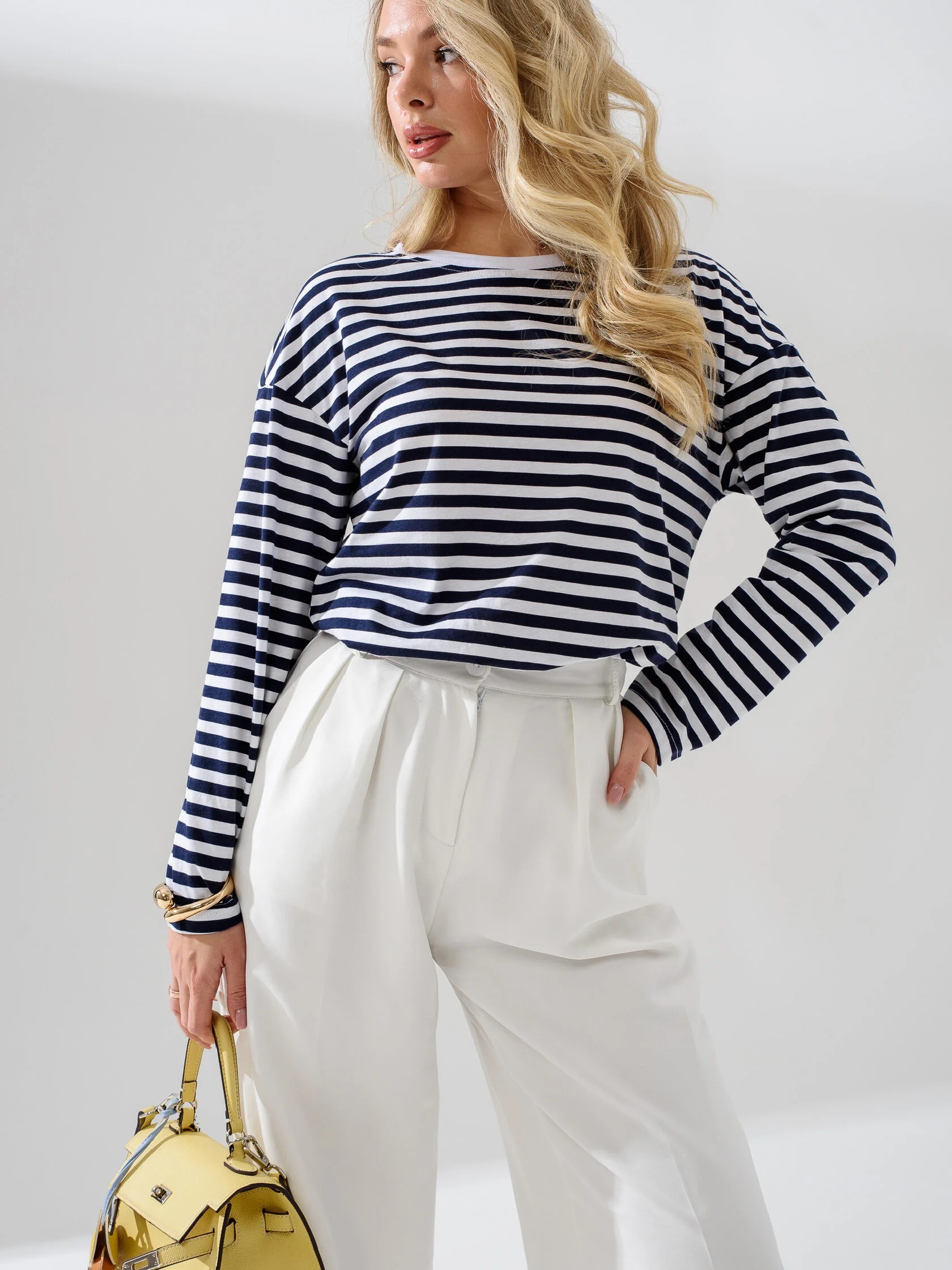 Элегантный женский лонгслив 2394-К с классическим дизайном в полоску, выполненный из высококачественной кулирки. Модель отличается простотой и универсальностью, прекрасно сочетается с различными элементами гардероба.