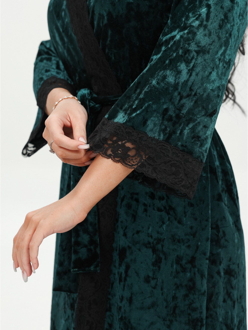 Пеньюар Малахит – лучшее модное изобретение, способное подчеркнуть женскую сексуальность. Он может стать изюминкой любого образа, подарить женщине уверенность в себе и любовь мужчины. Представляем Вам очаровательный комплект из роскошного бархата с отделкой из мягкого кружева. Он состоит из двух предметов: халат-пеньюар и сорочка на тонких бретельках. Изготовленный из мягкого, нежного, благородного материала, который на протяжении столетий не утрачивает своей привлекательности и высокого статуса. Бархат – это символ достатка, богатства, изысканной утонченности и высокого статуса владельца. Изделия из этой ткани всегда нарядны и лишены даже малейшего намека на повседневность.
