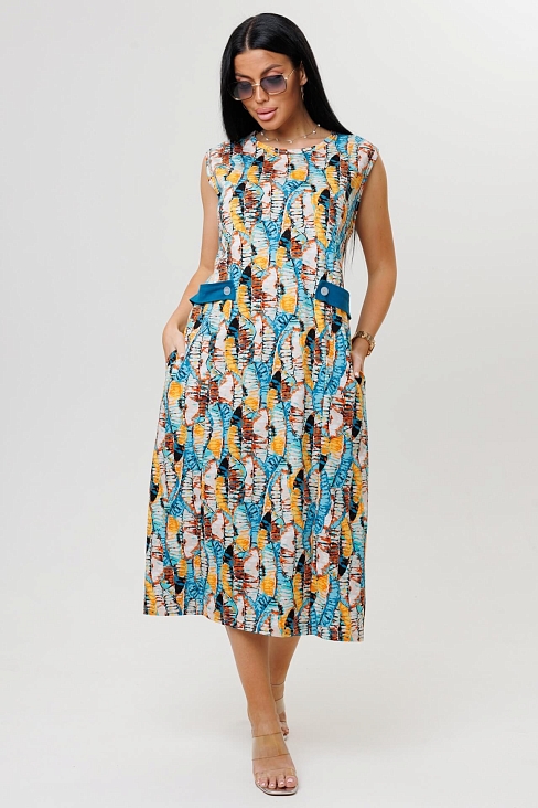 Женский сарафан 2165/1 / Бирюзовый свободного кроя, из трикотажного хлопкового полотна, с ярким принтом.