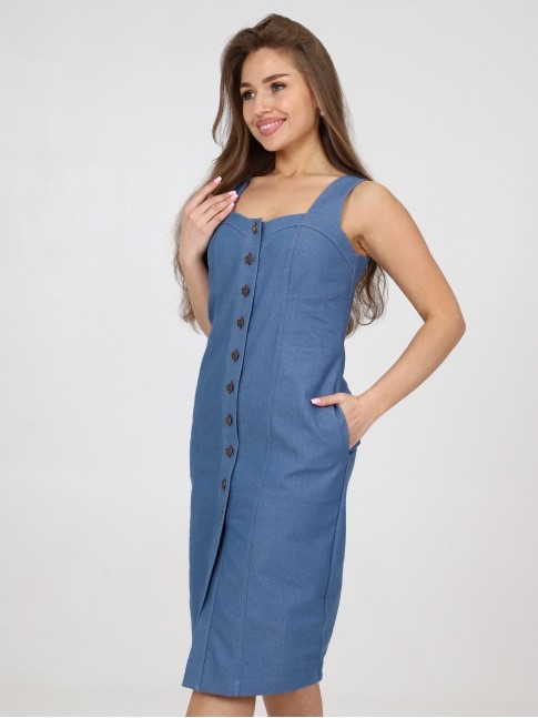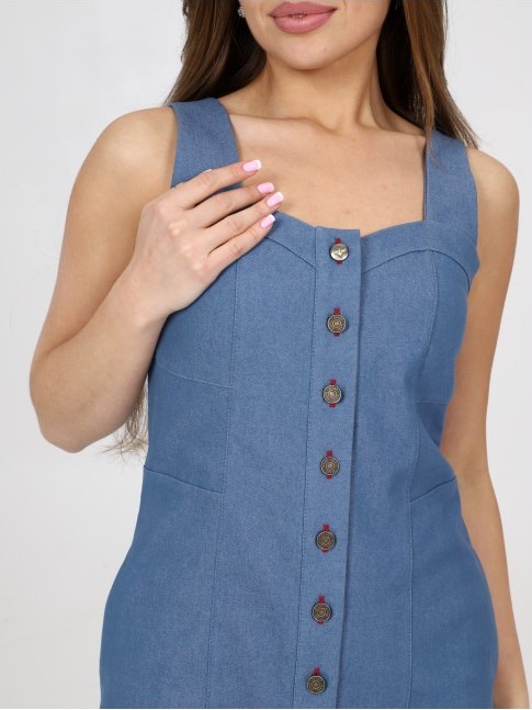 Женский длинный сарафан из легкой хлопковой джинсовой ткани с широкими бретелями.