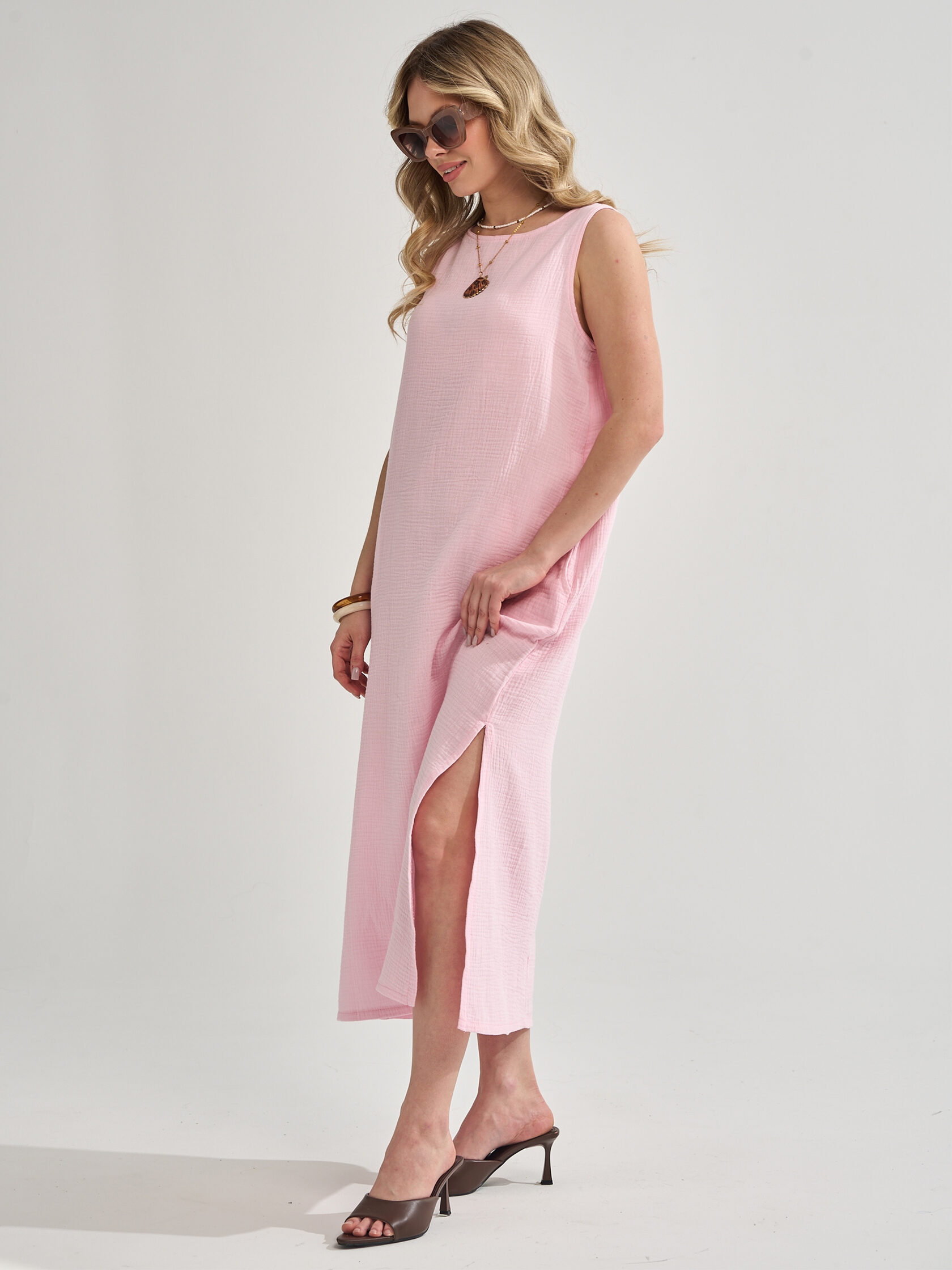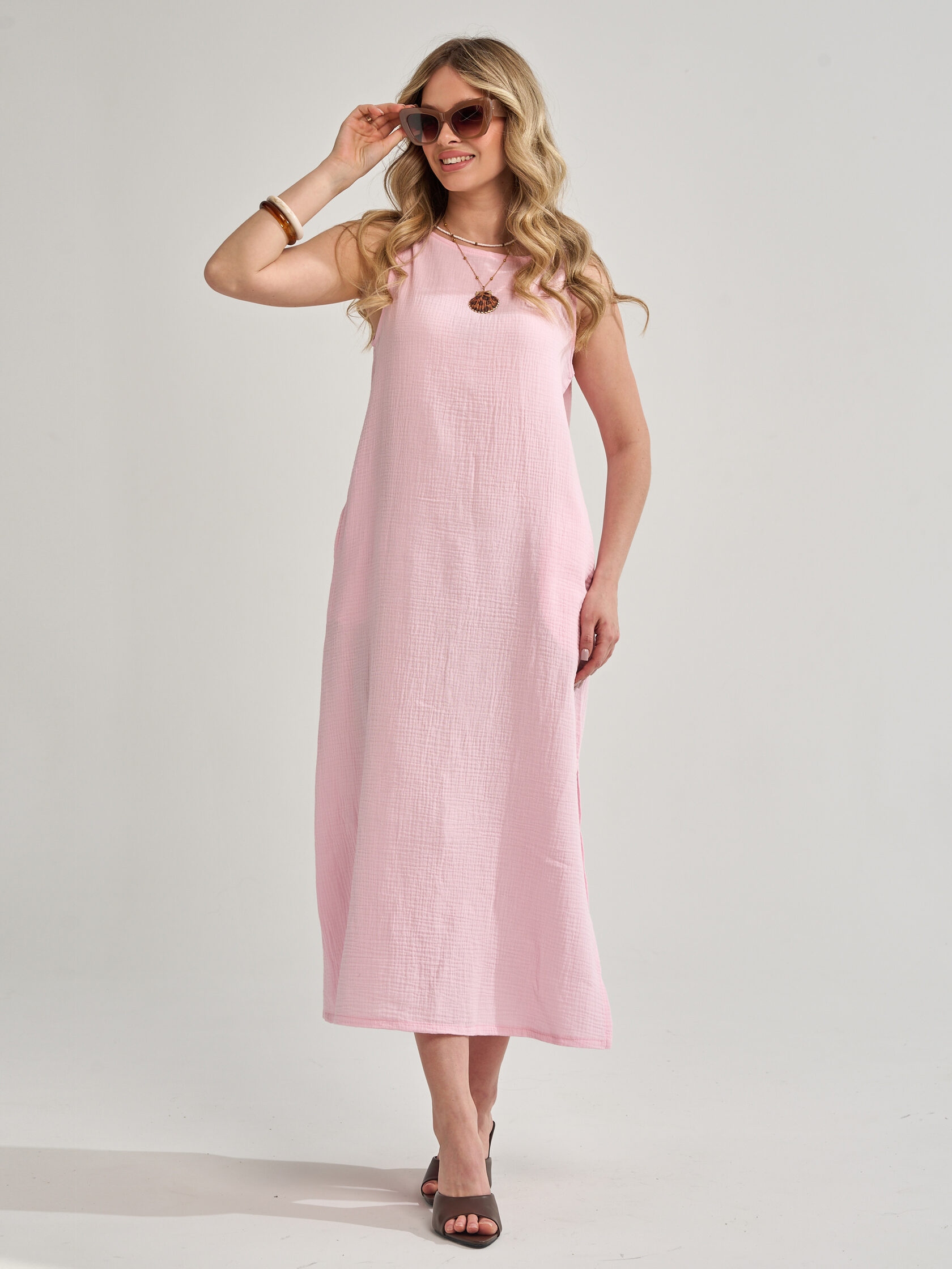 Женский сарафан "Муслин" 2319-Мус / Розовый отшивается из хлопковой ткани муслин. Летний сарафан длиной макси, с разрезами по бокам и карманами.