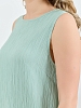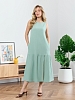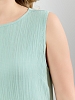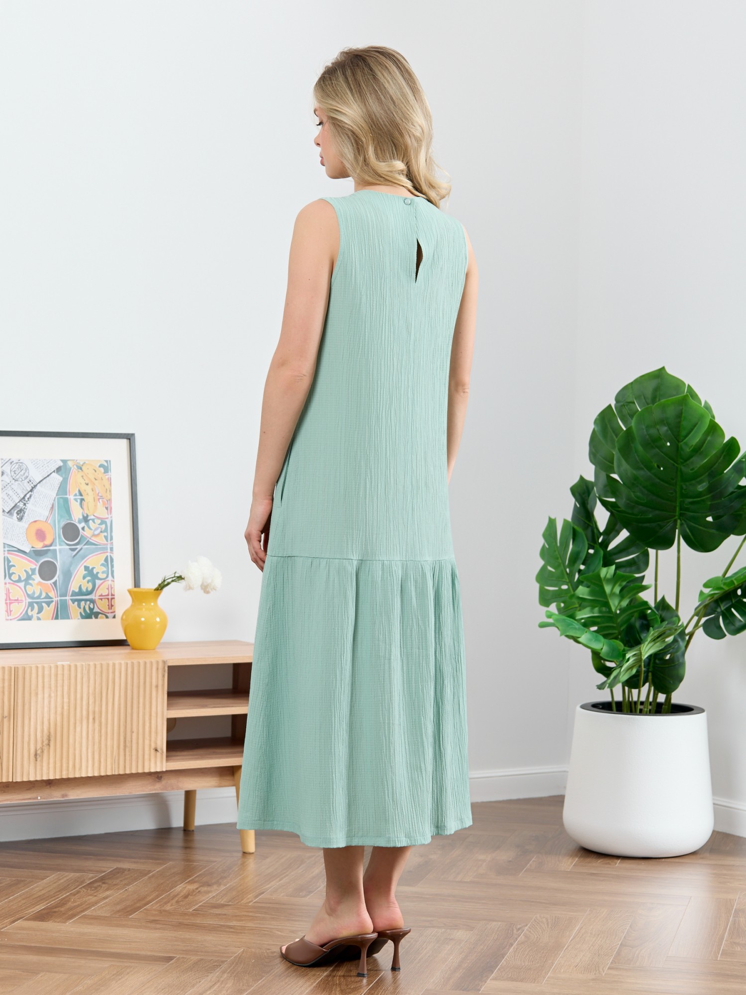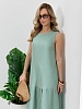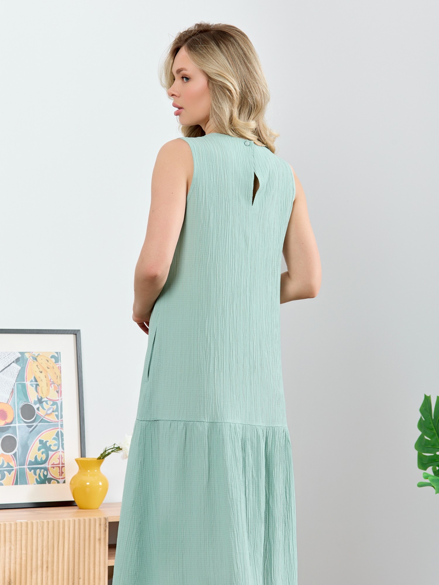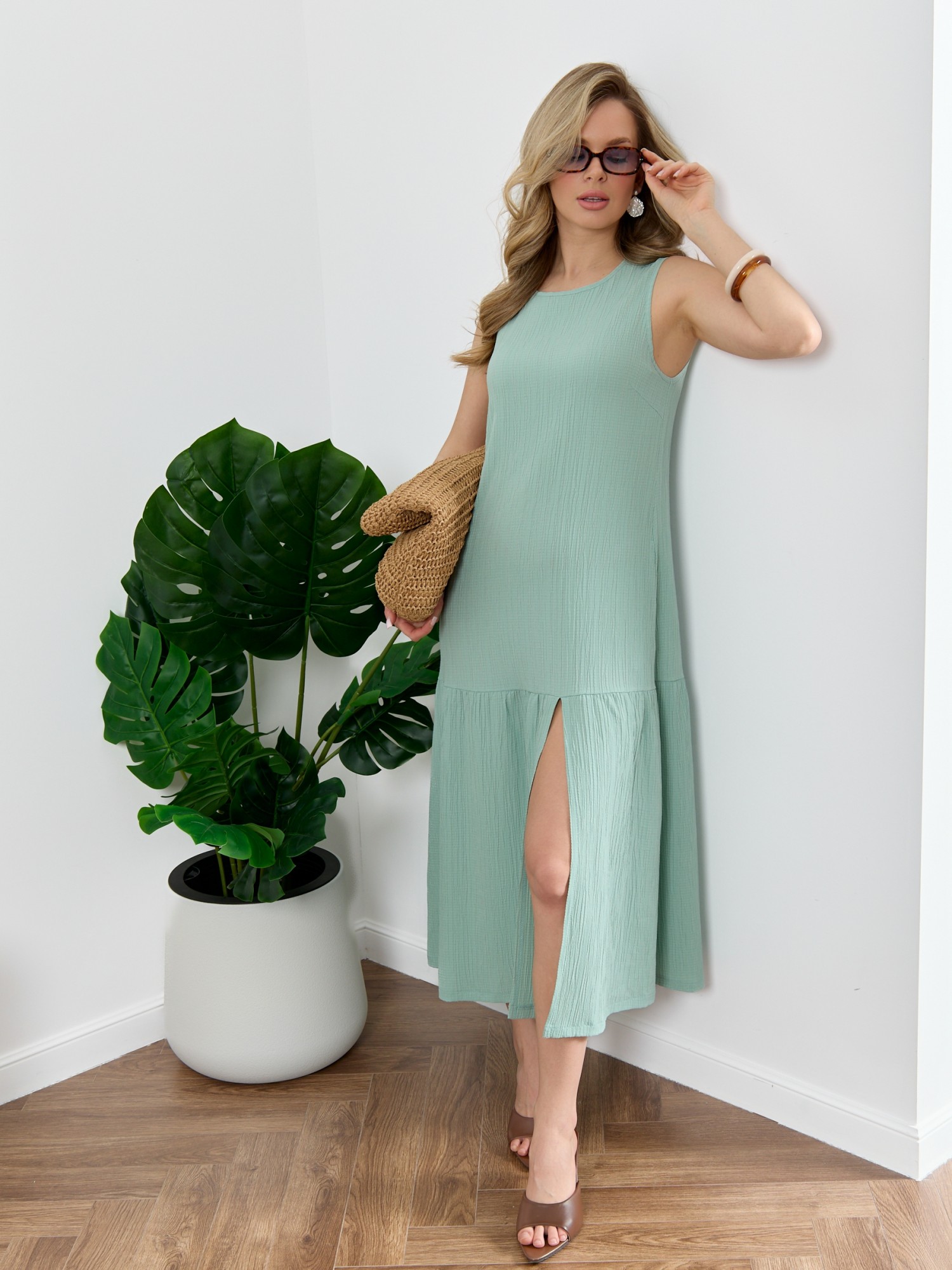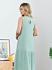 Сарафан женский из гладкокрашеного тканого полотна, удлиненное, полуприлегающего силуэта, без рукавов, с горловиной овальной формы. По нижнему прямому срезу притачная оборка с ассиметричным разрезом. Проймы, горловина окантованы основным материалом. При выборе изделия в белом цвете идеальным решением будет выбор белья нейтральных оттенков.