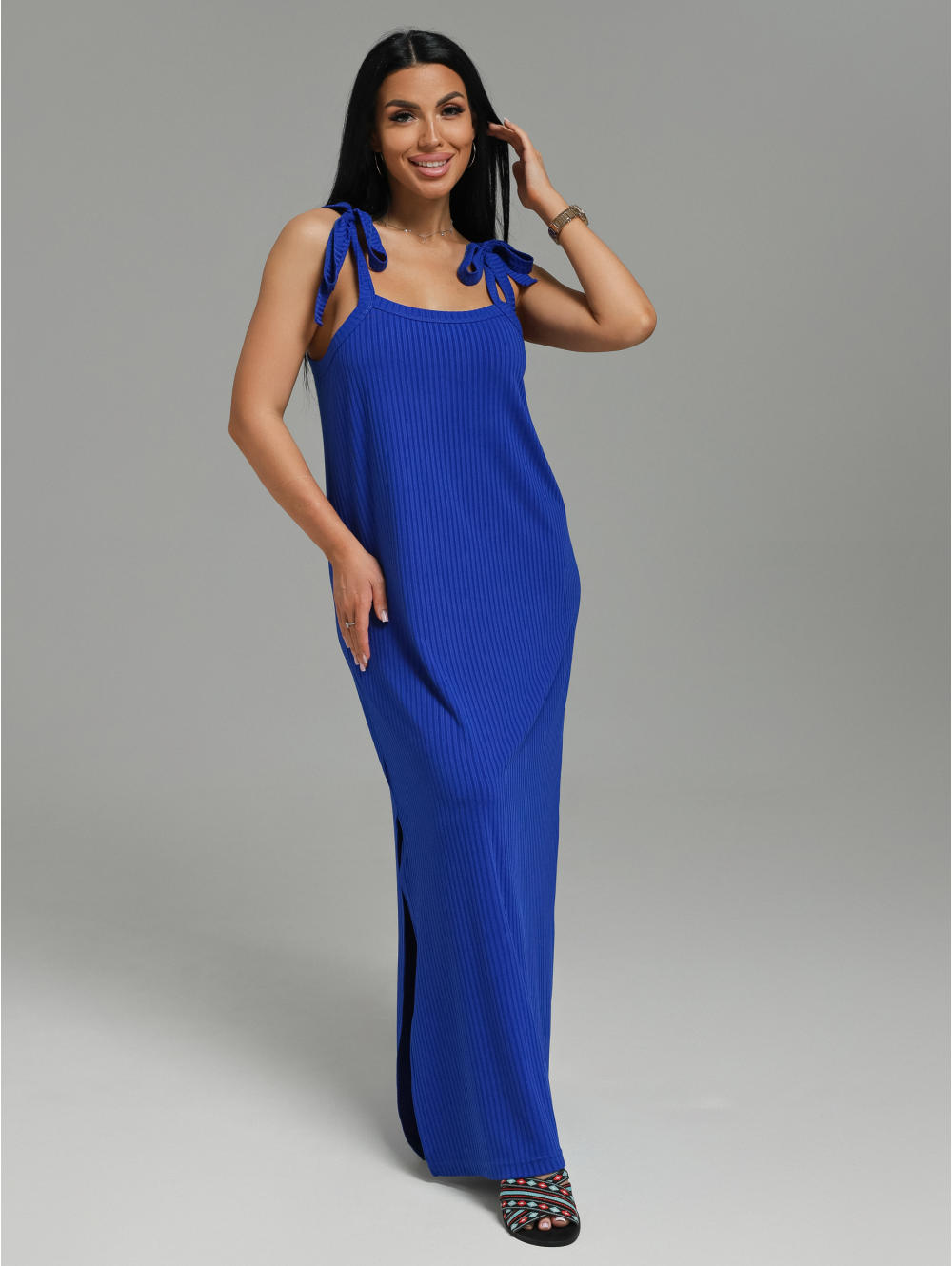 Сарафан женский Валенсия А-образного силуэта, длиной до щиколотки. Лямки сарафана представляют собой завязки из окантовки. В левом боковом шве разрез.
