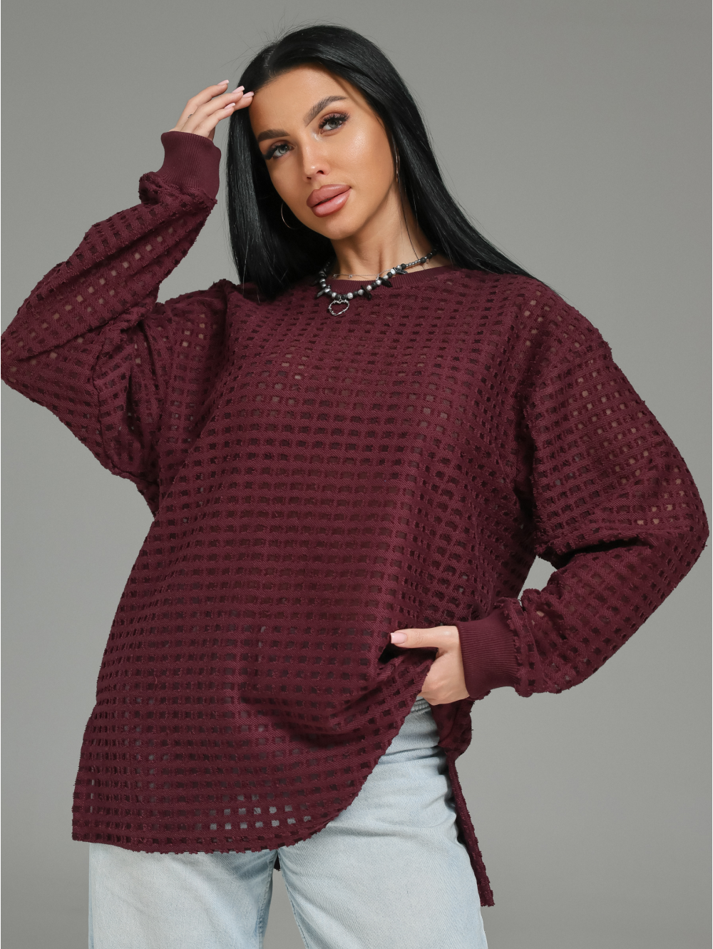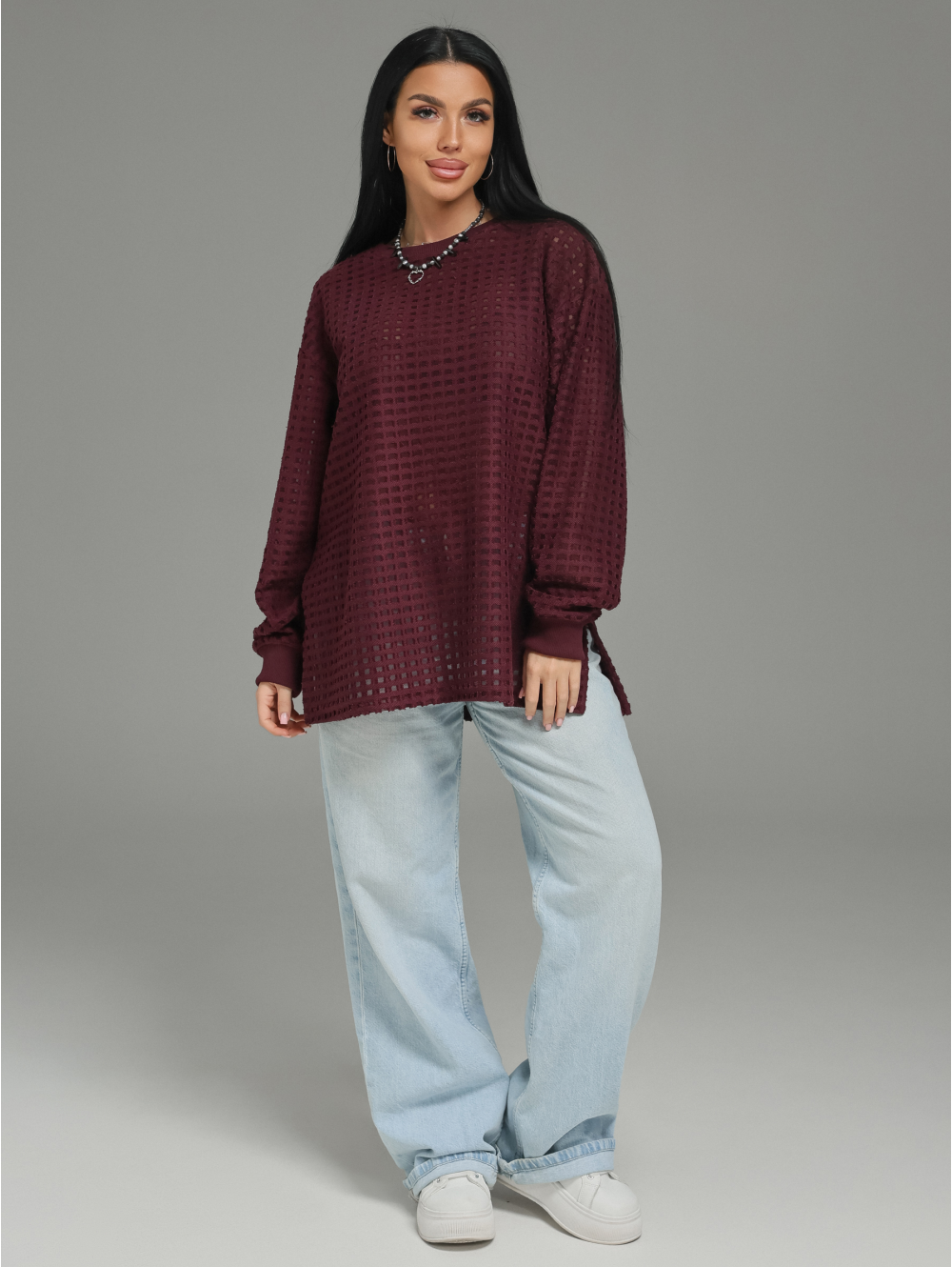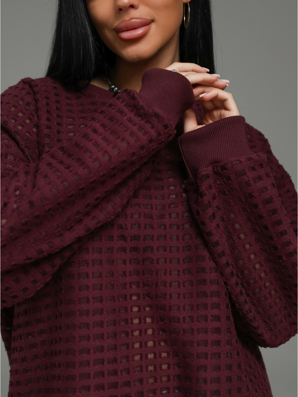 Главный герой — роскошный футер. Это не просто трикотаж. Это футер трехнитка «петля» с жаккардовым узором. Необычная фактура в клетку с прозрачными вставками в каждой клетке. Это ткань, которая выглядит дорого и так же ценно ощущается на теле.