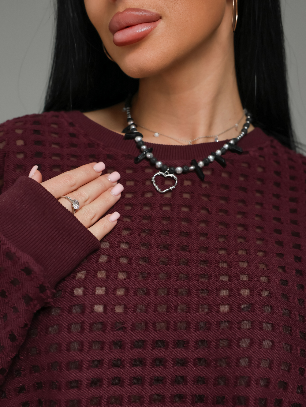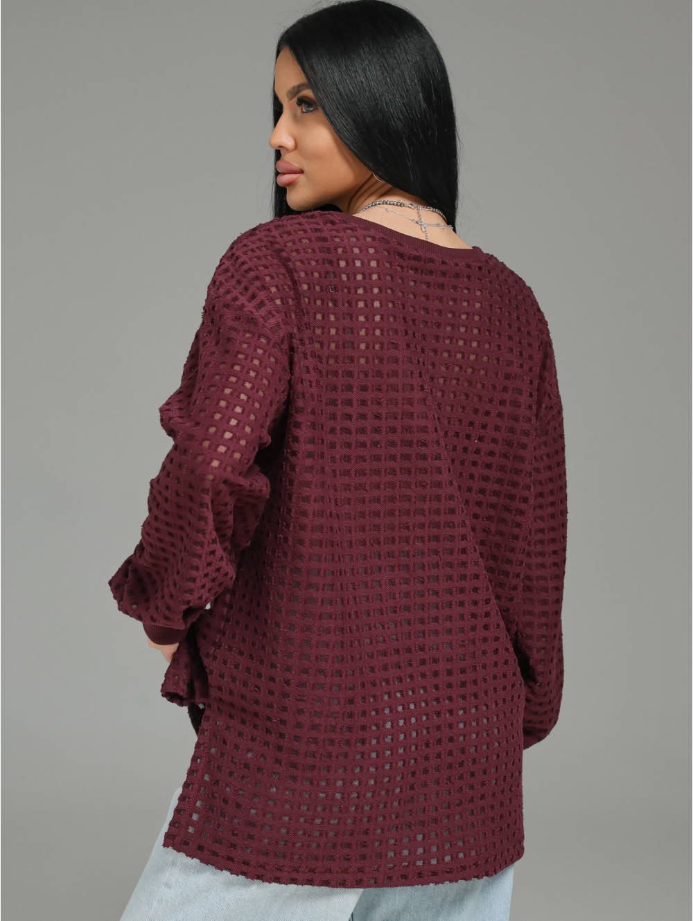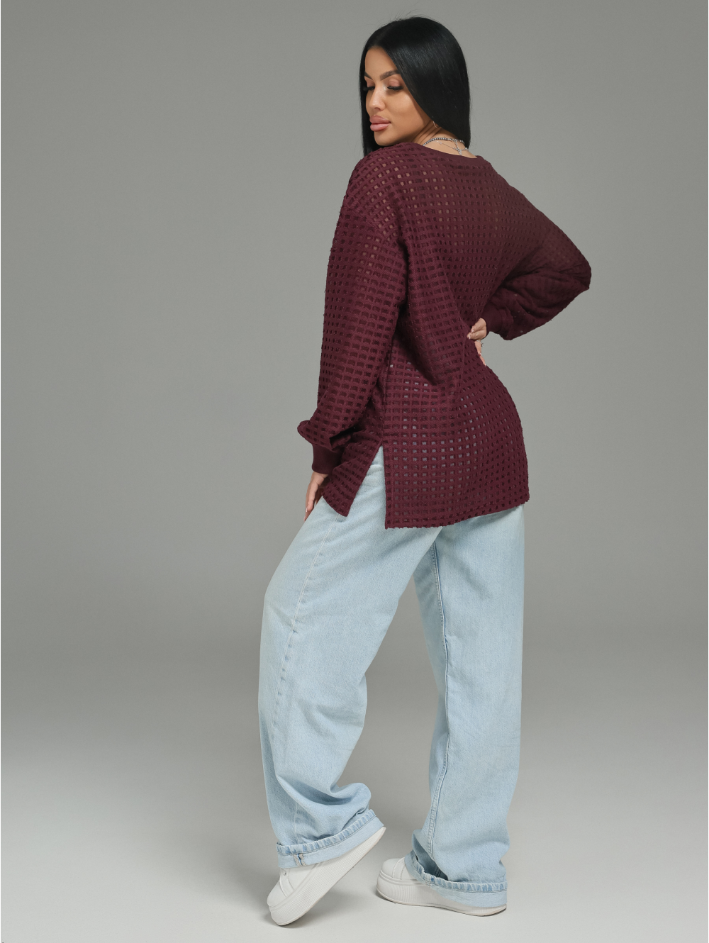 Главный герой — роскошный футер. Это не просто трикотаж. Это футер трехнитка «петля» с жаккардовым узором. Необычная фактура в клетку с прозрачными вставками в каждой клетке. Это ткань, которая выглядит дорого и так же ценно ощущается на теле.