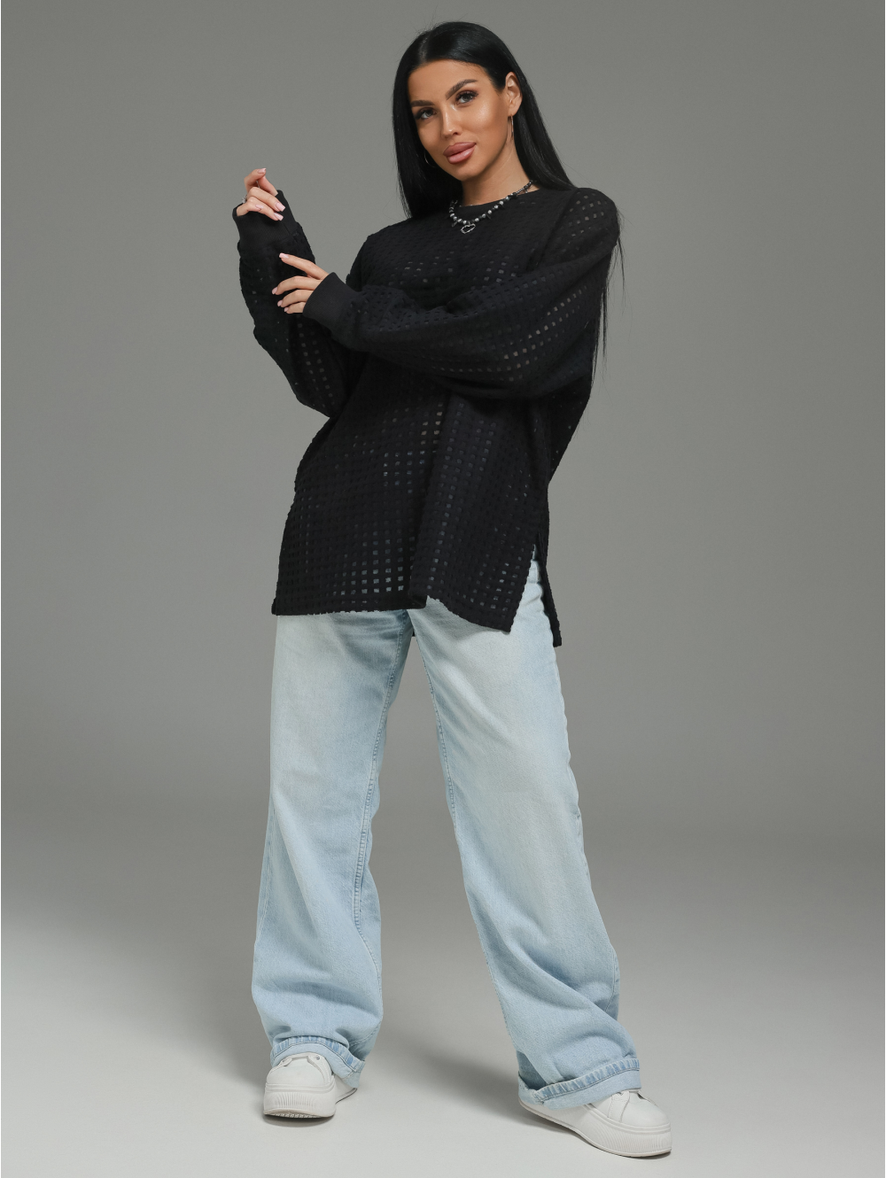 Главный герой — роскошный футер. Это не просто трикотаж. Это футер трехнитка «петля» с жаккардовым узором. Необычная фактура в клетку с прозрачными вставками в каждой клетке. Это ткань, которая выглядит дорого и так же ценно ощущается на теле.