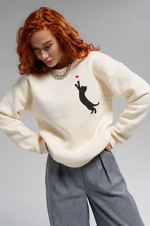 Женский свитшот оверсайз 8576 / молочный+котик с сердцем