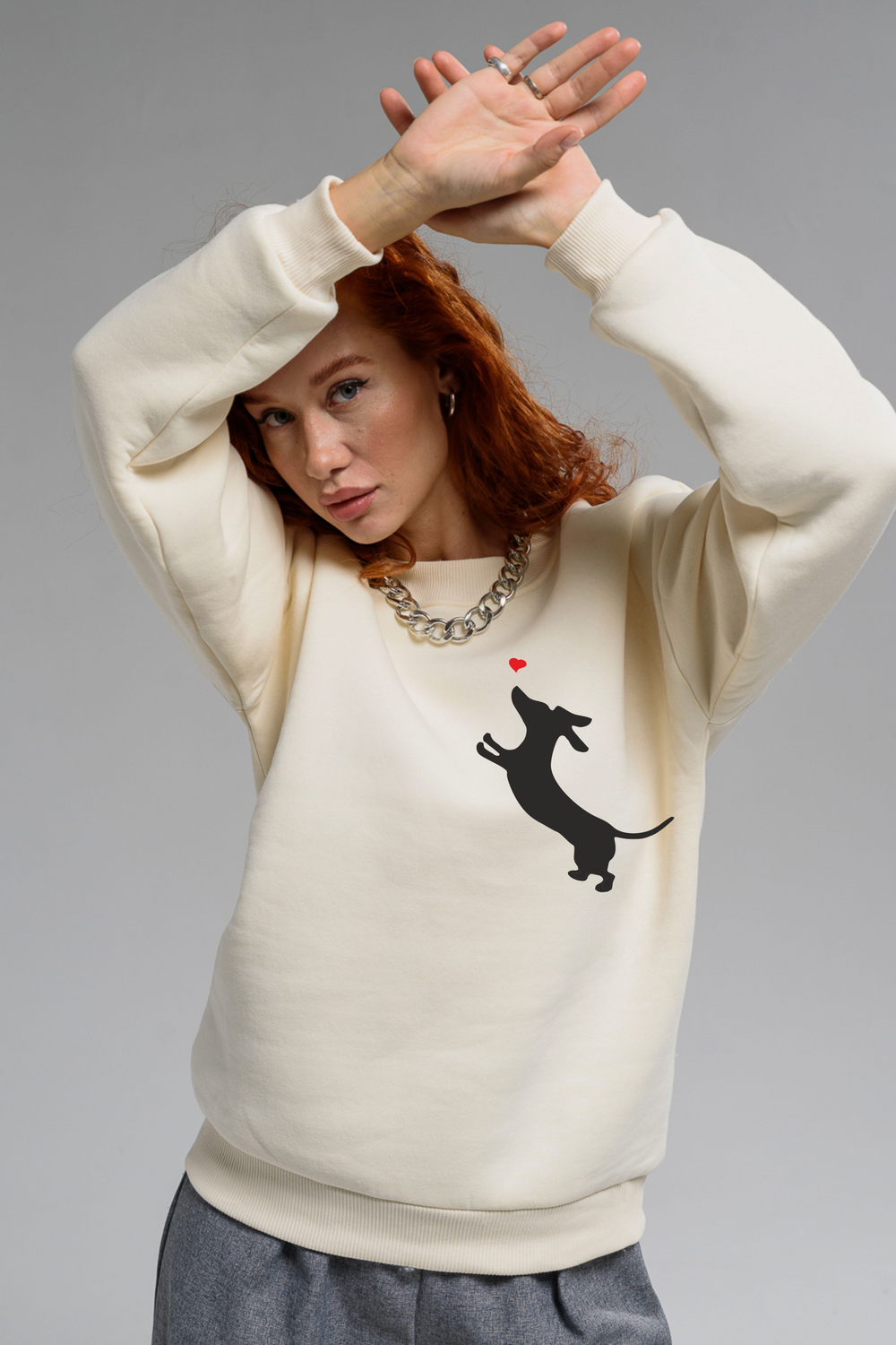 Женский свитшот оверсайз 8576 / молочный+собачка с сердцем