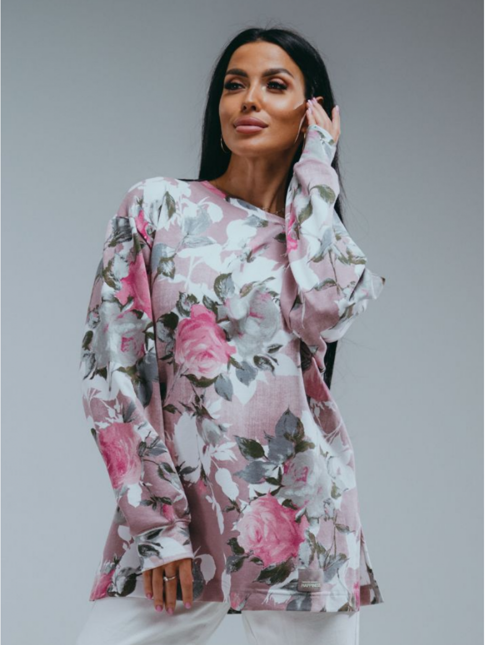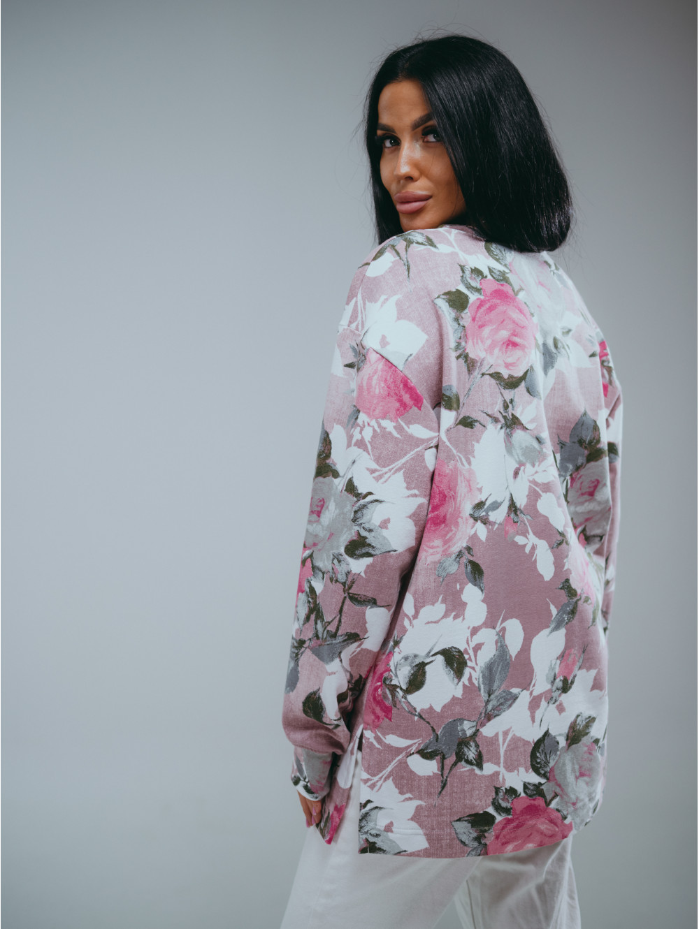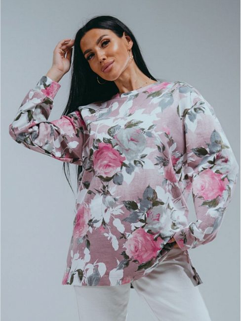 Свитшот Роуз прямой - оверсайз со спущенным плечом и длинным втачным рукавом. В боковых швах выполнены разрезы.