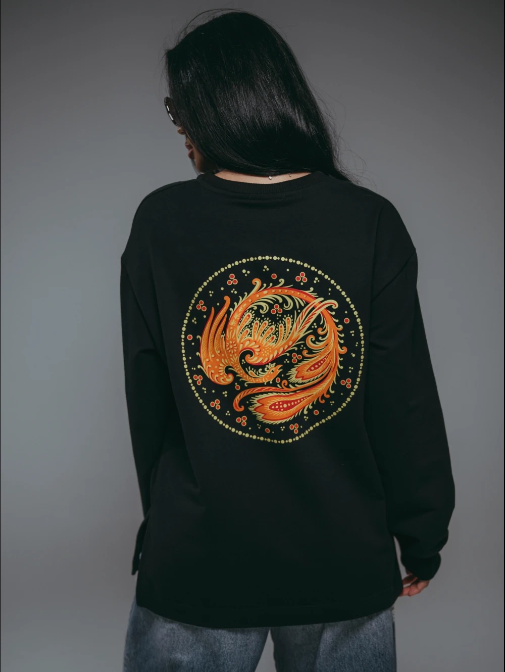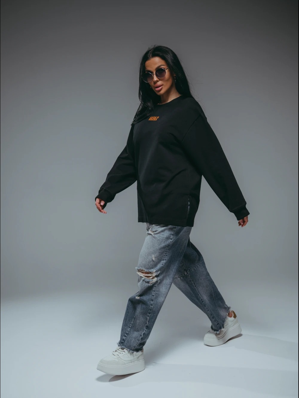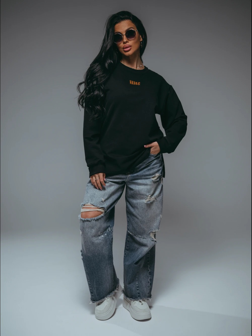Свитшот Русь прямой - оверсайз со спущенным плечом и длинным втачным рукавом. По низу рукавов втачаны манжеты из кашкорсе. Принт на полочке и спинке.
