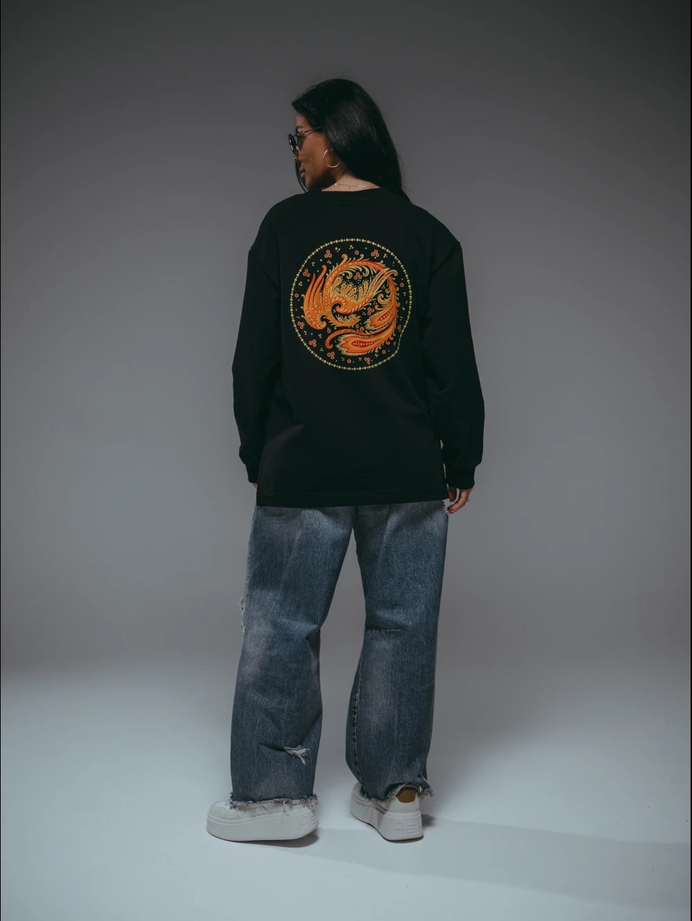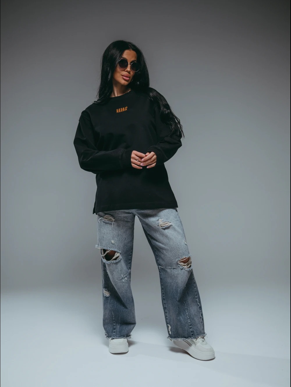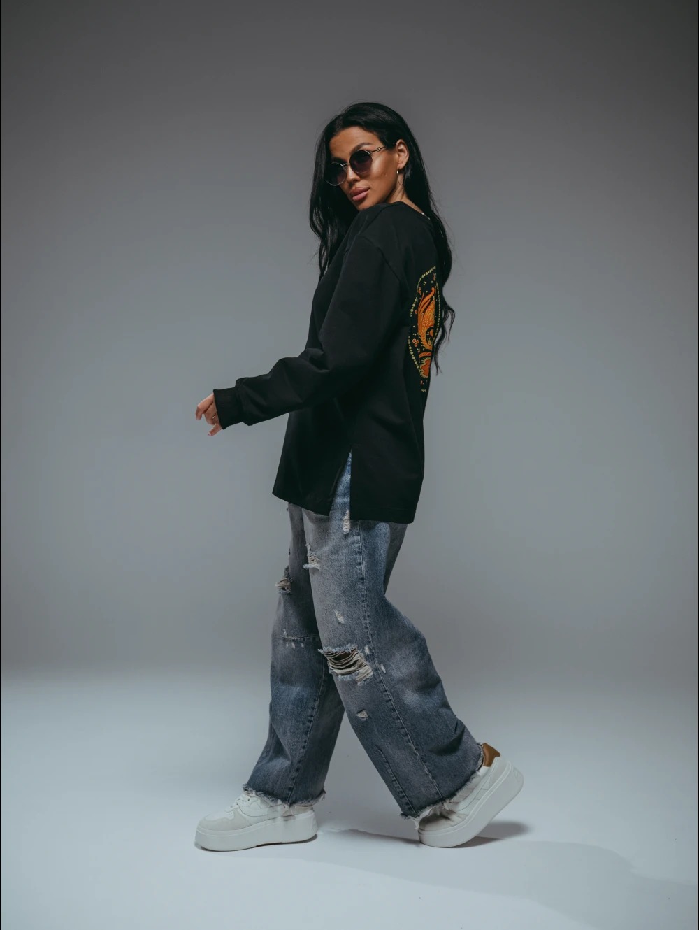 Свитшот Русь прямой - оверсайз со спущенным плечом и длинным втачным рукавом. По низу рукавов втачаны манжеты из кашкорсе. Принт на полочке и спинке.