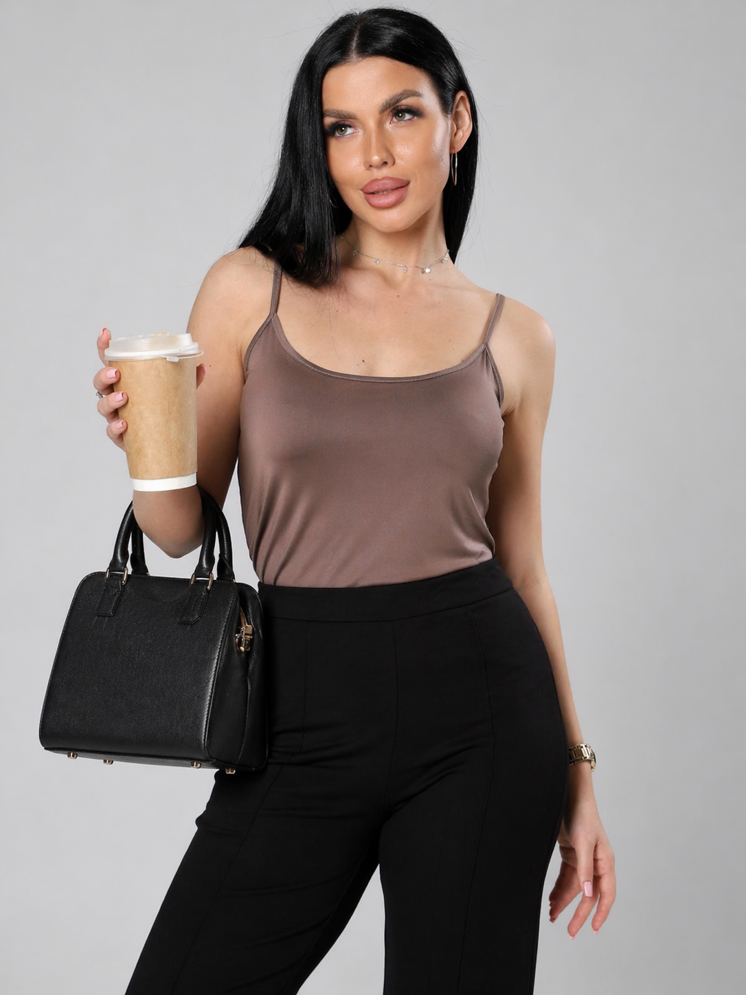 Женский топ на тонких бретелях из ткани «масло» — это модель из мягкого, упругого трикотажа, который хорошо тянется и сохраняет форму. Такие топы обычно имеют прямой силуэт, подходят для повседневной носки и сочетаются с джинсами, юбками или брюками.