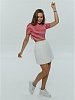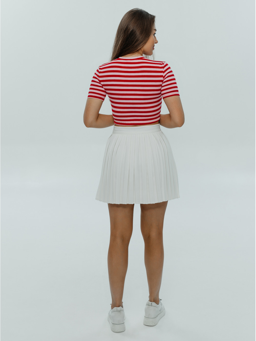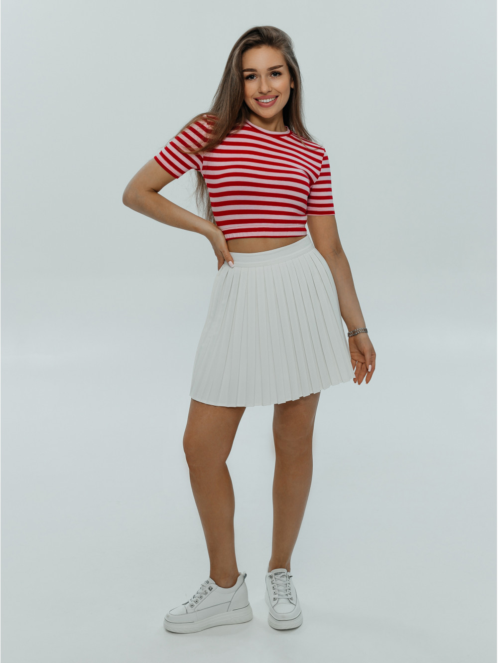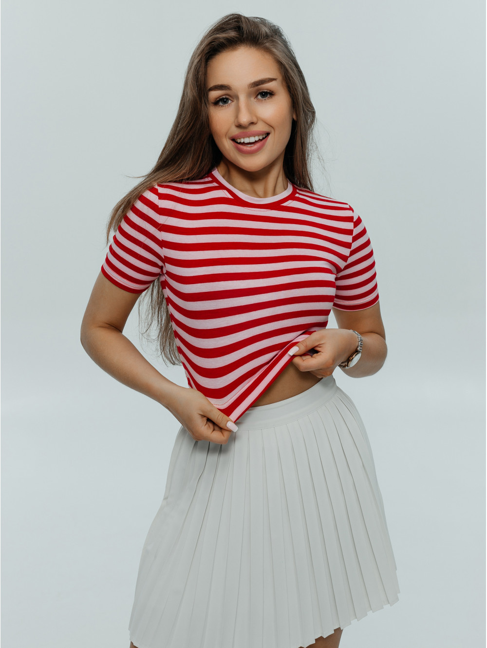 Женский топ-футболка с короткими рукавами из кулирки с лайкрой в полоску — это модель, которая сочетает комфорт и стиль. Кулирка — это трикотажное полотно, которое хорошо тянется и пропускает воздух, а лайкра добавляет эластичности.