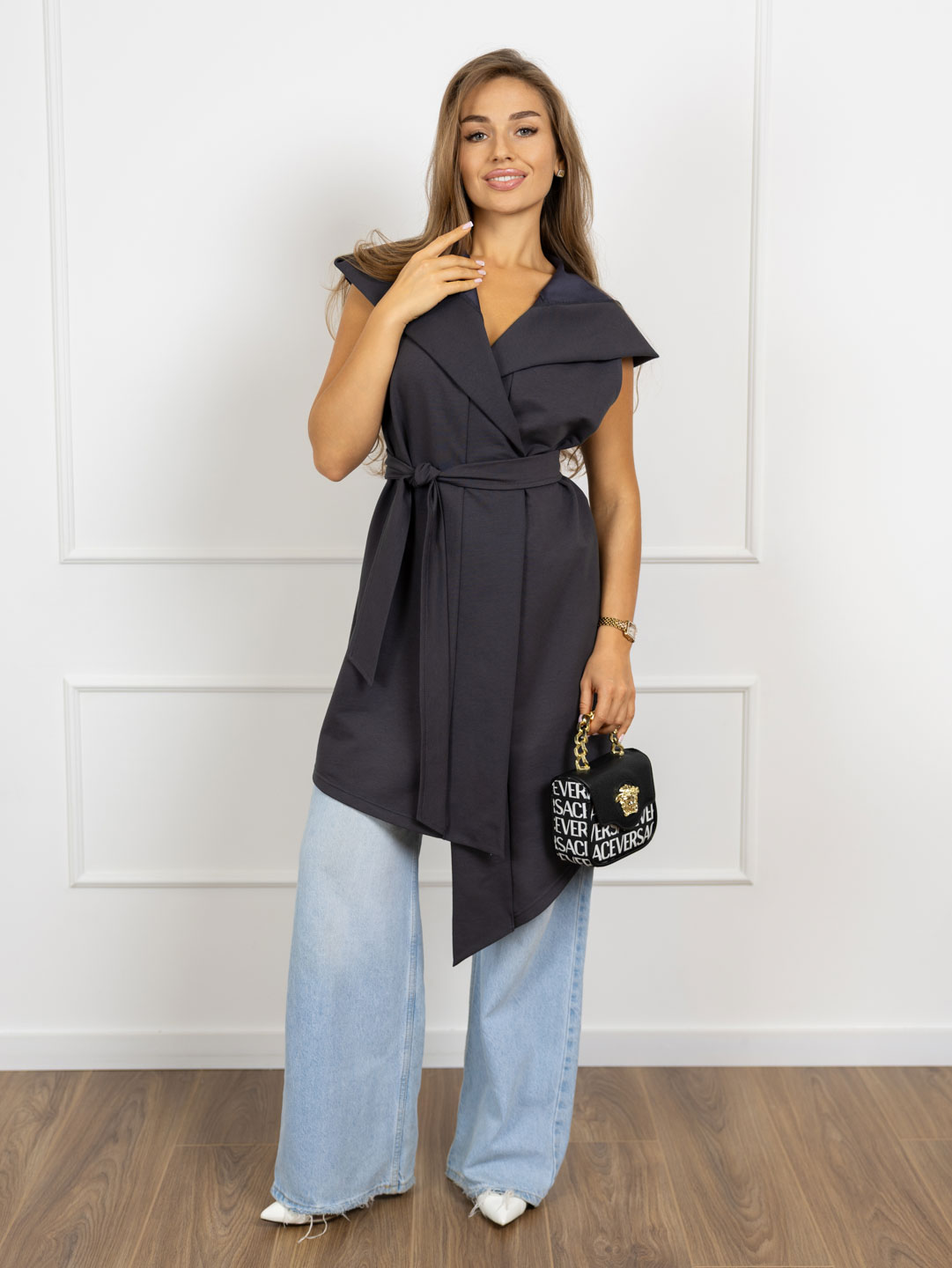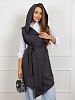 Жилетка-мантия из футера с капюшоном и кушаком, асимметричный борт придает изюминку образу. С нашей жилеткой можно создать множество образов от деловых до вечерних.