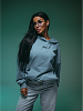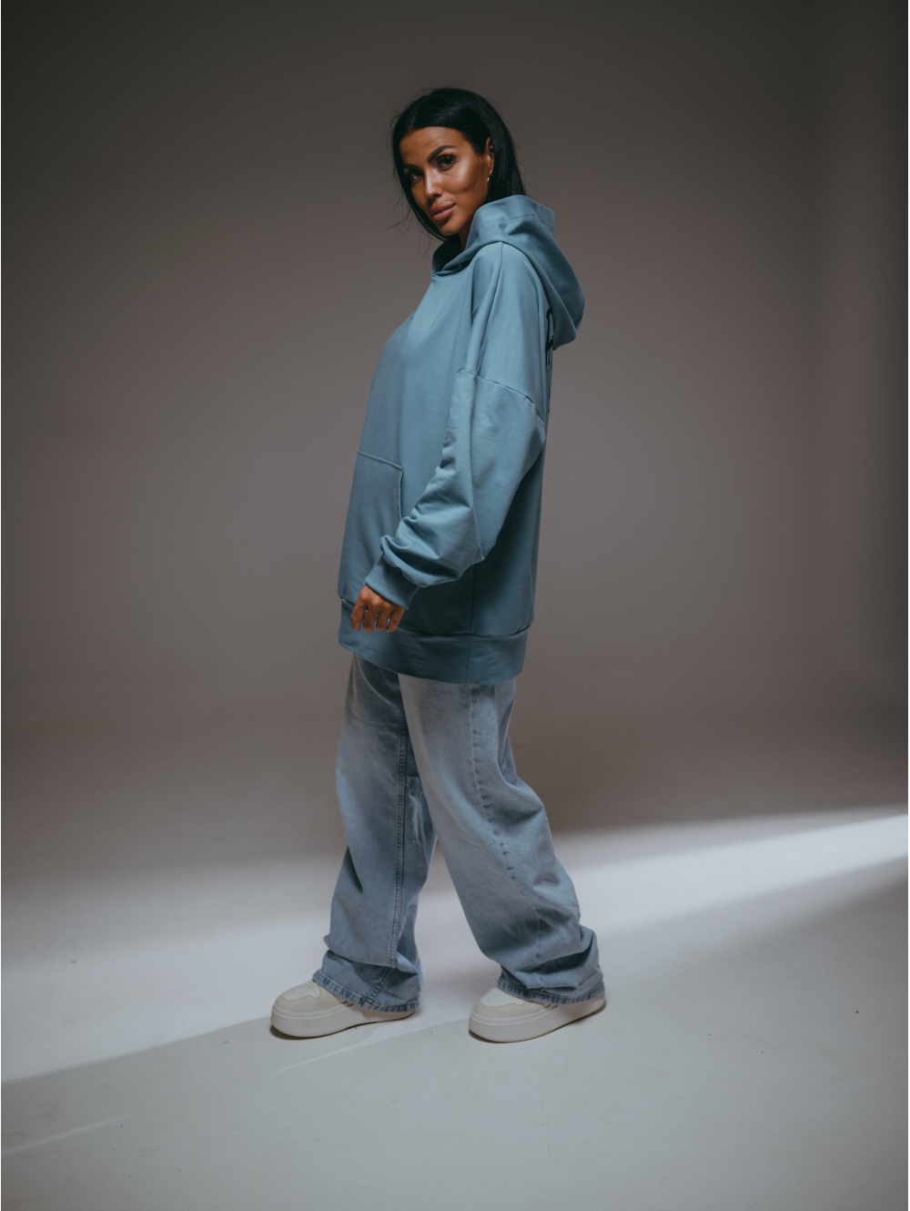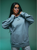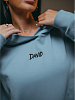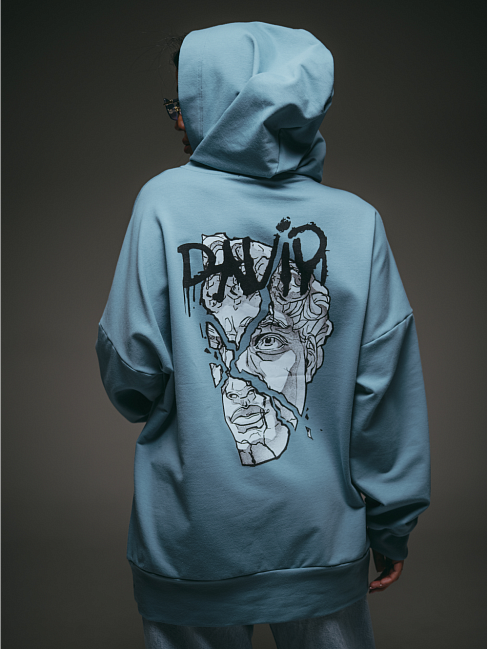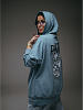 Худи дафна с капюшоном, свободного покроя с поясом по низу, со спущенным плечом и длинным втачным рукавом на манжете. Полочка с накладным карманом.