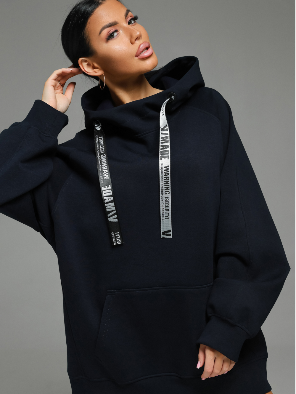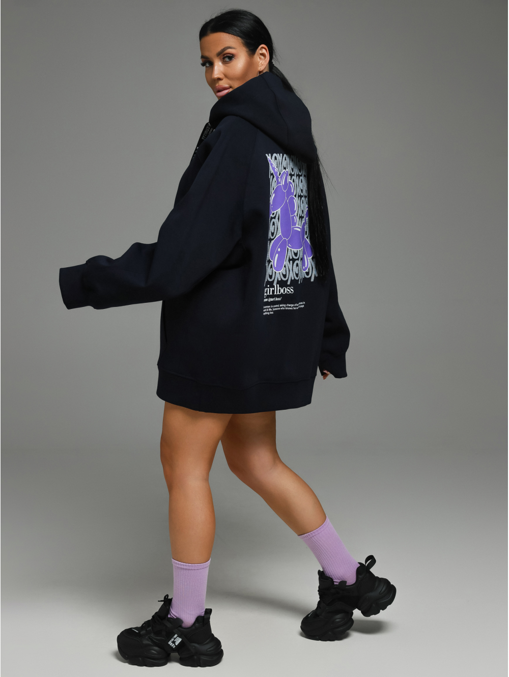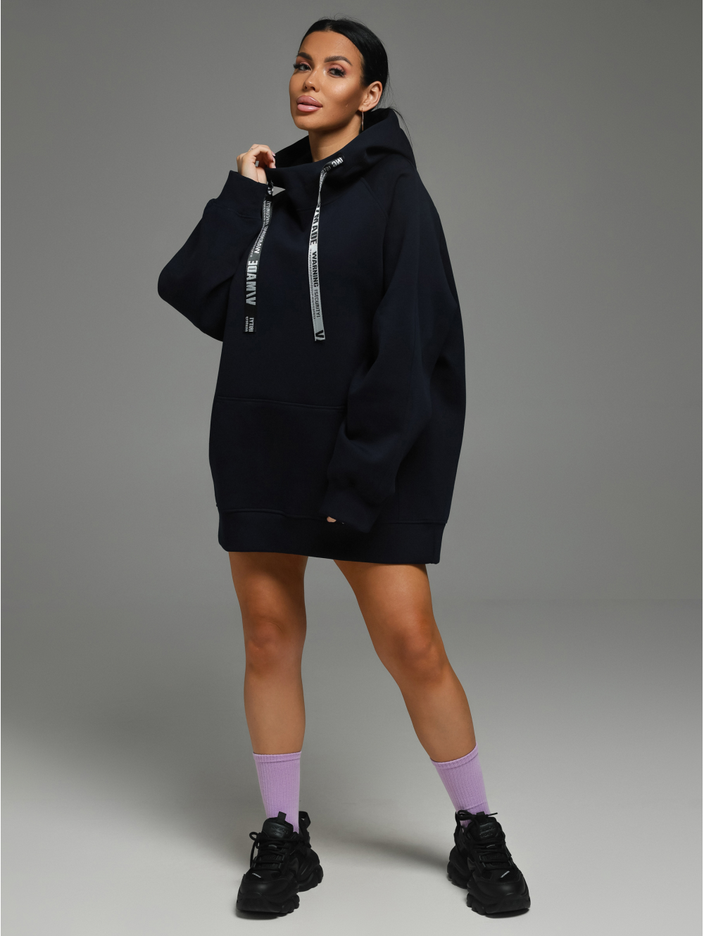 Худи Камелия – oversize кроя с капюшоном, с притачным поясом по низу, с длинным рукавом реглан на манжете. Полочка с накладным карманом с двумя наклонными входами, на спинке печать.