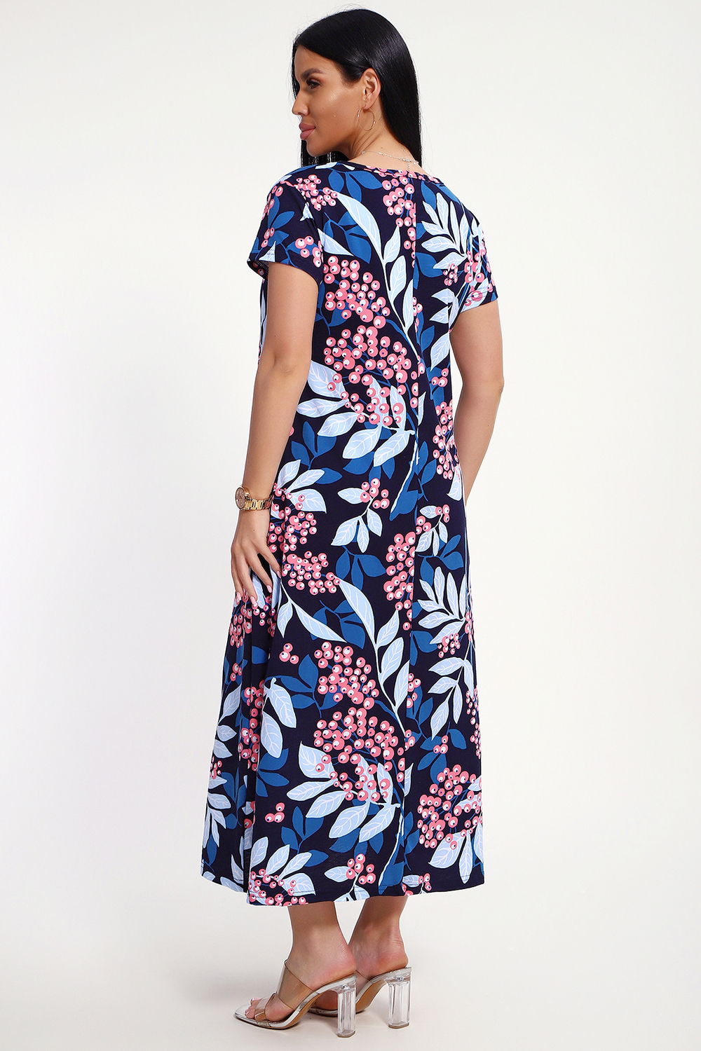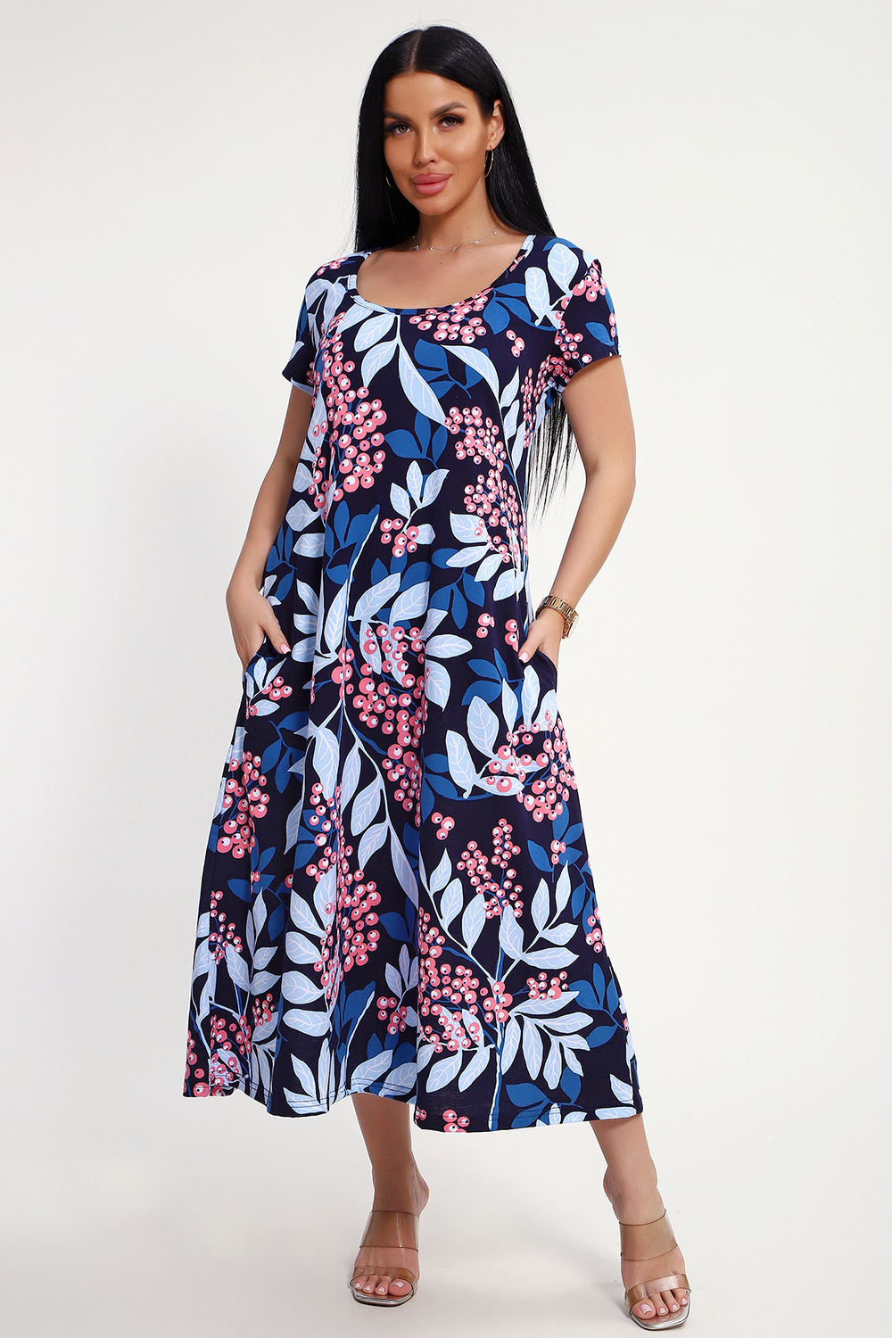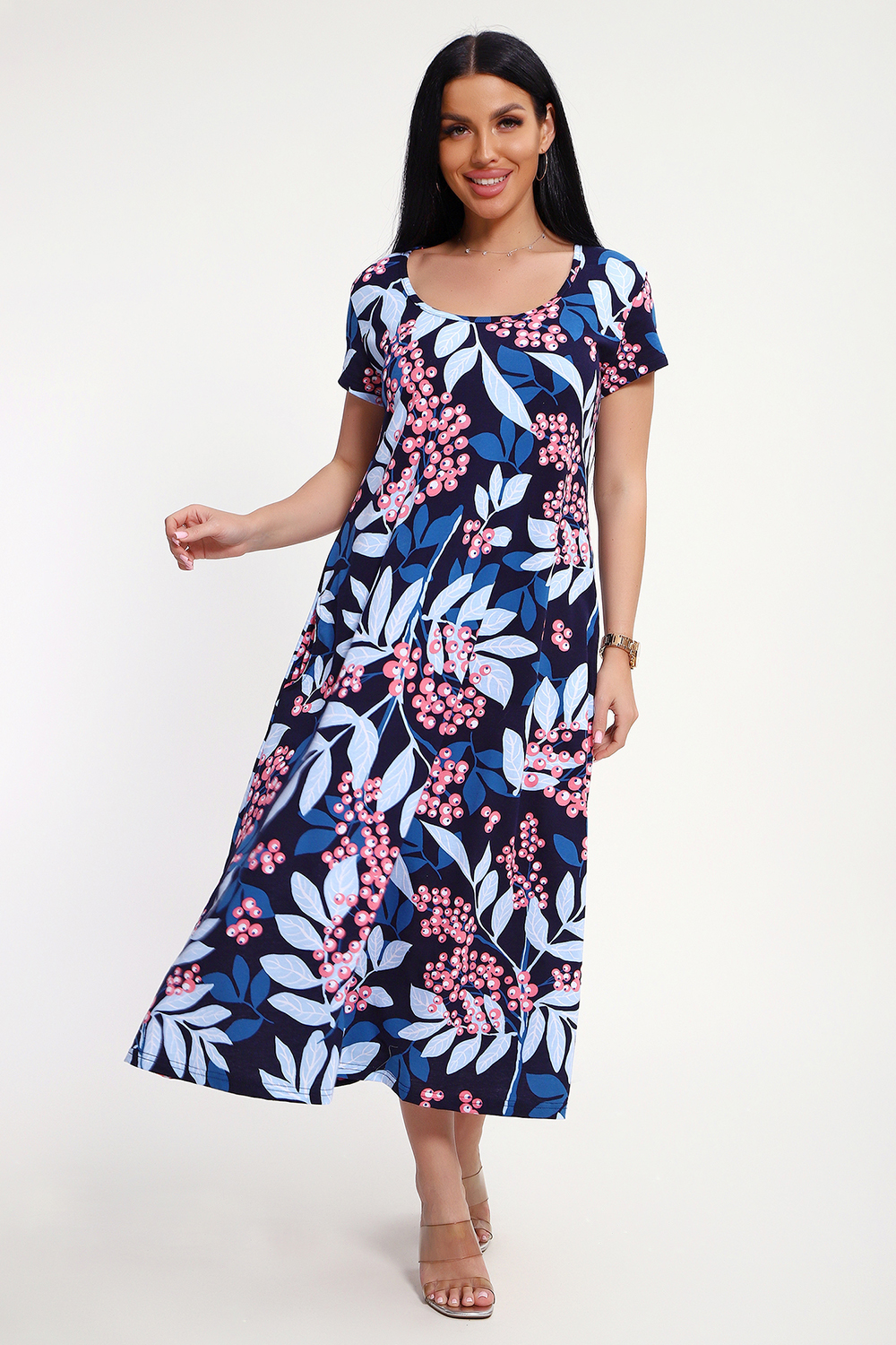 Свободный покрой создает комфортную атмосферу даже в жару. Легкая кулирная гладь обеспечивает мягкость и дышащую поверхность, идеально подходящую для повседневных прогулок. Яркие оттенки — синий, голубой, розовый. Продуманная детализация: классический фасон подчеркивает стройность фигуры. Длина - полноценное миди, подол расклешен, рукава втачные короткие, имеются боковые карманы.