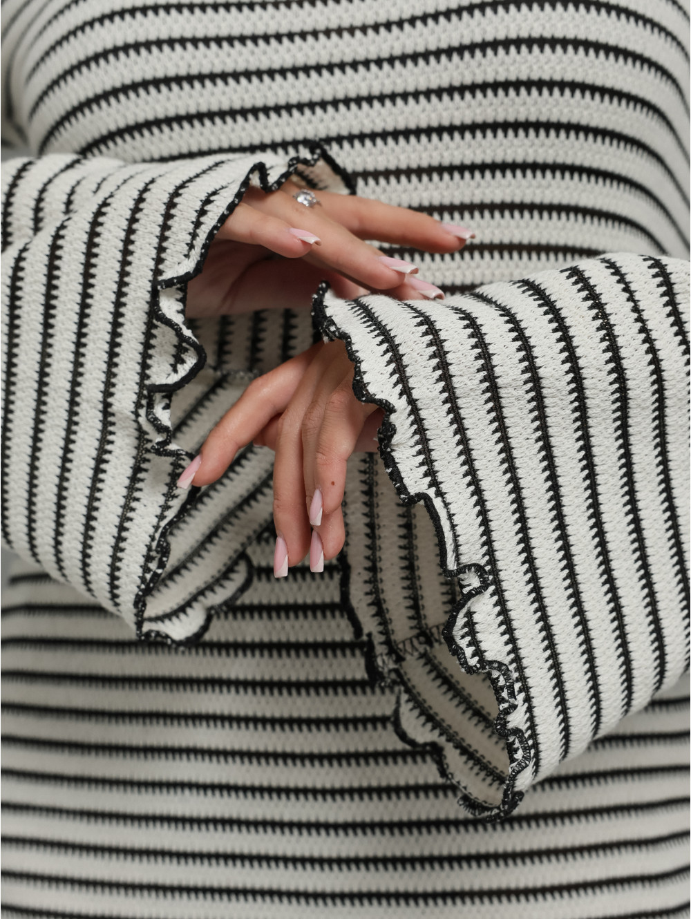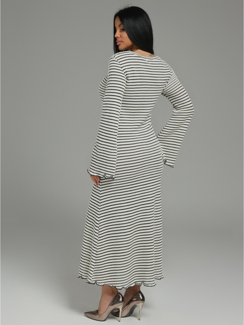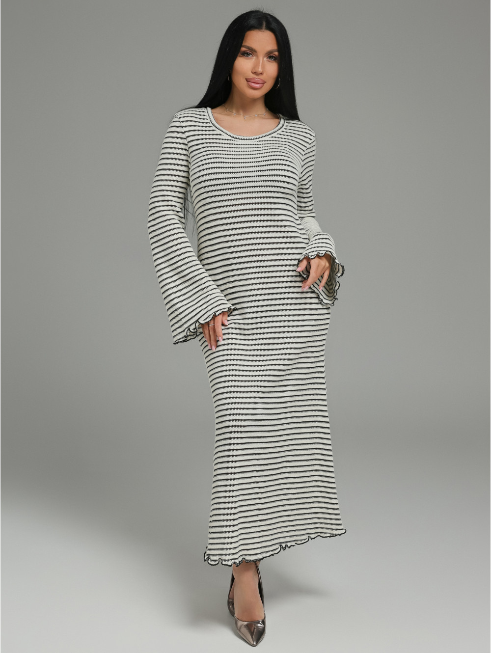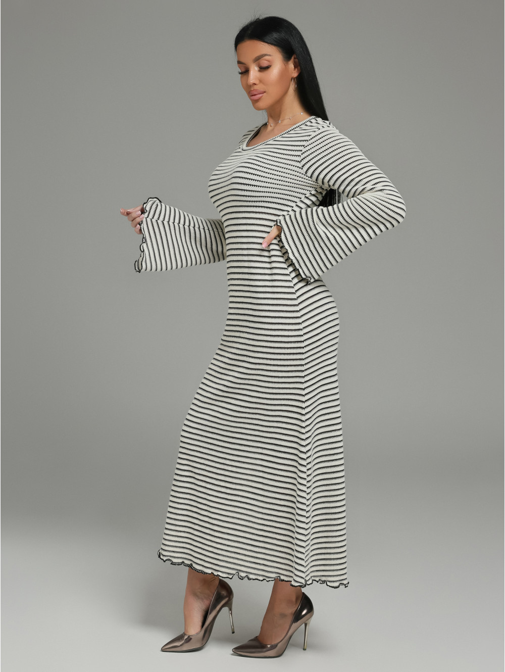 Женственный силуэт: Приталенный крой мягко облегает талию и плавно расклешивается к низу, создавая изящный и романтичный образ. Длинный расклешенный рукав добавляет динамики и элегантности.