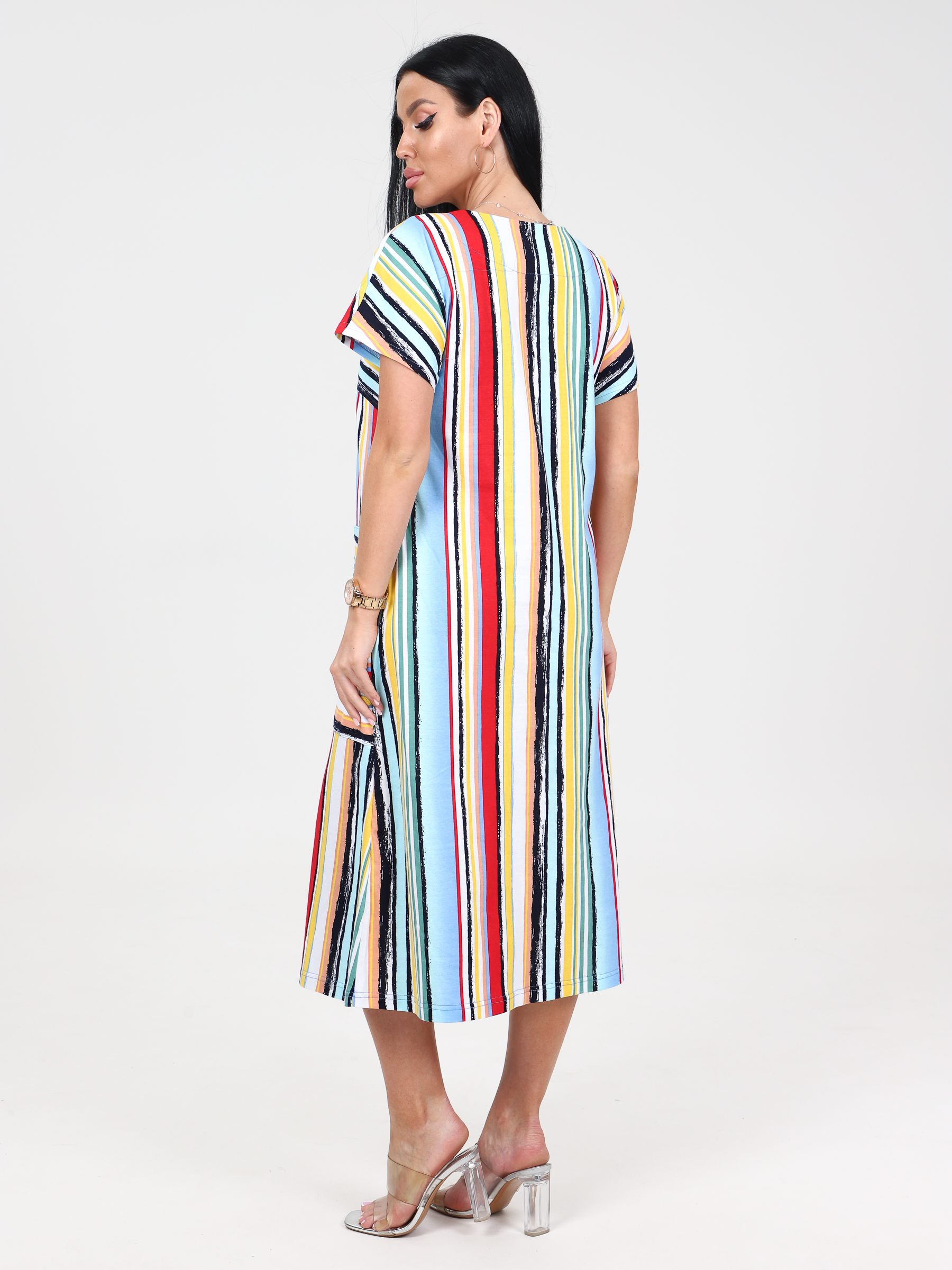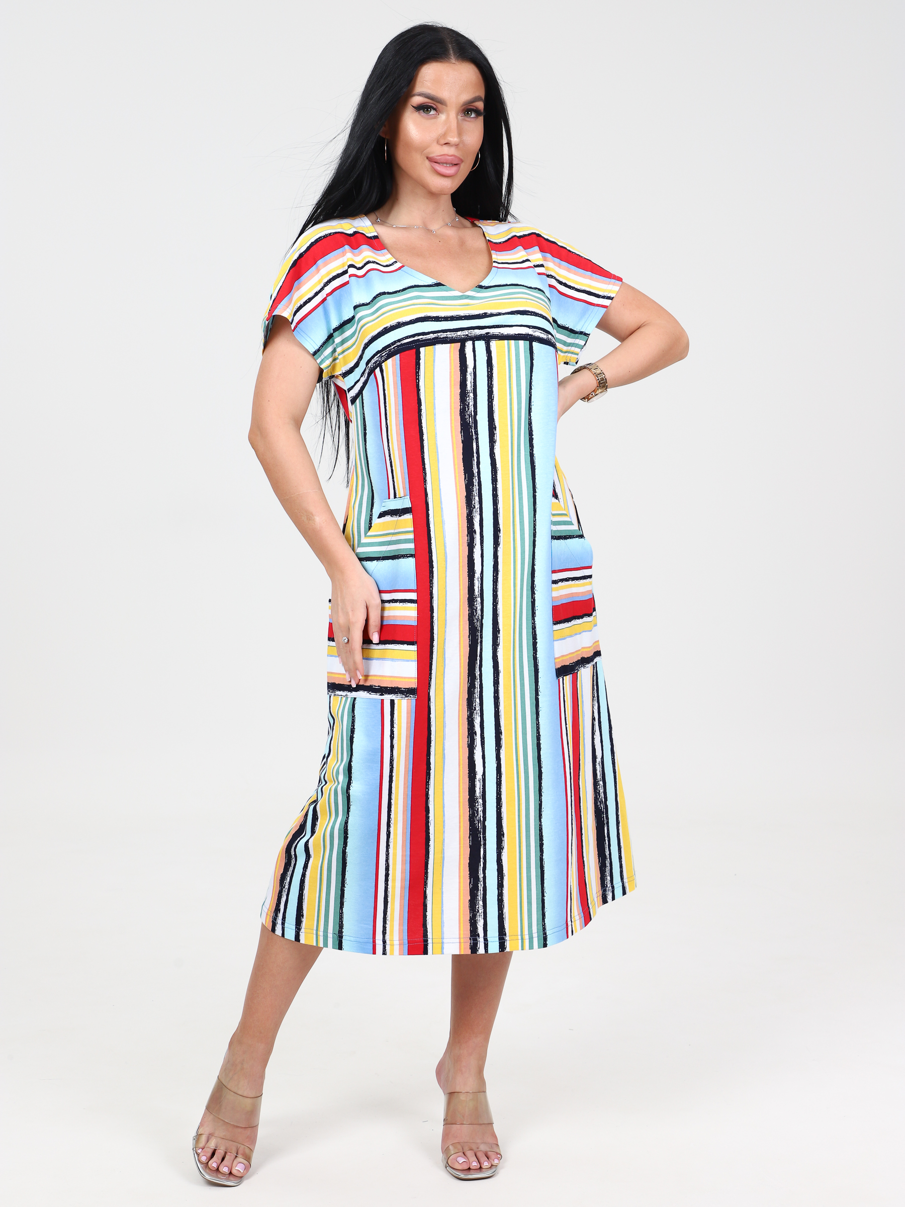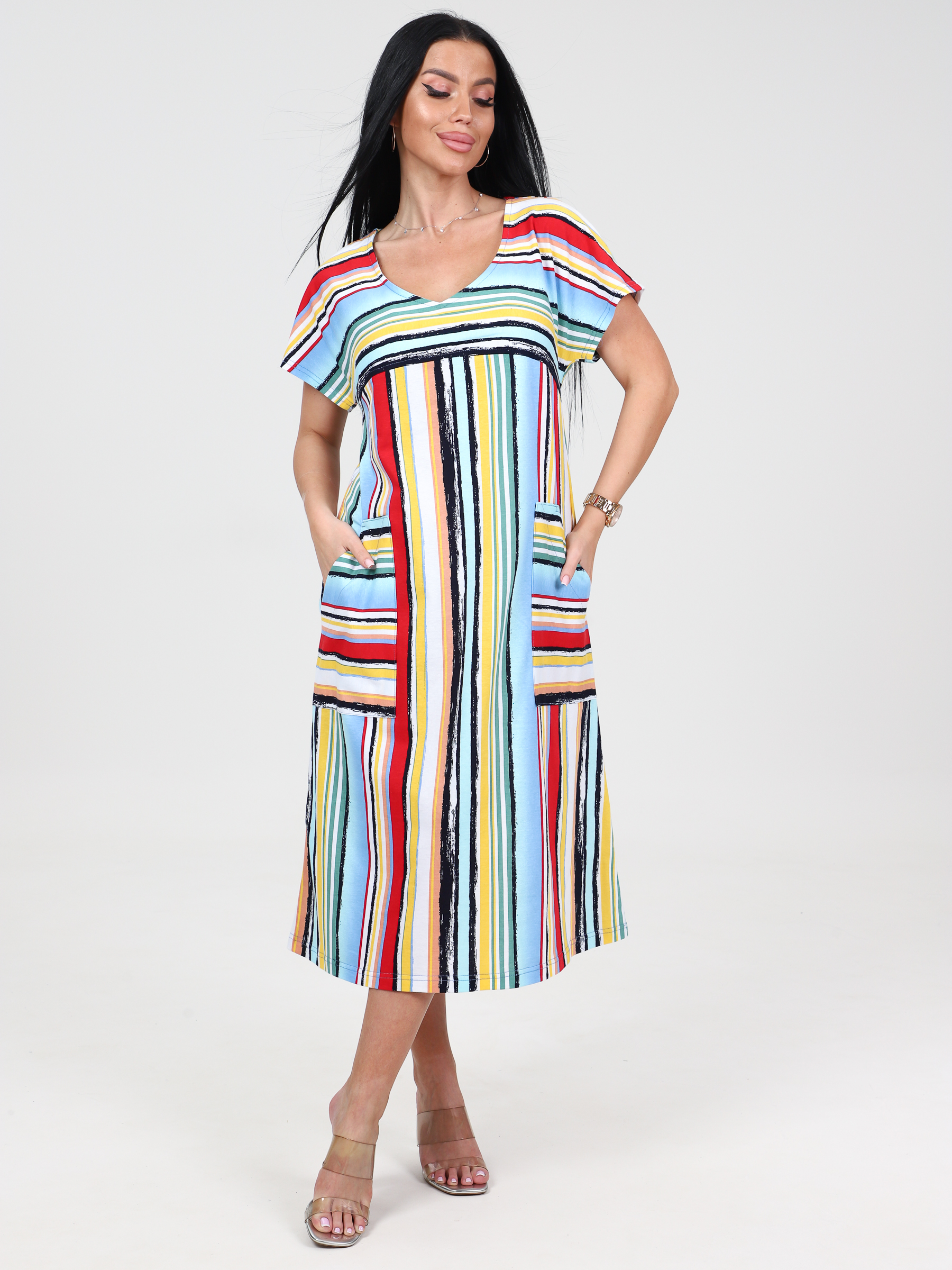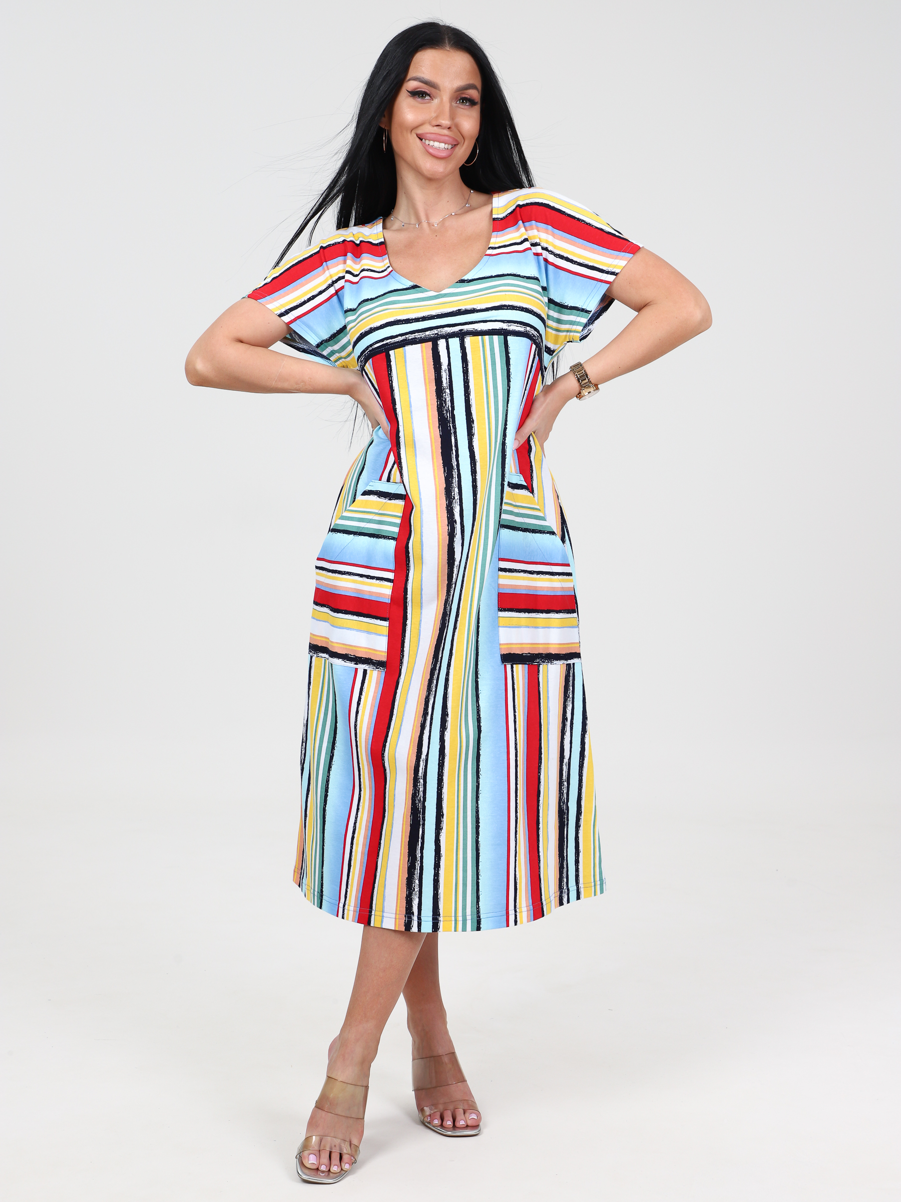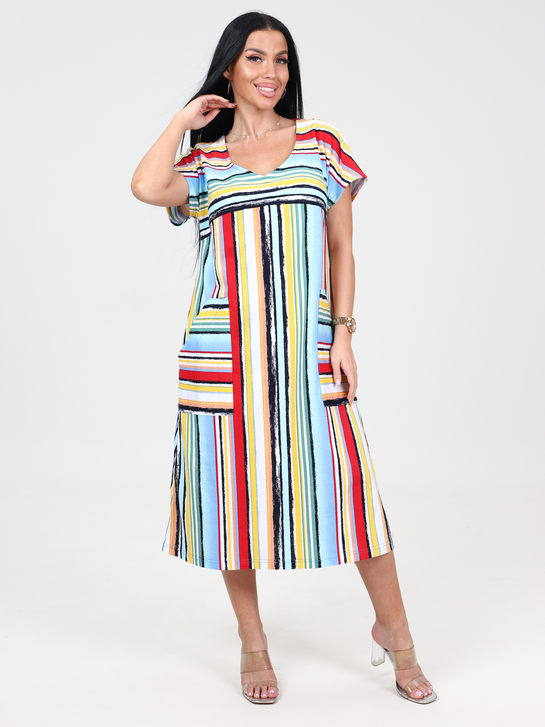 Платье трикотажное А-силуэта с отрезной кокеткой. Платье сшито из кулирки. Яркая расцветка привлекает внимание.