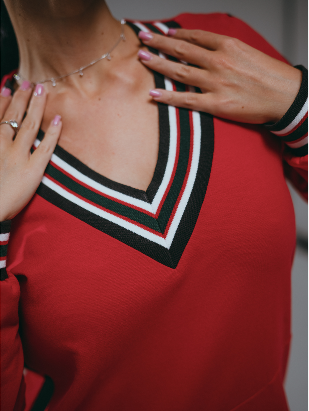 Элегантная деталь: Глубокий V-образный вырез горловины зрительно удлиняет шею, делая образ более утонченным. Аккуратная обработка обвязом подчеркивает линию горловины, сохраняя чистоту линий.
