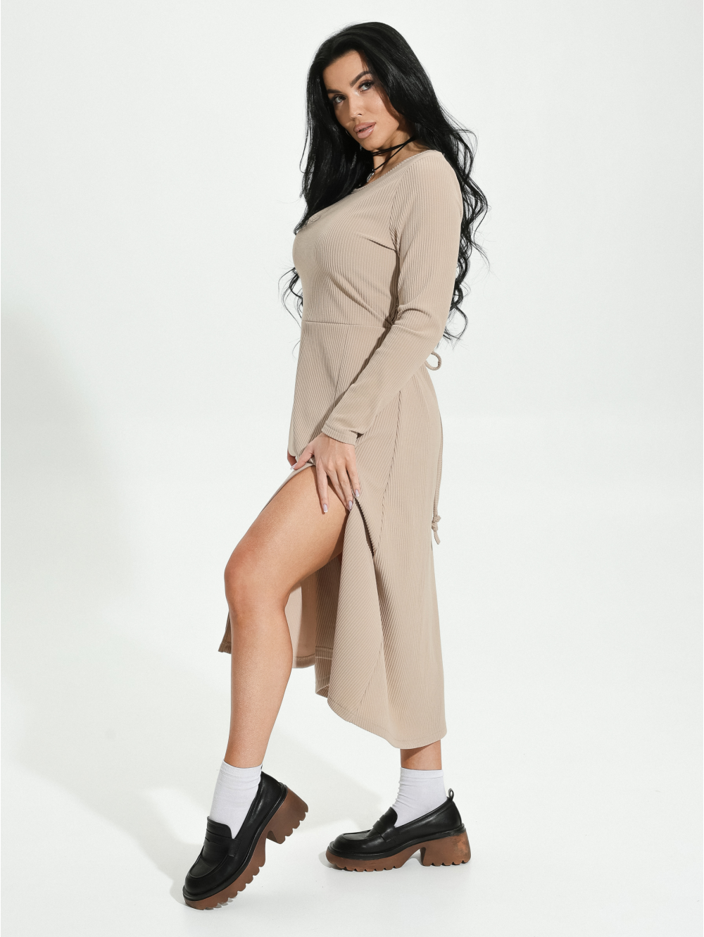 Платье Дейзи приталенное, с длинным втачным рукавом. Изделие на спинке регулируется завязками, выполненными из основной ткани. Разрез на бедре зрительно вытягивает и стройнит, выгодно подчеркивает красоту женских ног.