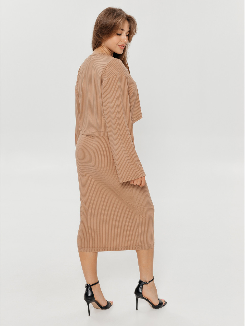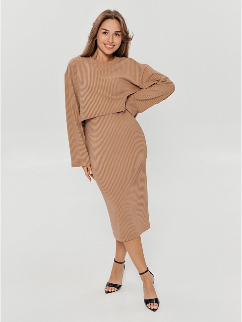 Женское платье Прима миди 2 в 1г. Это универсальный костюм, который должен быть в базовом гардеробе. Платье трикотажное лапша приталенное с V образным вырезом и коротким рукавом. Классическая длина чуть ниже колена и безупречная посадка модели футляра идеально подчеркнут Вашу фигуру, что позволит создать стройный силуэт. Джемпер укороченный свободный оверсайз (oversize) с длинными широкими рукавами типа "летучая мышь.