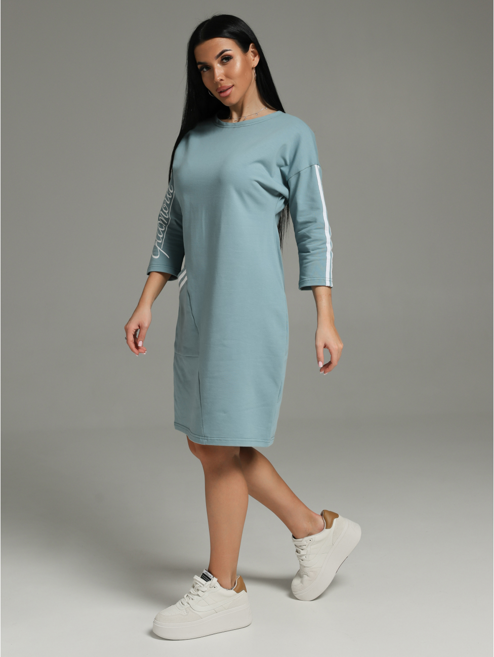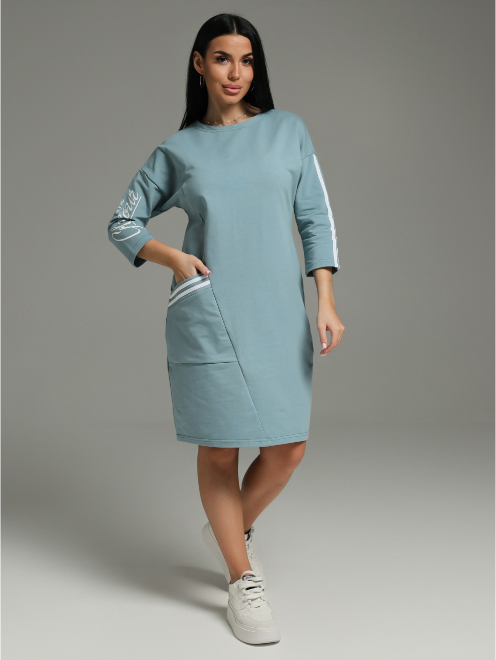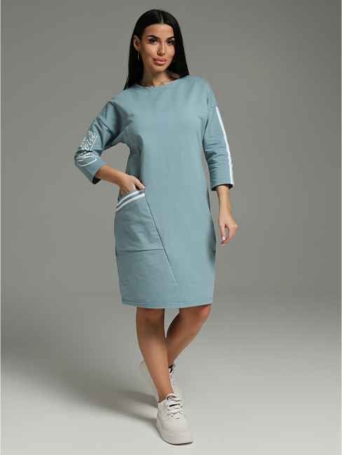 Спортивное платье Флоренс – сочетает в себе все качества, которые так важны современной леди. В нем легко, удобно и комфортно. Девушка выглядит стильно, женственно и модно. Платье со спущенной линией плеча и рукавом рубашечного покроя создает свободу движений. Это прекрасный вариант для прогулки, работы и приятного вечера. Стильным дополнением в нашем платье стали лампасы и печать. Платье спорт шик отлично сочетается с головными уборами: кепи, бейсболками В холодное время года к этому наряду можно добавить укороченную кожаную куртку или бомбер. Из аксессуаров часто используют различные ремни, кушаки или женские сумки на пояс. Для студенческой вечеринки образ можно дополнить браслетами и серьгами геометрической формы.