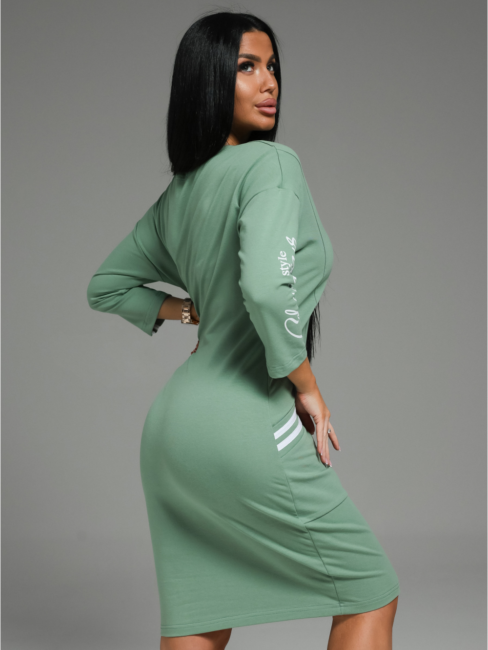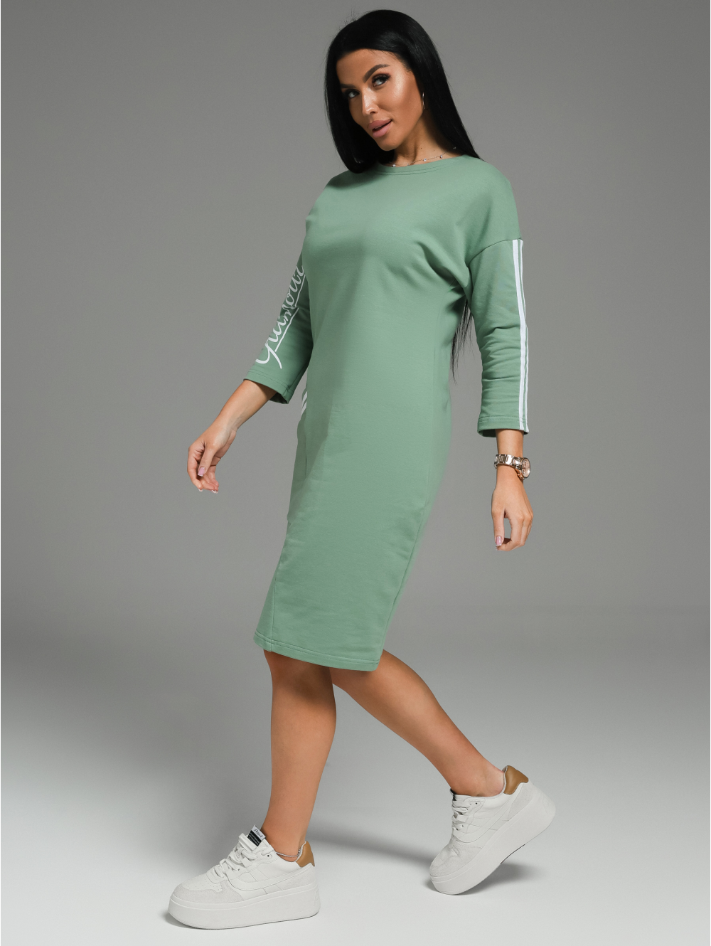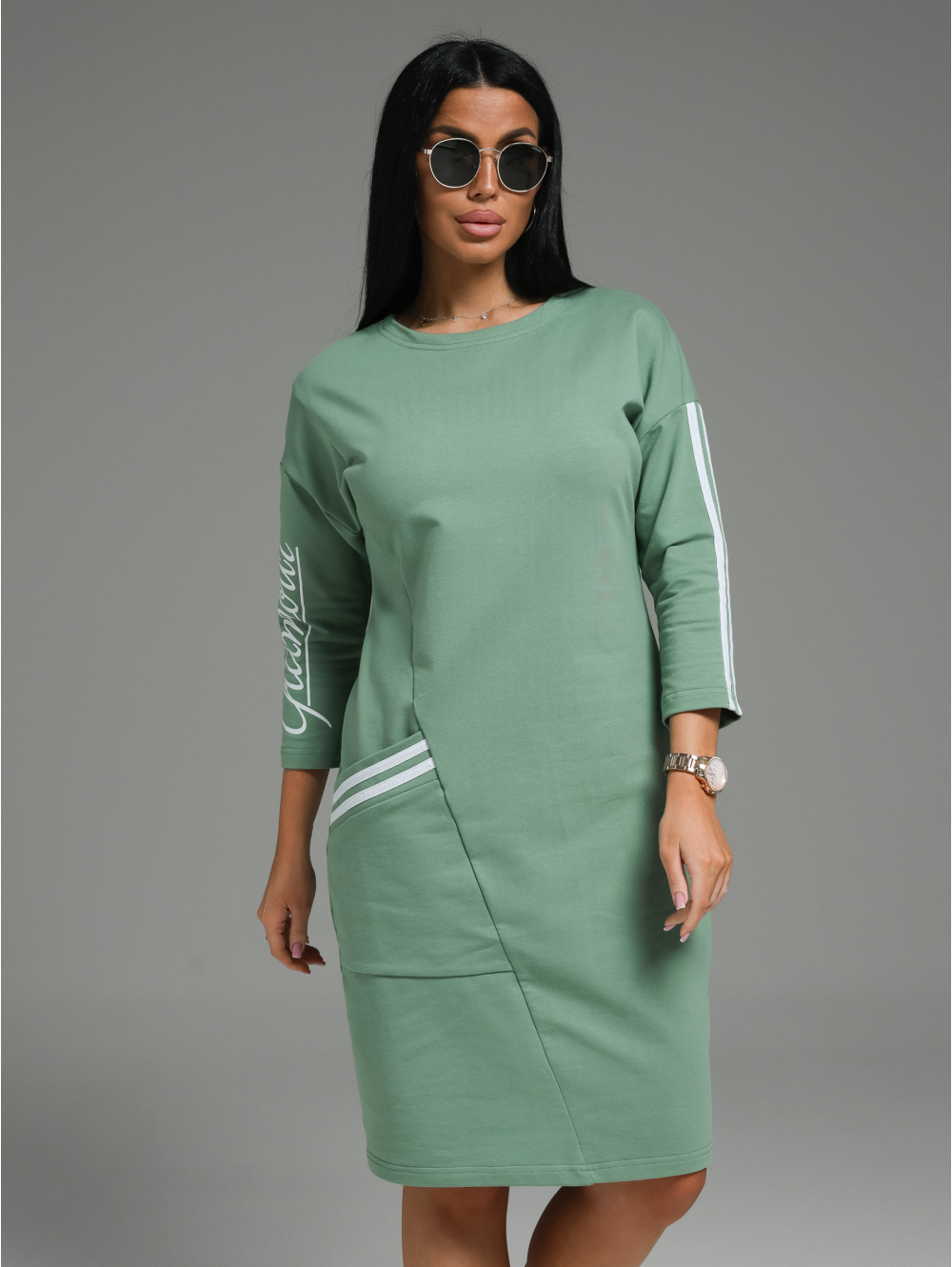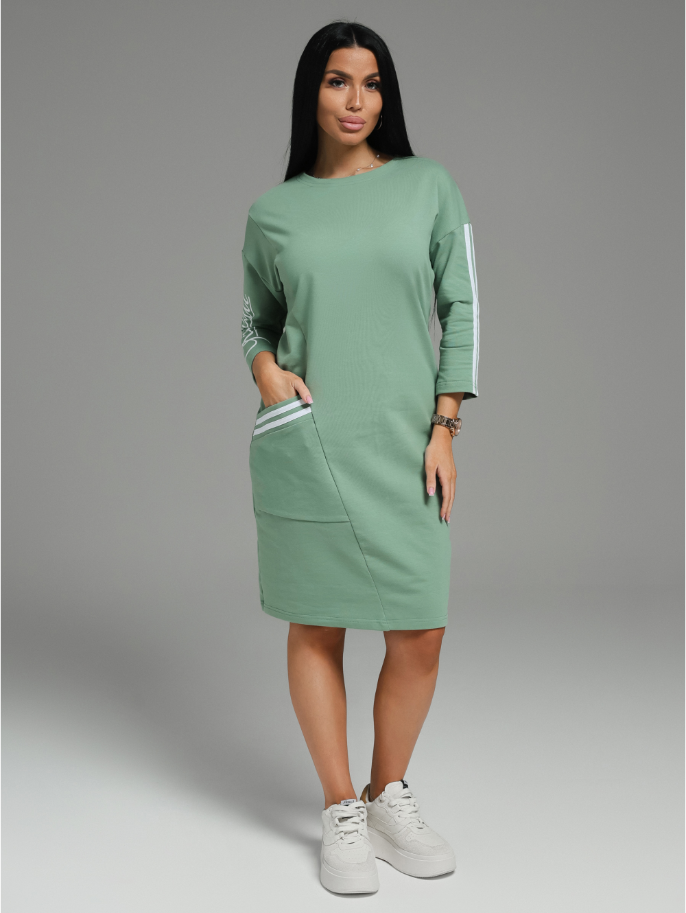 Спортивное платье Флоренс – сочетает в себе все качества, которые так важны современной леди. В нем легко, удобно и комфортно. Девушка выглядит стильно, женственно и модно. Платье со спущенной линией плеча и рукавом рубашечного покроя создает свободу движений. Это прекрасный вариант для прогулки, работы и приятного вечера. Стильным дополнением в нашем платье стали лампасы и печать. Платье спорт шик отлично сочетается с головными уборами: кепи, бейсболками В холодное время года к этому наряду можно добавить укороченную кожаную куртку или бомбер. Из аксессуаров часто используют различные ремни, кушаки или женские сумки на пояс. Для студенческой вечеринки образ можно дополнить браслетами и серьгами геометрической формы.