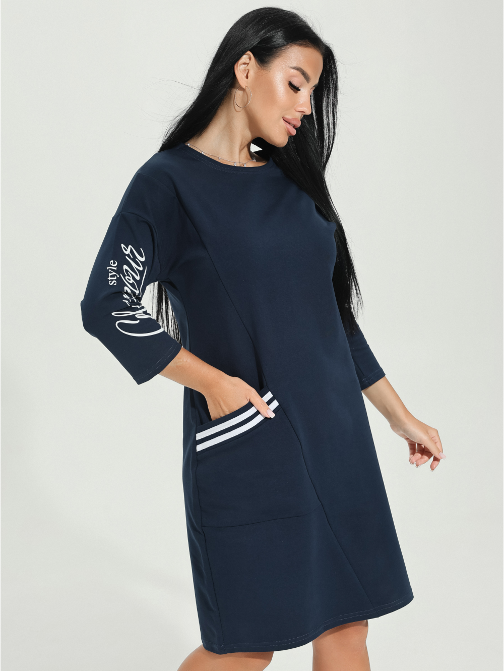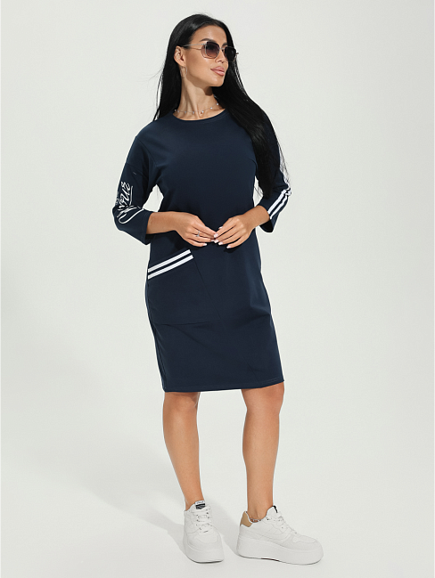 Спортивное платье Флоренс – сочетает в себе все качества, которые так важны современной леди. В нем легко, удобно и комфортно. Девушка выглядит стильно, женственно и модно. Платье со спущенной линией плеча и рукавом рубашечного покроя создает свободу движений. Это прекрасный вариант для прогулки, работы и приятного вечера. Стильным дополнением в нашем платье стали лампасы и печать. Платье спорт шик отлично сочетается с головными уборами: кепи, бейсболками В холодное время года к этому наряду можно добавить укороченную кожаную куртку или бомбер. Из аксессуаров часто используют различные ремни, кушаки или женские сумки на пояс. Для студенческой вечеринки образ можно дополнить браслетами и серьгами геометрической формы.