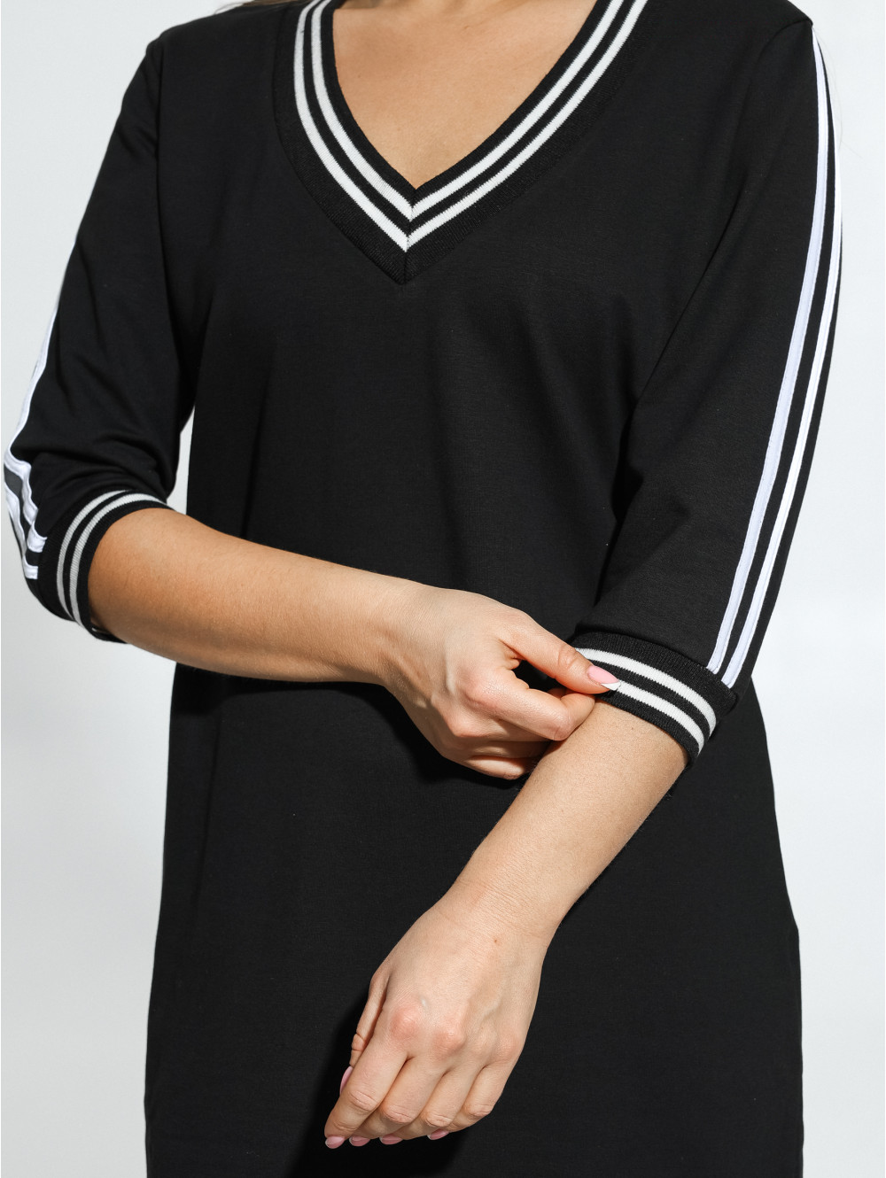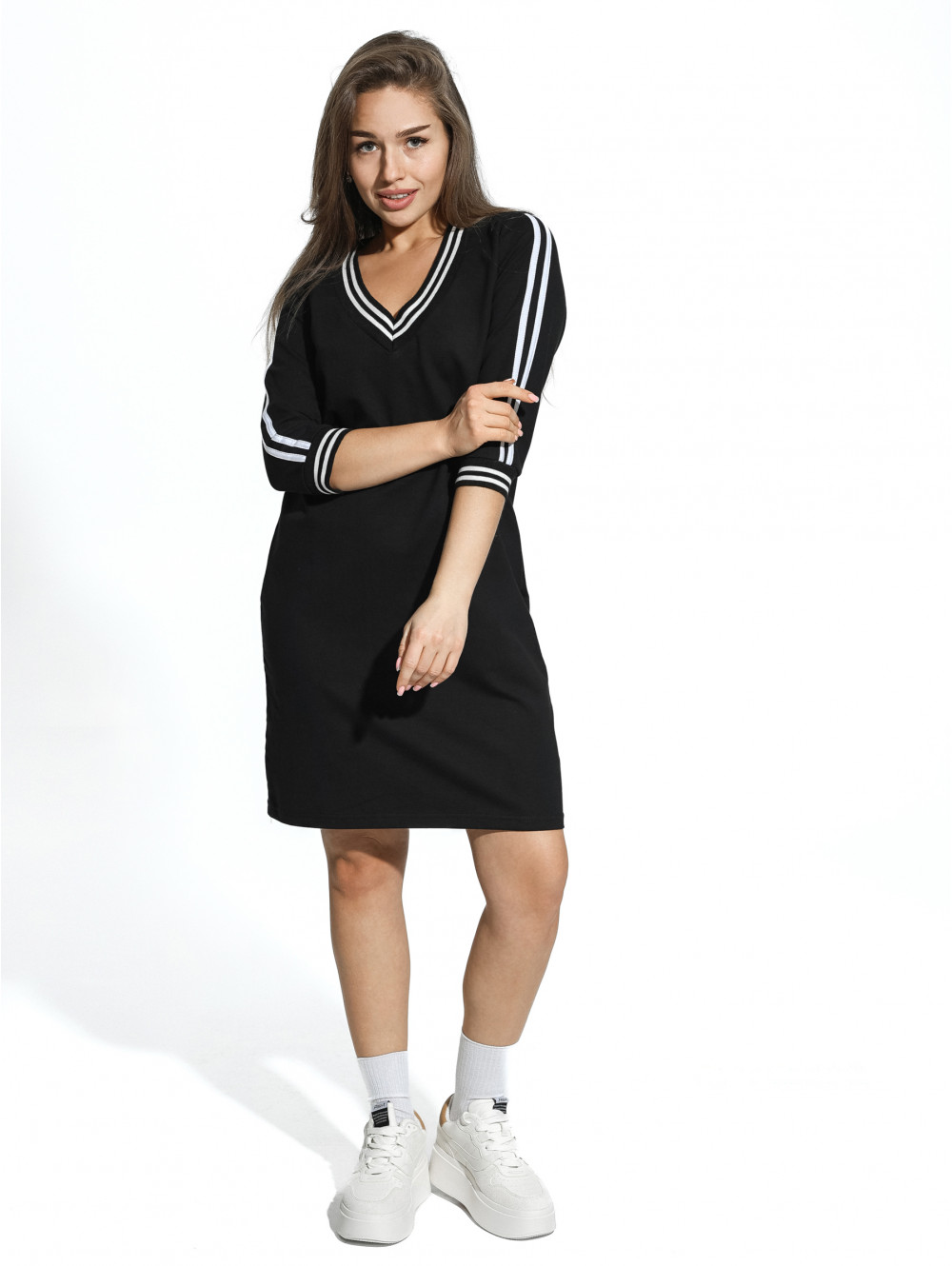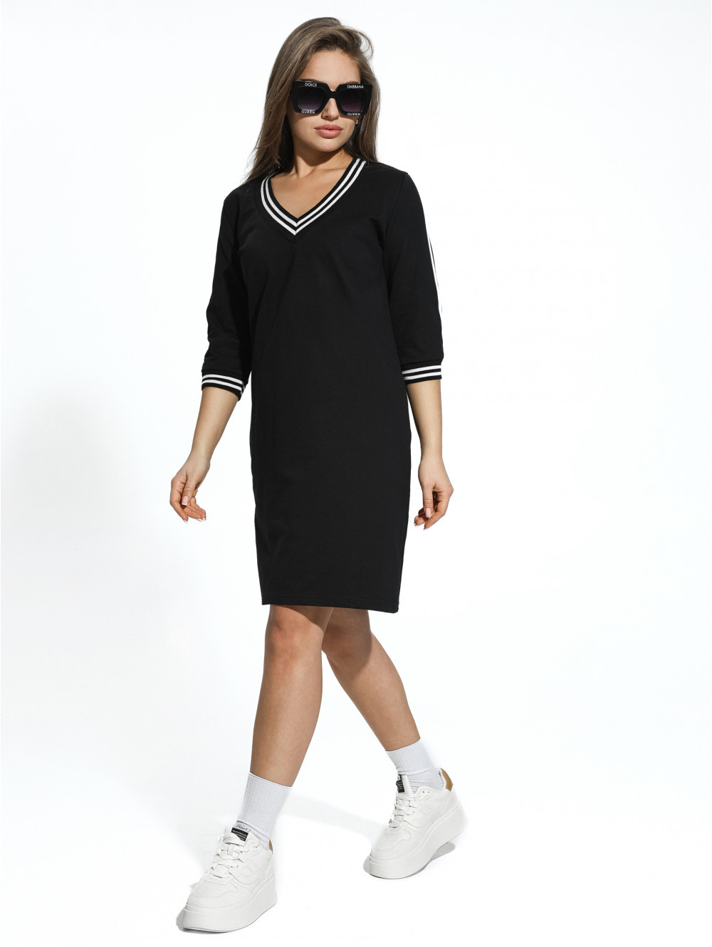 Повседневное женское платье Гламур спортивного типа выполнено из футера двунитки. Обработка манжет и горловины защищает края от деформации. Широкий V-образный вырез визуально удлиняет шею, а контрастная лента на горловине и рукавах привлекает внимание к лицу и зоне декольте. Полотно отлично впитывает влагу, дышит, не электризуется и мало мнётся. Благодаря лайкре в составе, оно хорошо растягивается и также легко возвращает форму. Длина оптимальная, как для активного отдыха, так и для спокойных прогулок, мероприятий и даже свиданий. В таком платье вашей коже будет комфортно, как в летний период, так и в холодное время года, дополнив стильное платье теплым кардиганом.