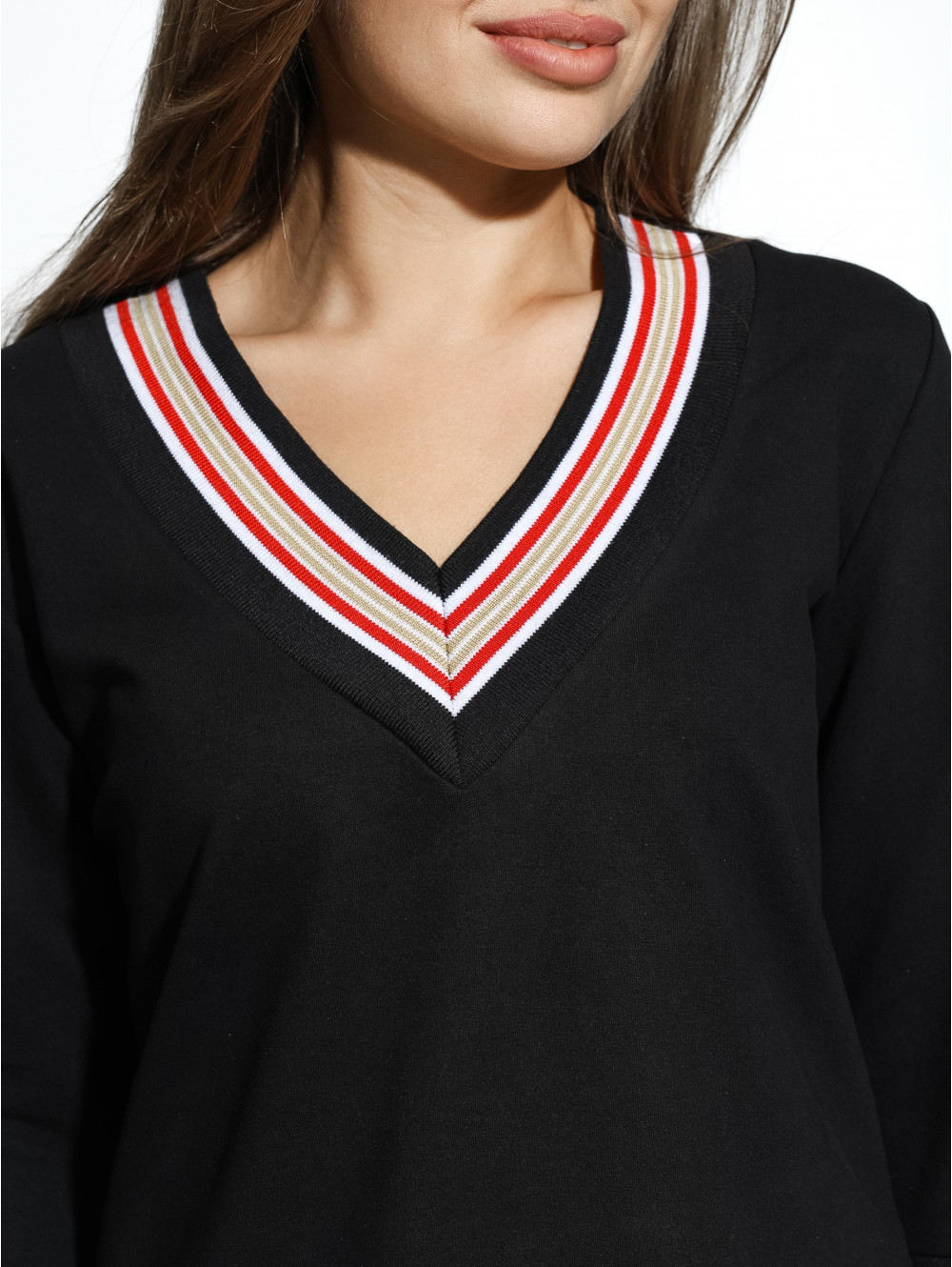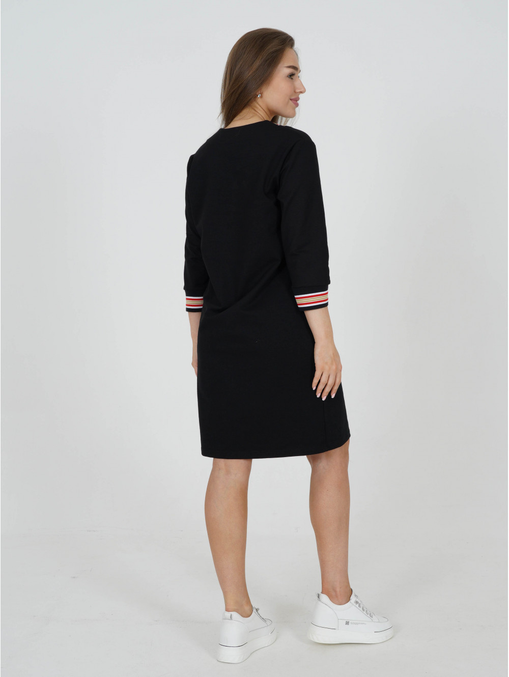 Повседневное женское платье Гламур спортивного типа выполнено из футера двунитки. Обработка манжет и горловины защищает края от деформации. Широкий V-образный вырез визуально удлиняет шею, а контрастная лента на горловине и рукавах привлекает внимание к лицу и зоне декольте. Полотно отлично впитывает влагу, дышит, не электризуется и мало мнётся. Благодаря лайкре в составе, оно хорошо растягивается и также легко возвращает форму. Длина оптимальная, как для активного отдыха, так и для спокойных прогулок, мероприятий и даже свиданий. В таком платье вашей коже будет комфортно, как в летний период, так и в холодное время года, дополнив стильное платье теплым кардиганом.