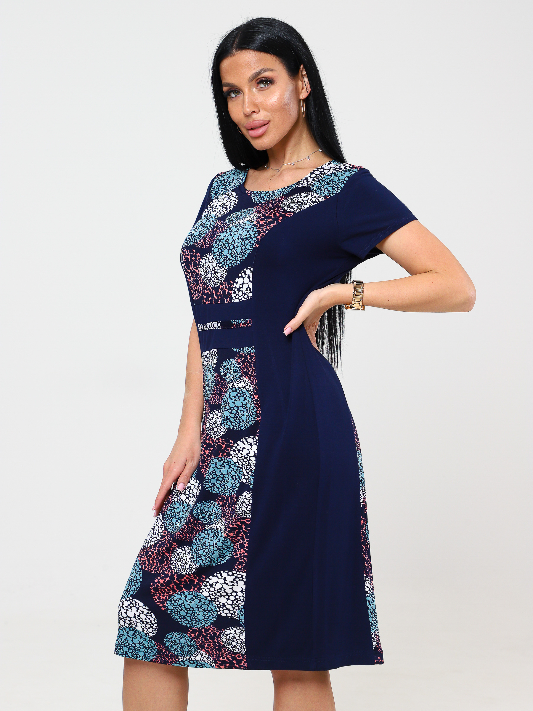 Платье трикотажное, комбинированное, из смешанных волокон, приталенное. Длина по спинке - 92 см. Это платье, которое скроет недостатки и подчеркнет Ваши достоинства! Платье сшито из мягкой, приятной к телу ткани, носить его одно удовольствие. Купив это платье Вы не только порадуете себя обновкой, но и практично вложите свои средства, т.к. данную модель можно одеть на работу, пойти в нем на деловую встречу, прогулку, в ресторан или кафе.