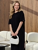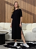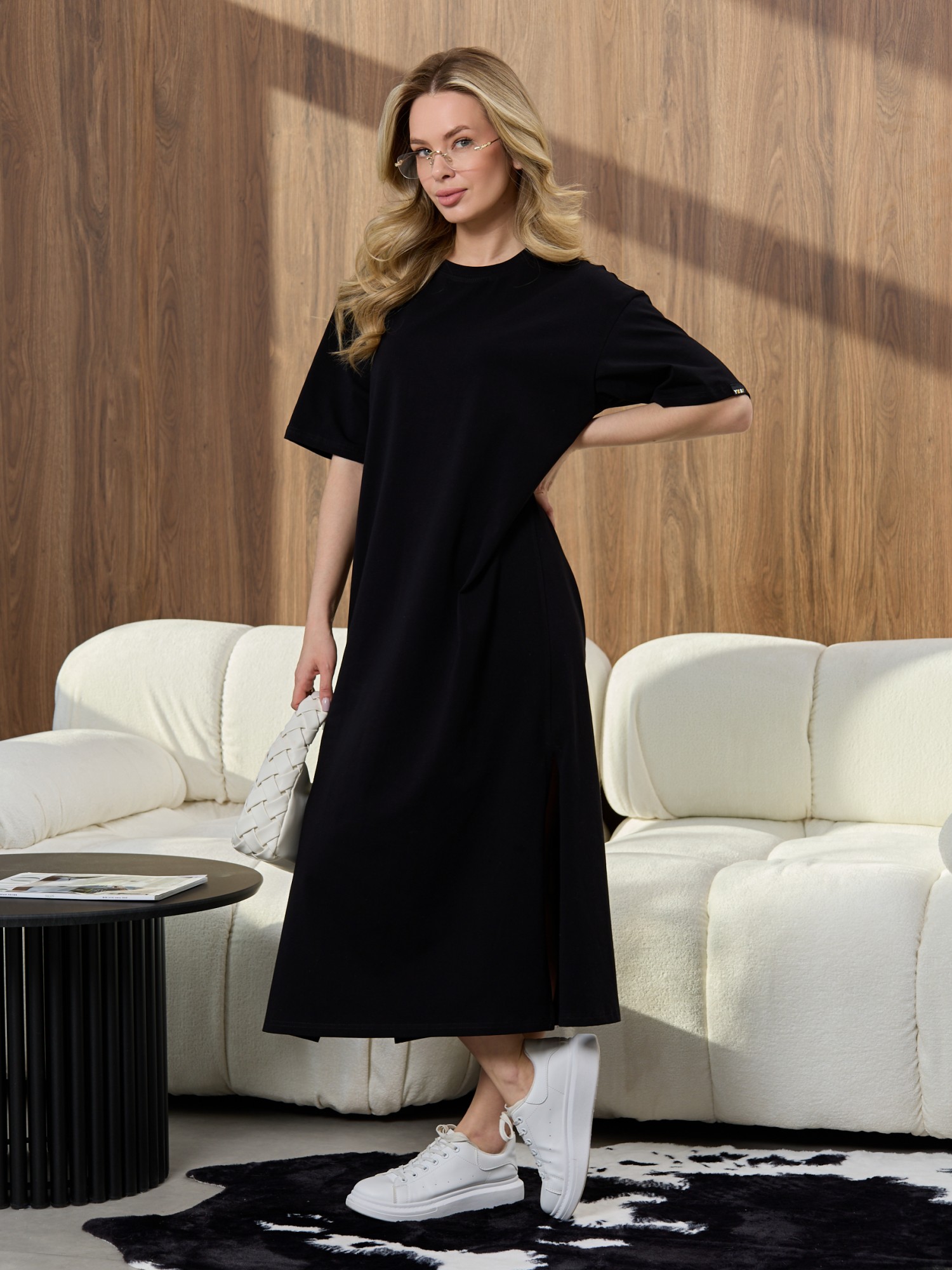 Туника женская из гладкокрашеного трикотажного полотна «кулирка» с лайкрой, прямого силуэта, со спущенной линией плеча, короткими втачными рукавами, горловиной овальной формы, обработанной втачной планкой из основного материала, с разрезами в боковых швах. Левый рукав дополнен декоративным элементом.