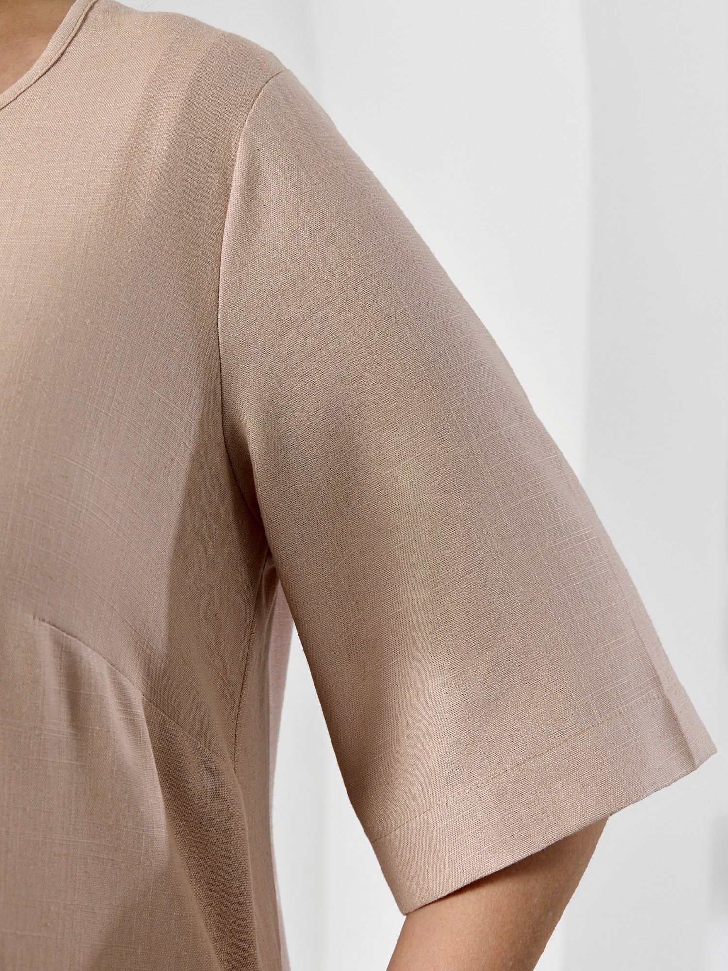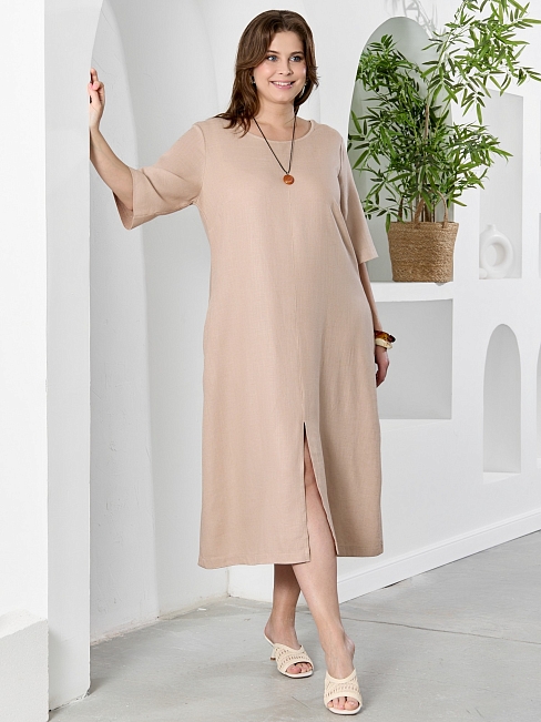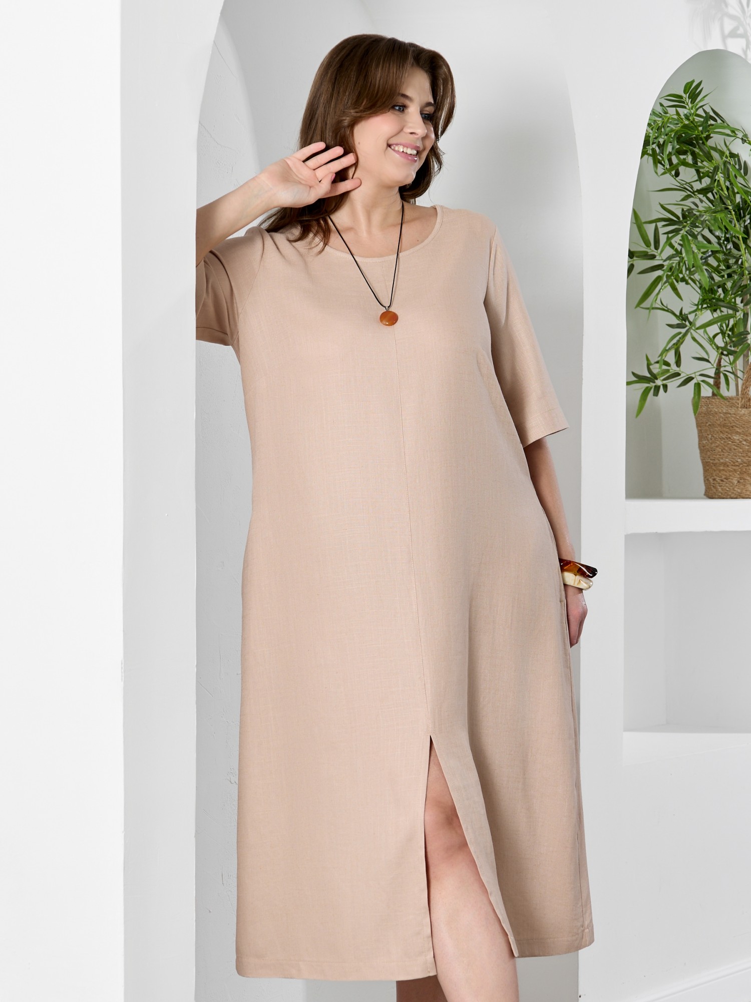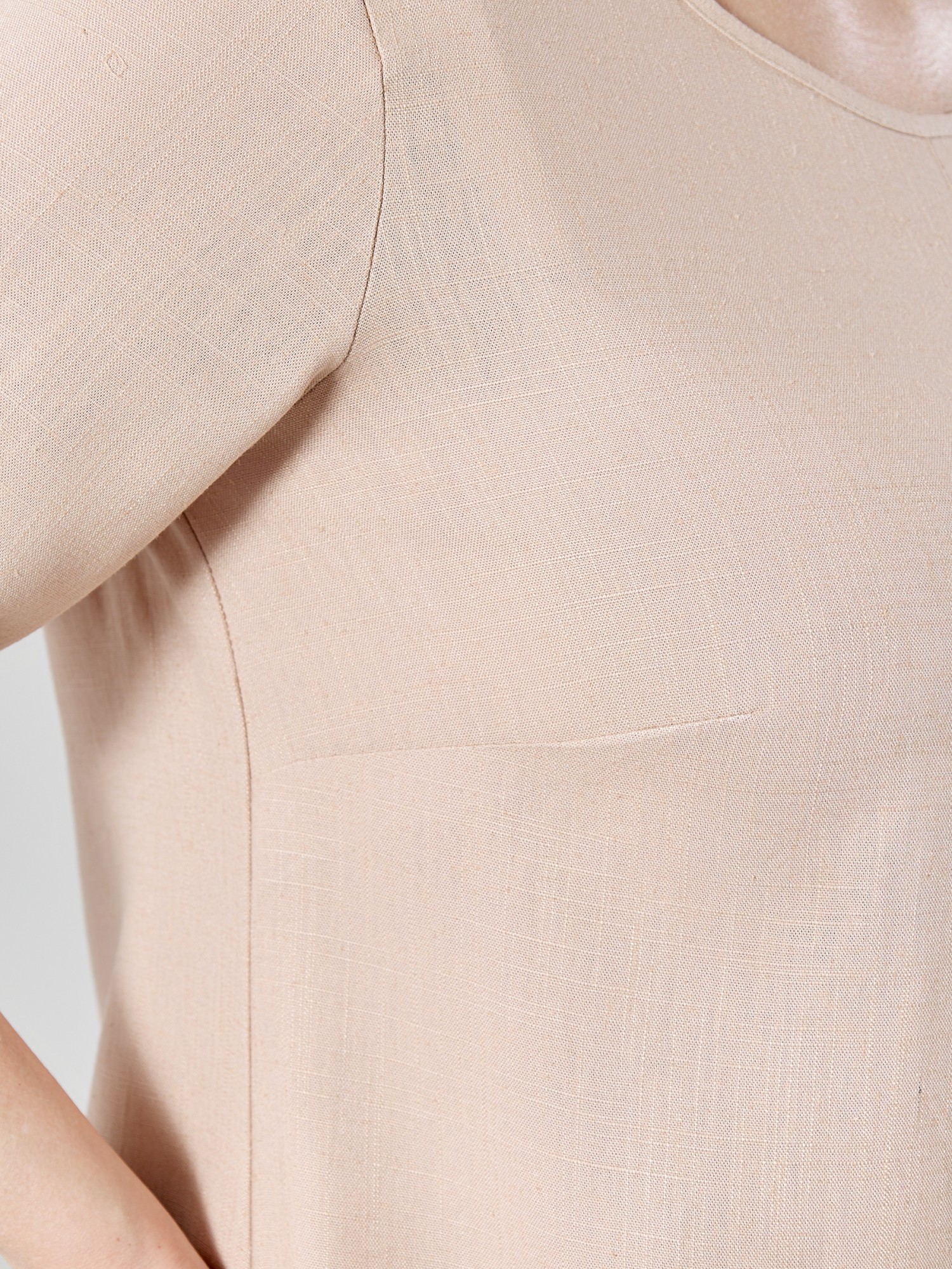 Платье женское из гладкокрашеного тканого полотна, свободное, слегка расширенное к низу, с горловиной овальной формы, короткими втачными рукавами, вытачками в области груди, карманами в боковых швах. Перед состоит из двух частей, в шве соединения деталей по центру разрез, горловина окантована основным материалом.
