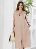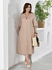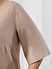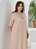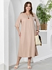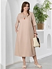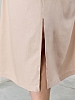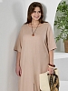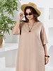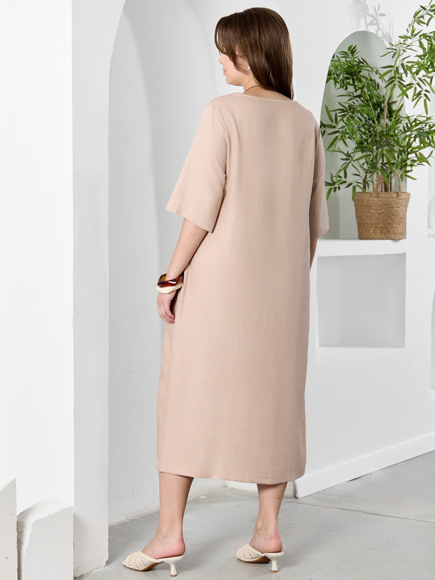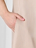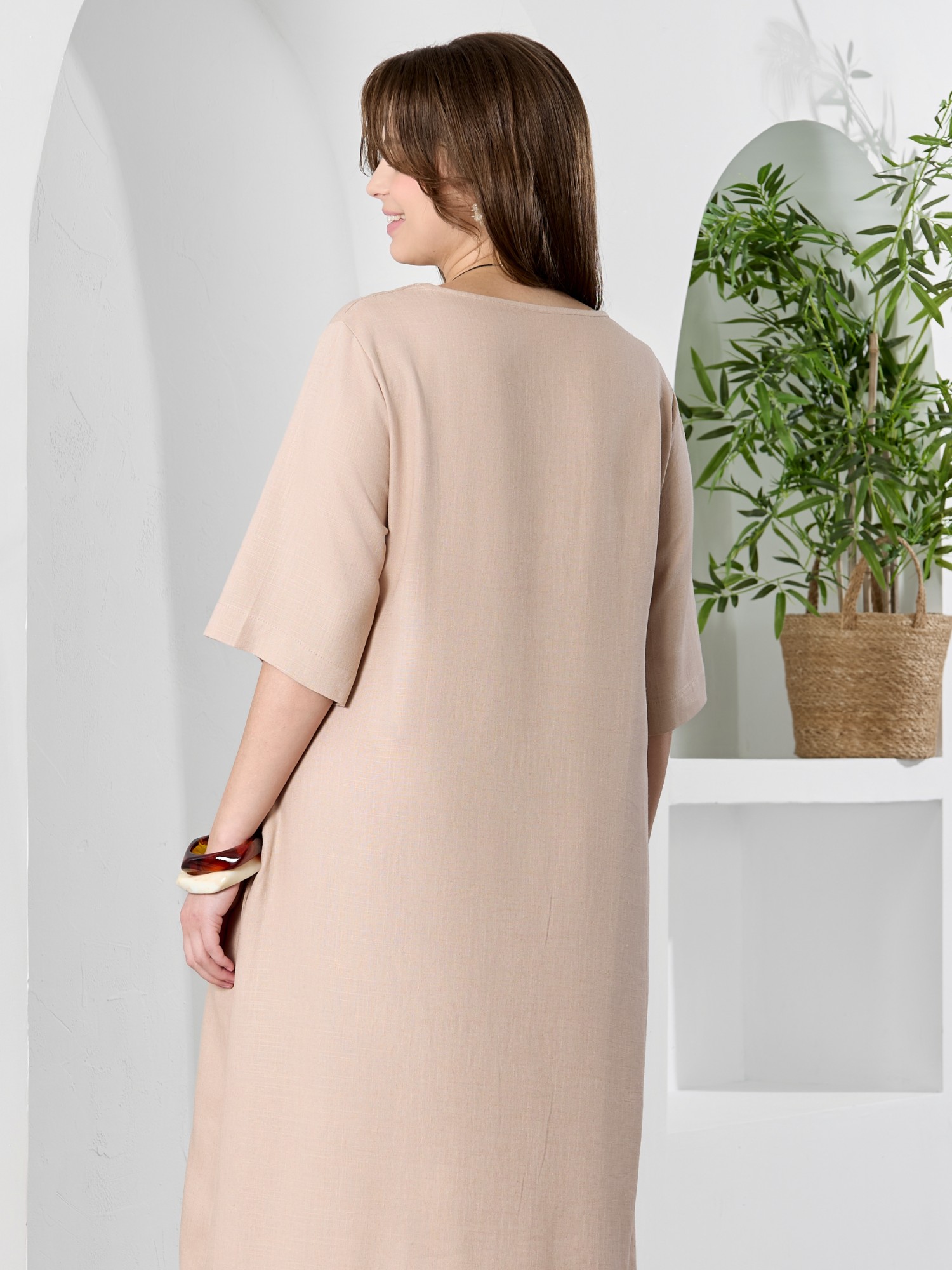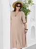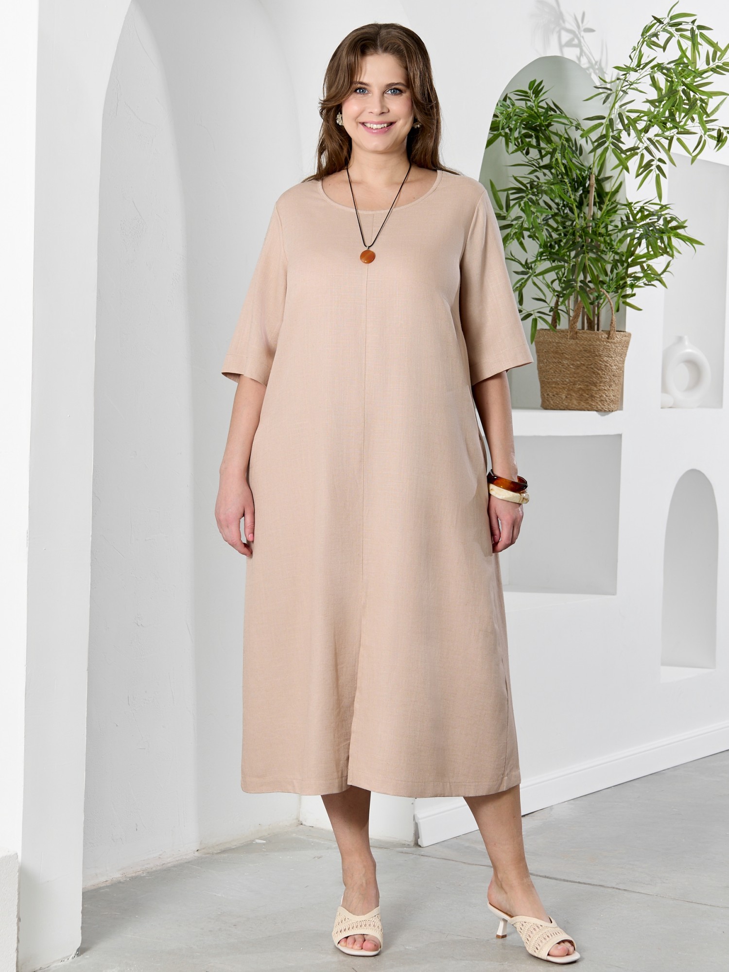 Платье женское из гладкокрашеного тканого полотна, свободное, слегка расширенное к низу, с горловиной овальной формы, короткими втачными рукавами, вытачками в области груди, карманами в боковых швах. Перед состоит из двух частей, в шве соединения деталей по центру разрез, горловина окантована основным материалом.