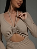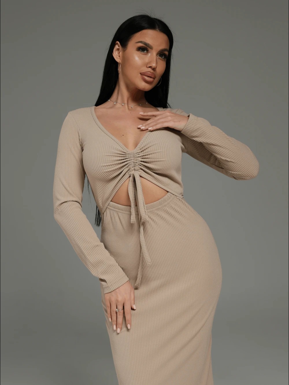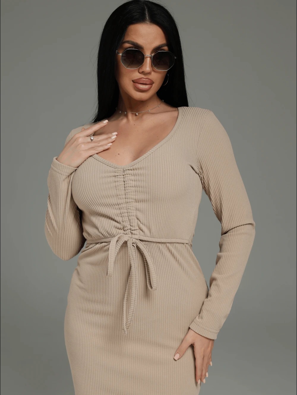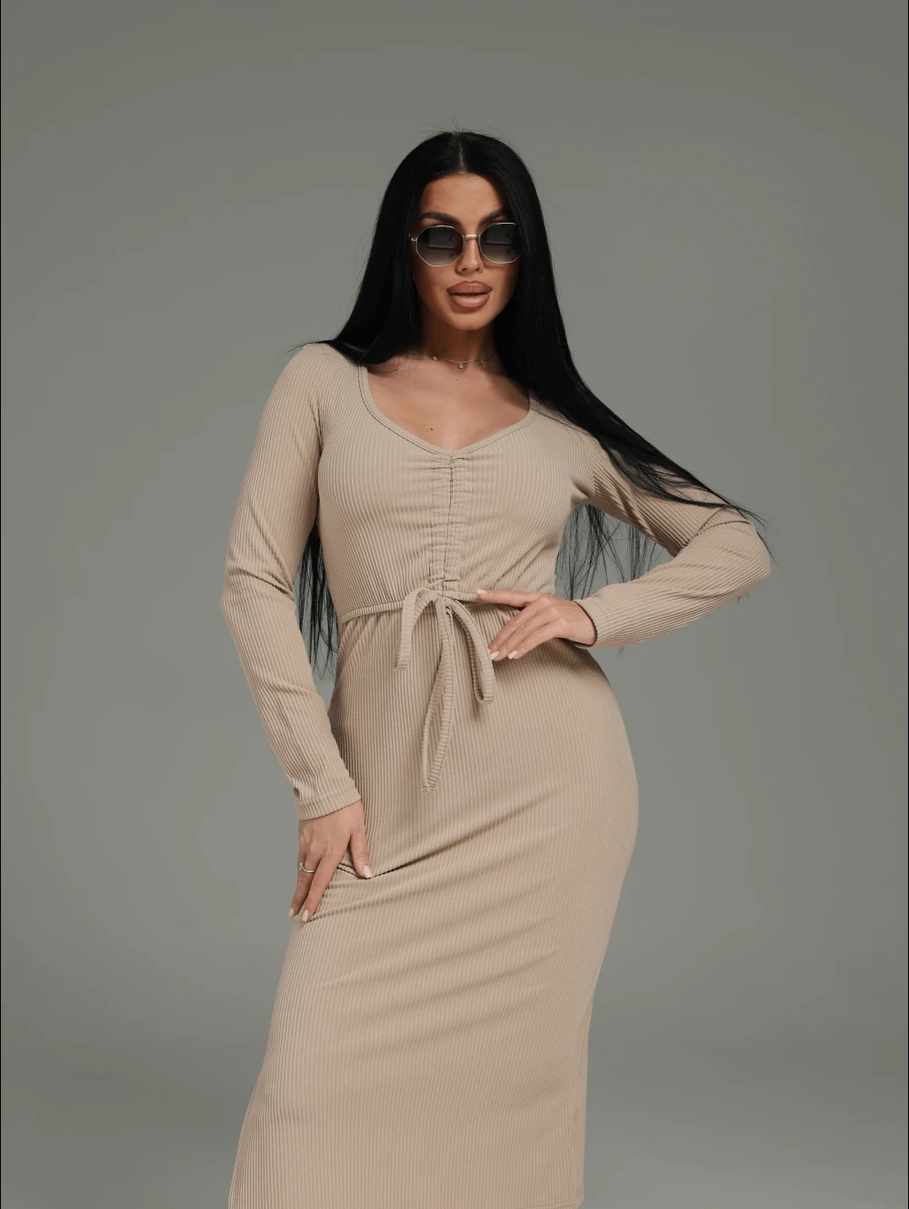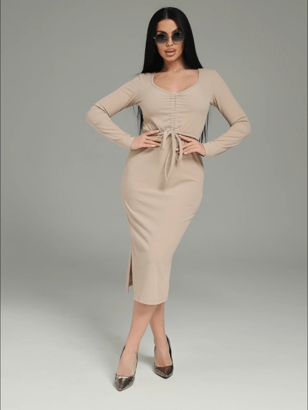 Платье миди Крис, приталенное, отрезное по талии с длинным, втачным рукавом. Верхняя часть полочки со средним швом, вдоль которого застрочены кулисы, в которые продеты шнурки из основного материала.