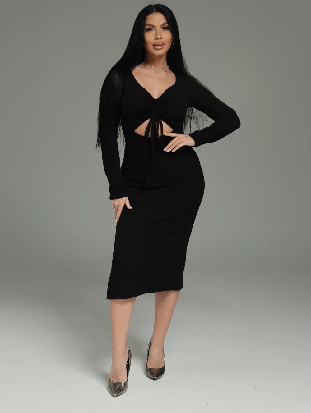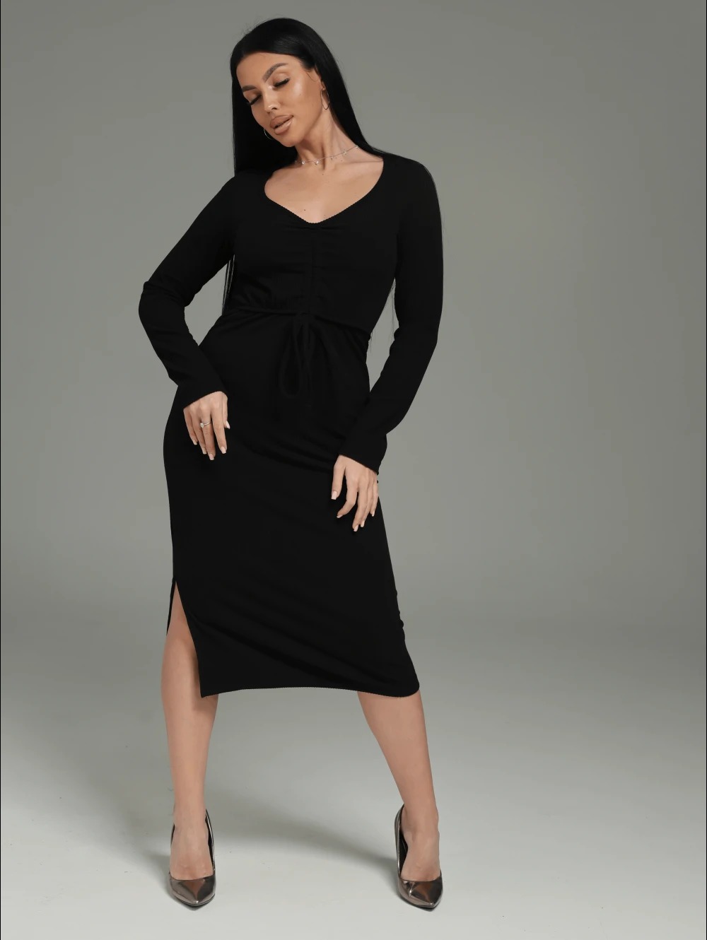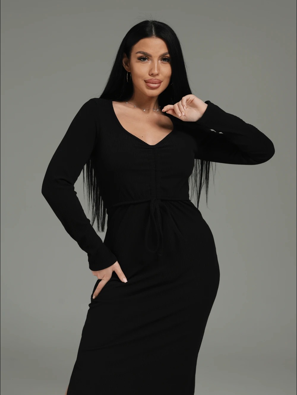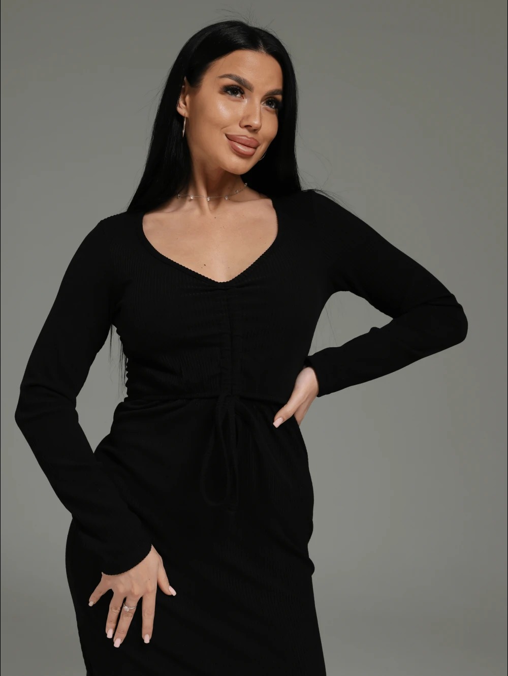 Платье миди Крис, приталенное, отрезное по талии с длинным, втачным рукавом. Верхняя часть полочки со средним швом, вдоль которого застрочены кулисы, в которые продеты шнурки из основного материала.