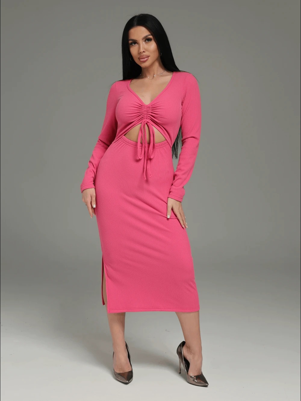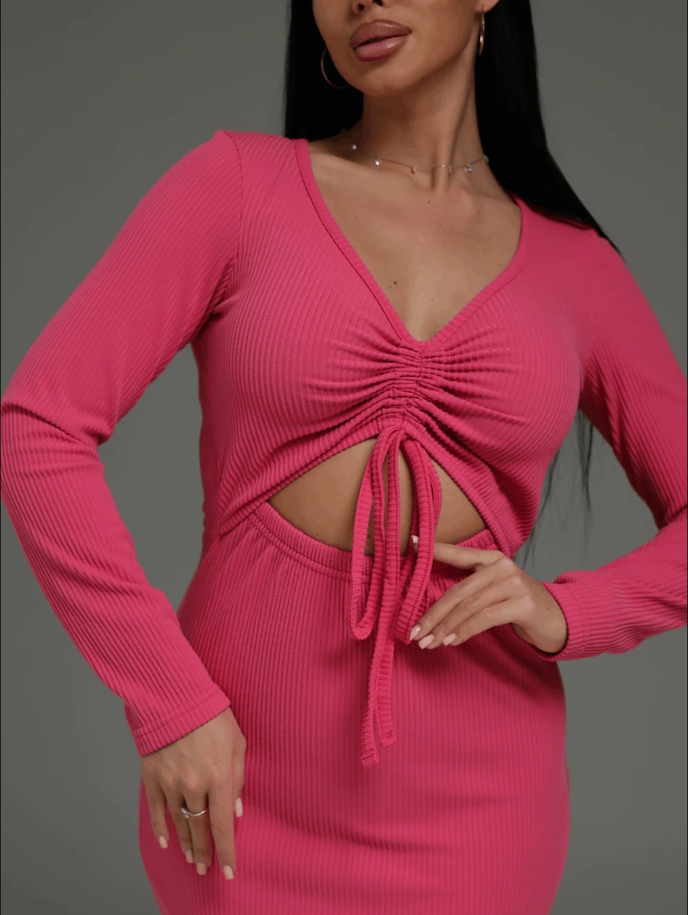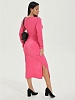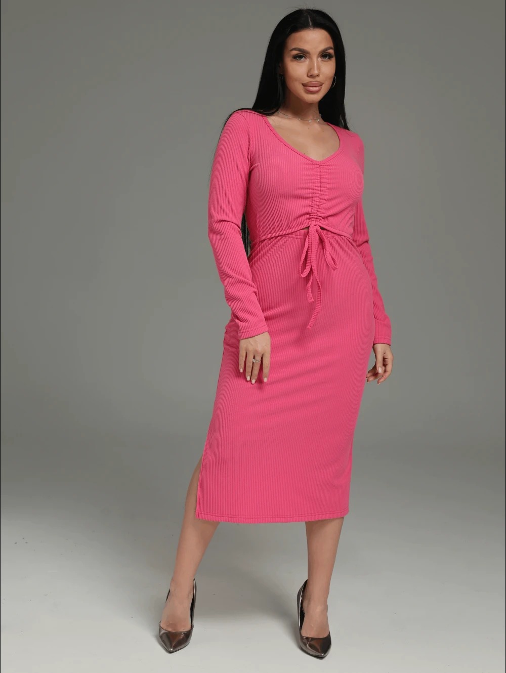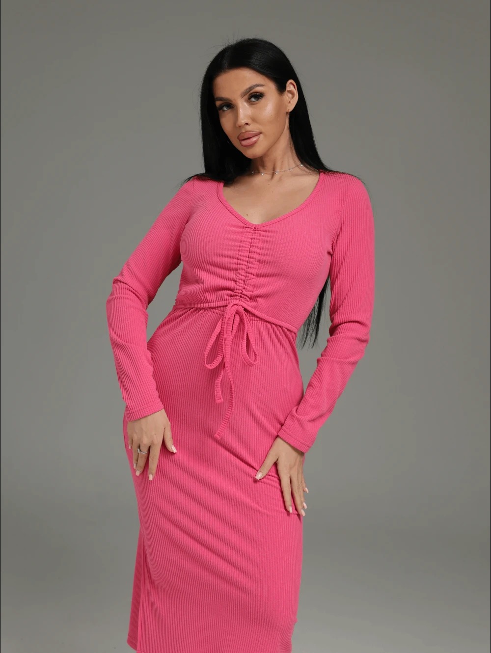 Платье миди Крис, приталенное, отрезное по талии с длинным, втачным рукавом. Верхняя часть полочки со средним швом, вдоль которого застрочены кулисы, в которые продеты шнурки из основного материала.