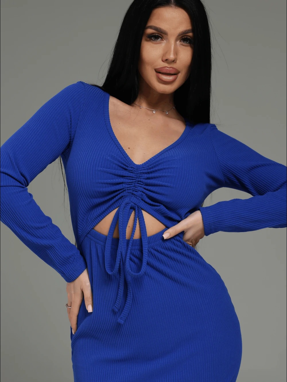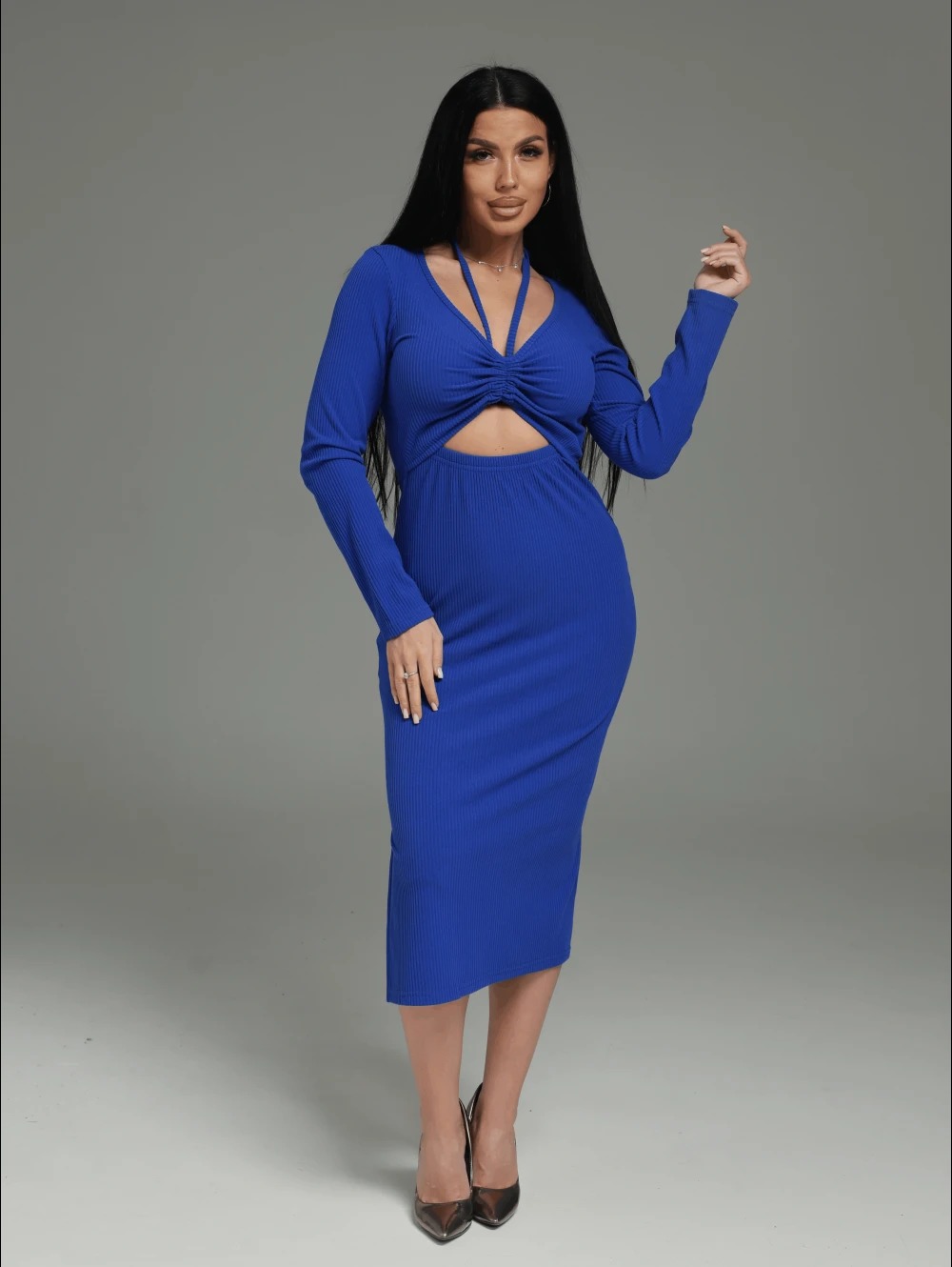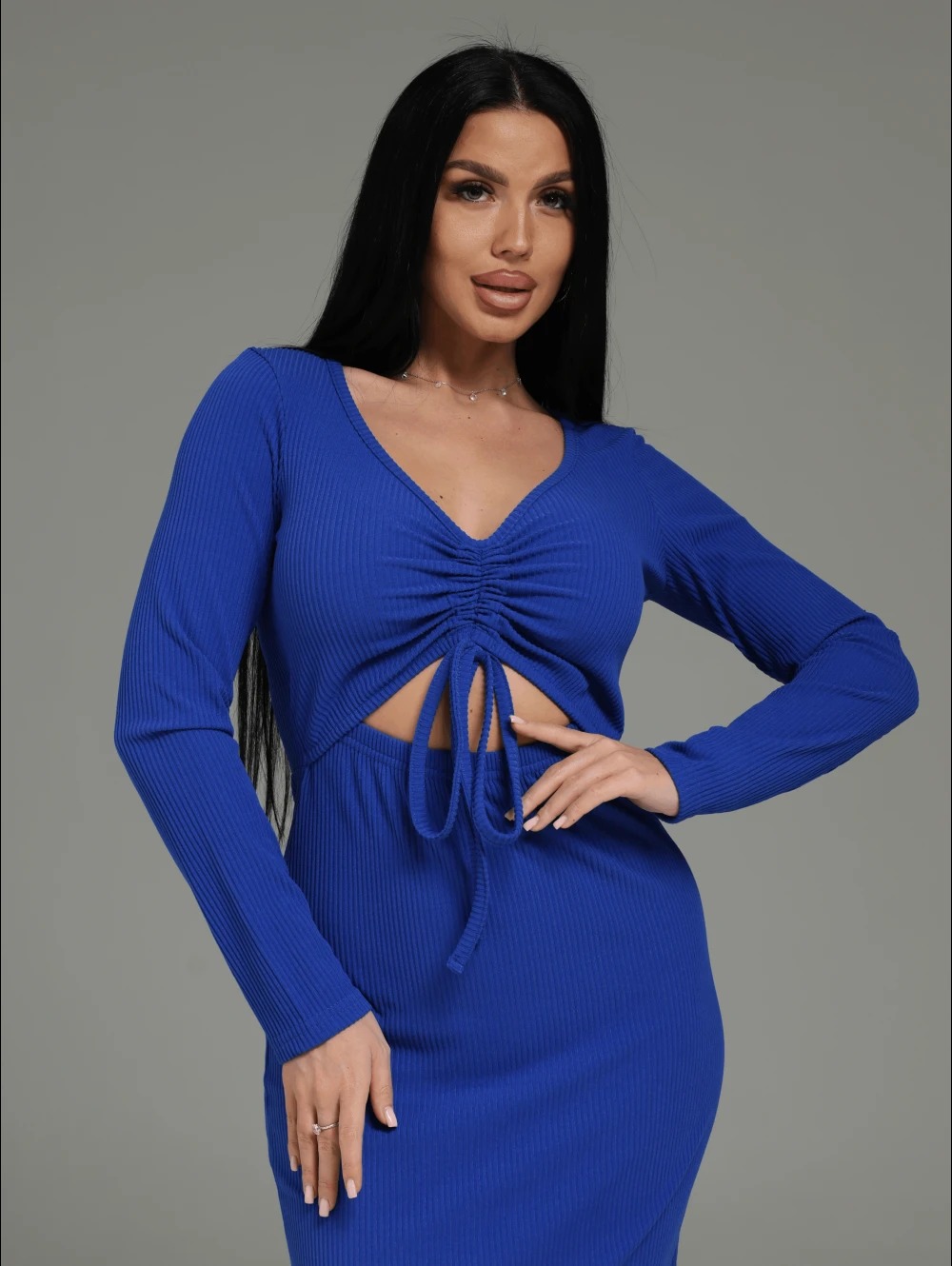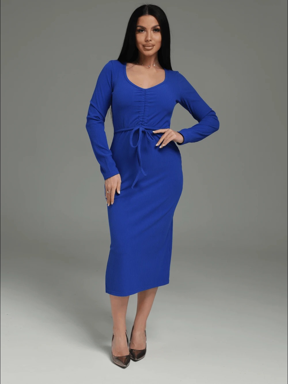 Платье миди Крис, приталенное, отрезное по талии с длинным, втачным рукавом. Верхняя часть полочки со средним швом, вдоль которого застрочены кулисы, в которые продеты шнурки из основного материала.