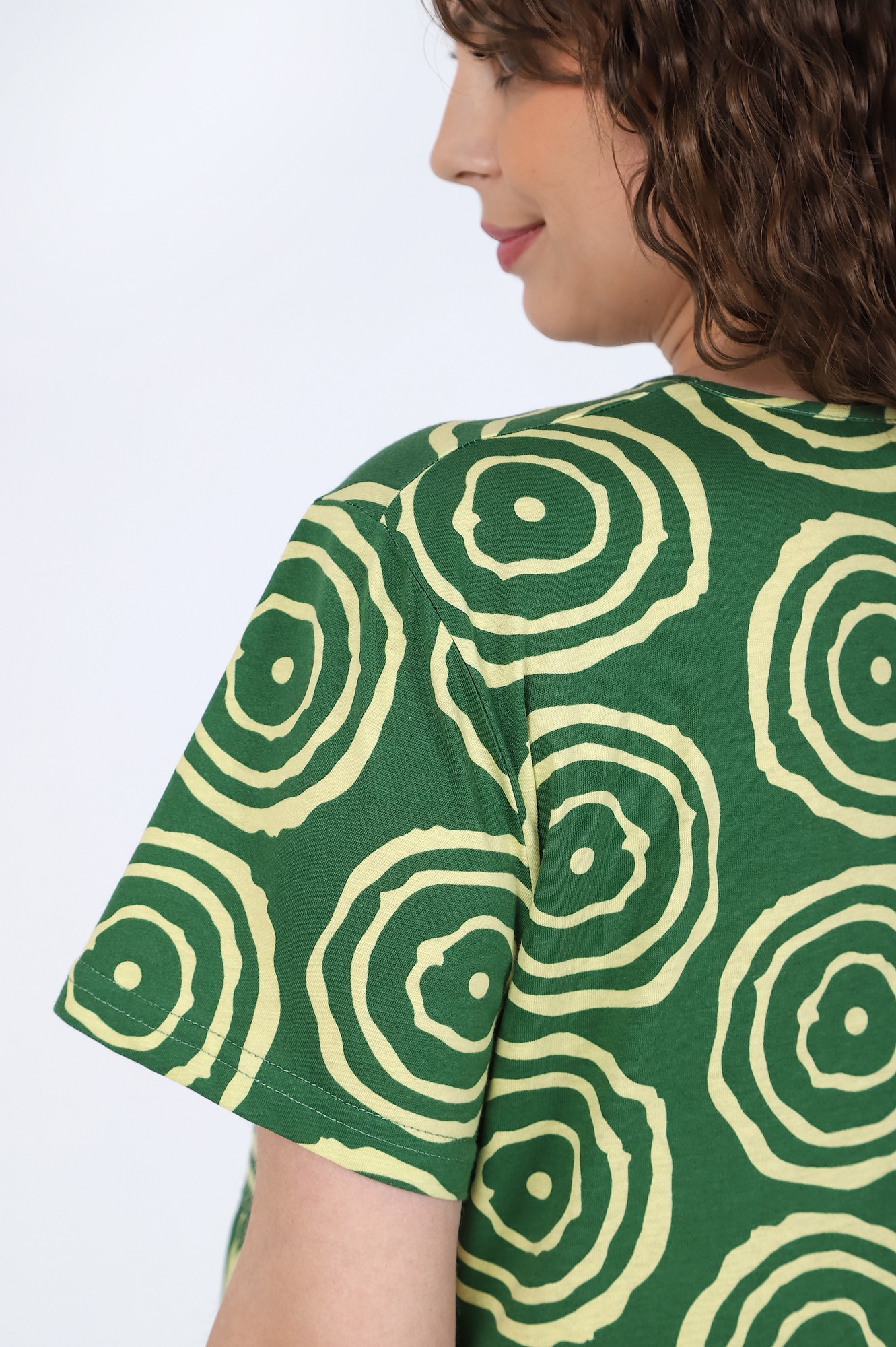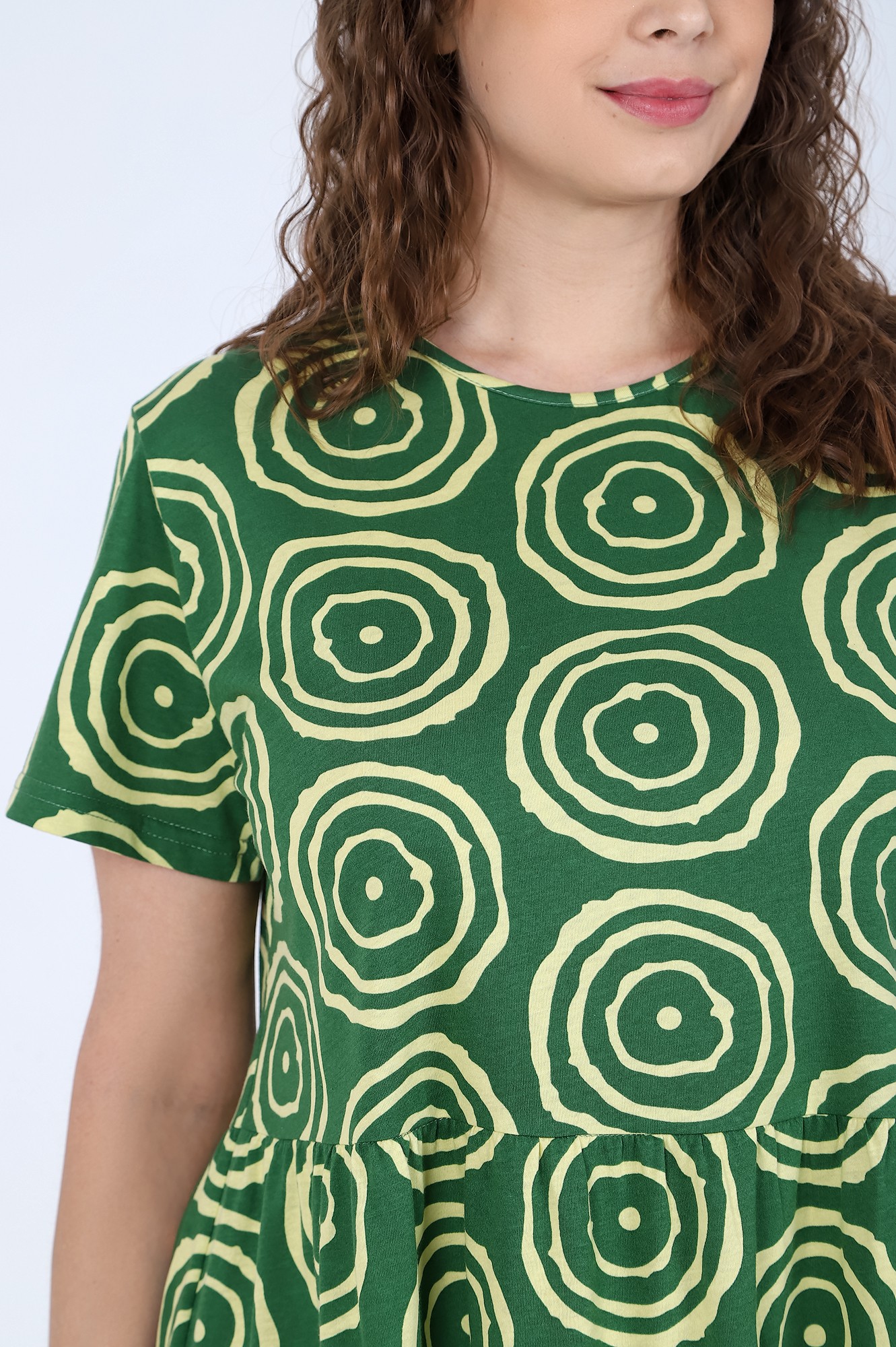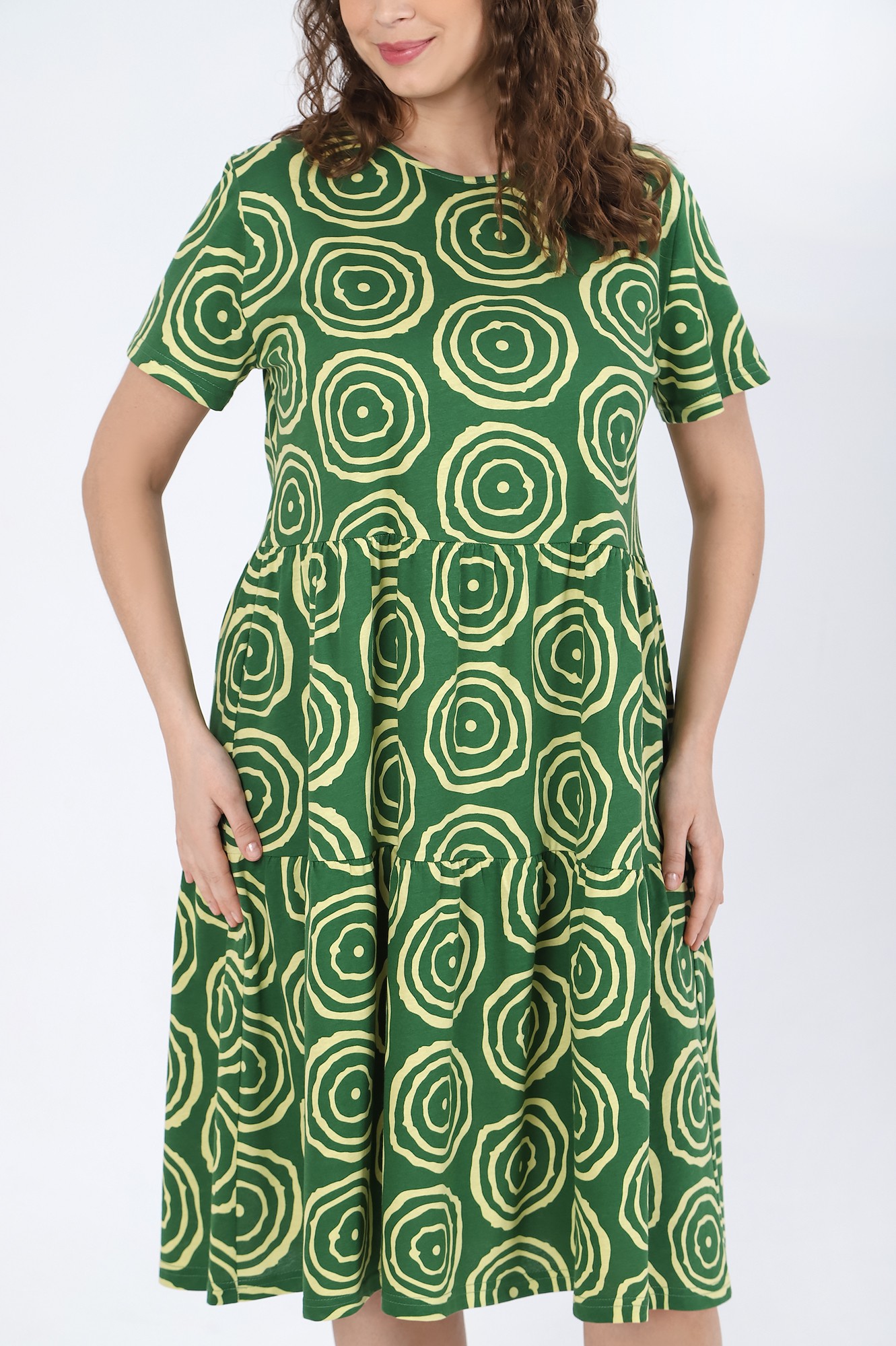 Платье женское из трикотажного полотна «кулирка» с набивным рисунком, свободного покроя, отрезное по линии талии, с короткими втачными рукавами и горловиной овальной формы, обработанной окантовкой из основного материала. Юбка – из двух ярусов, каждый из которых присборен по шву соединения с верхней деталью.