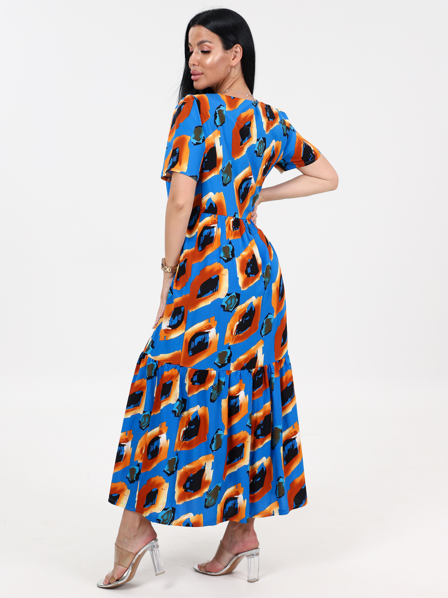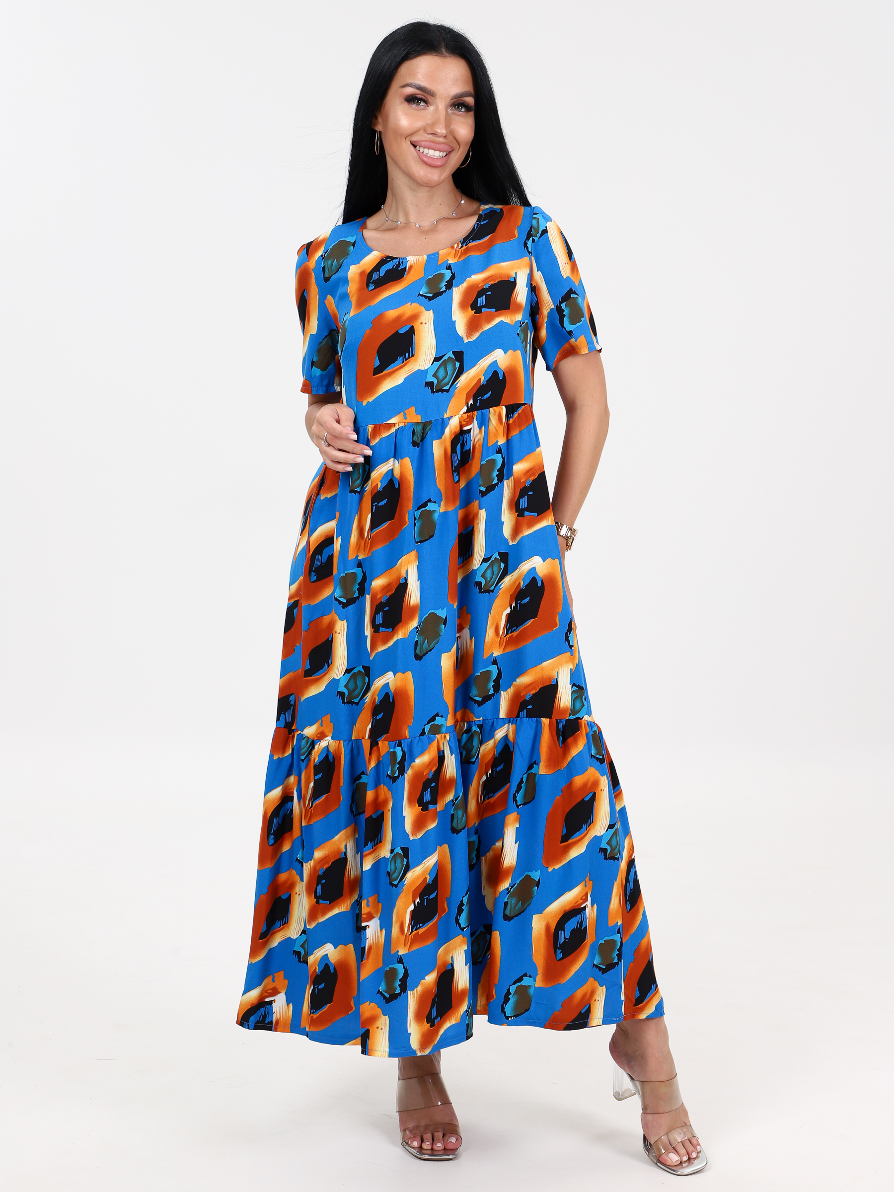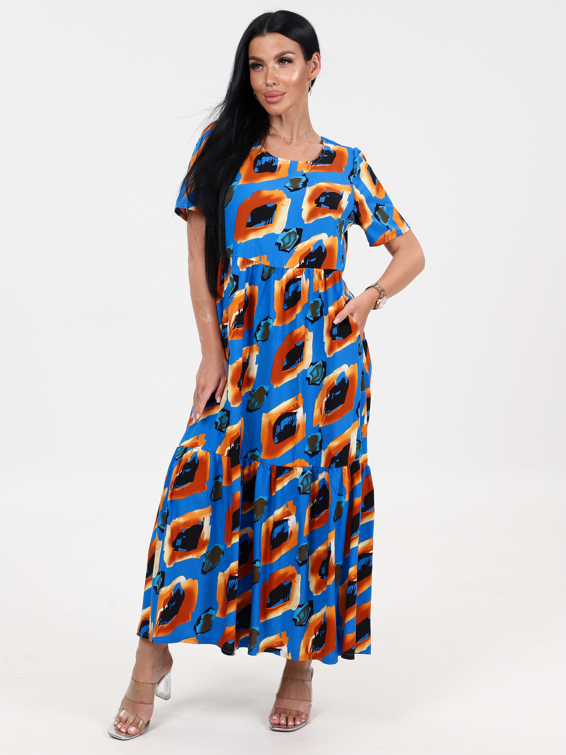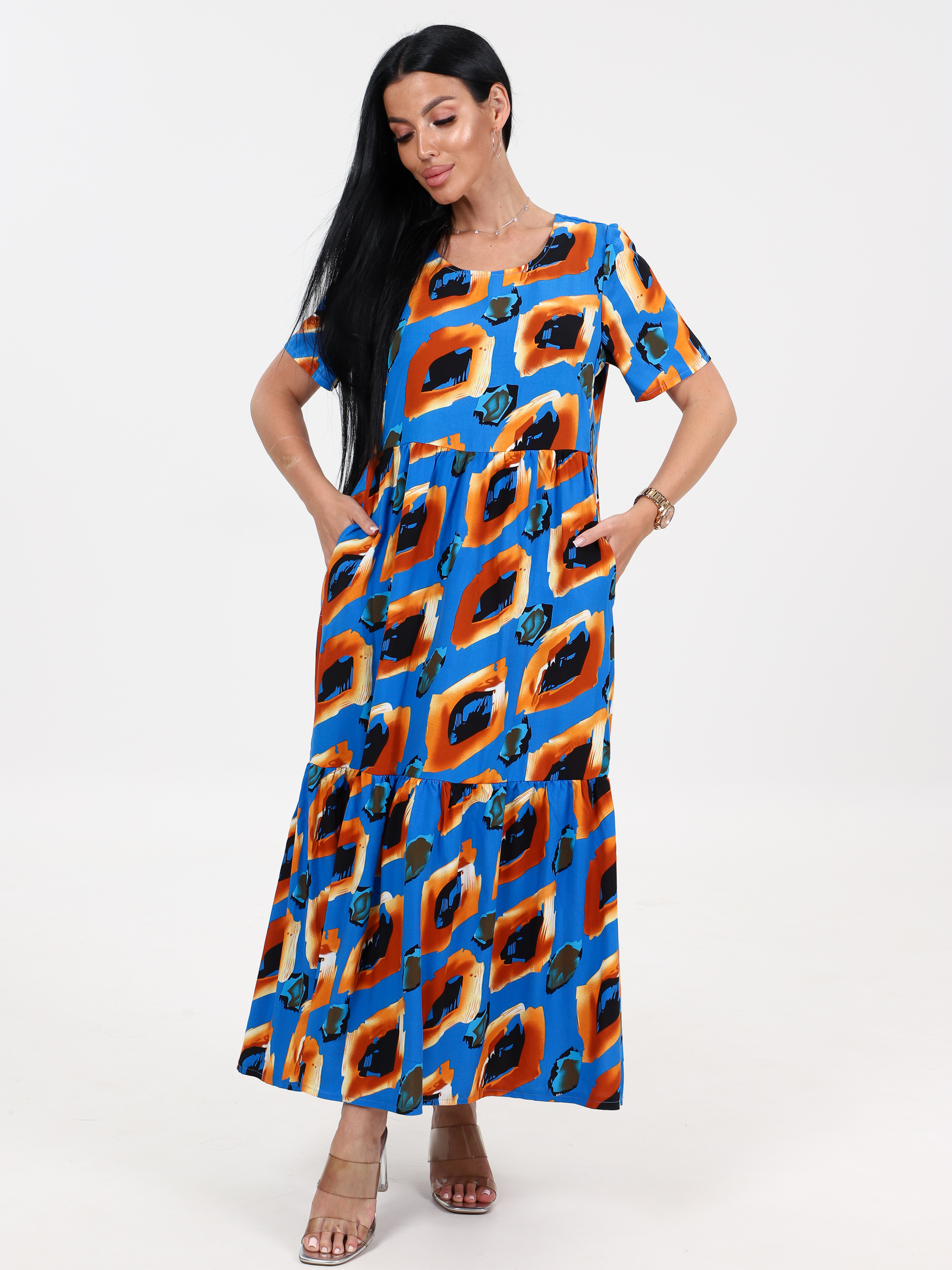 Платье из штапеля, очень воздушное, легкое, очень модное, приятное к телу. Длинное, свободное идеально подходит для теплой весны, лета и просто незаменимо в жаркую погоду. Аккуратный округлый вырез, рукав ниже локтя, свободный покрой, карманы, стильный рисунок - составляющие этого платья. Платье изготовлено из чистой вискозы. Платье свободного кроя отлично скрывает недостатки фигуры, а длинна вытягивает силуэт. Платье в этом стиле предназначено для любого повода. Его можно использовать для повседневных образов на работу, прогулку, похода в ресторан, незаменимо на отдыхе в жарких странах, на море и т.п. Также идеально подойдет как платье для беременных. Обращаем ваше внимание на то, что ткань не тянется.