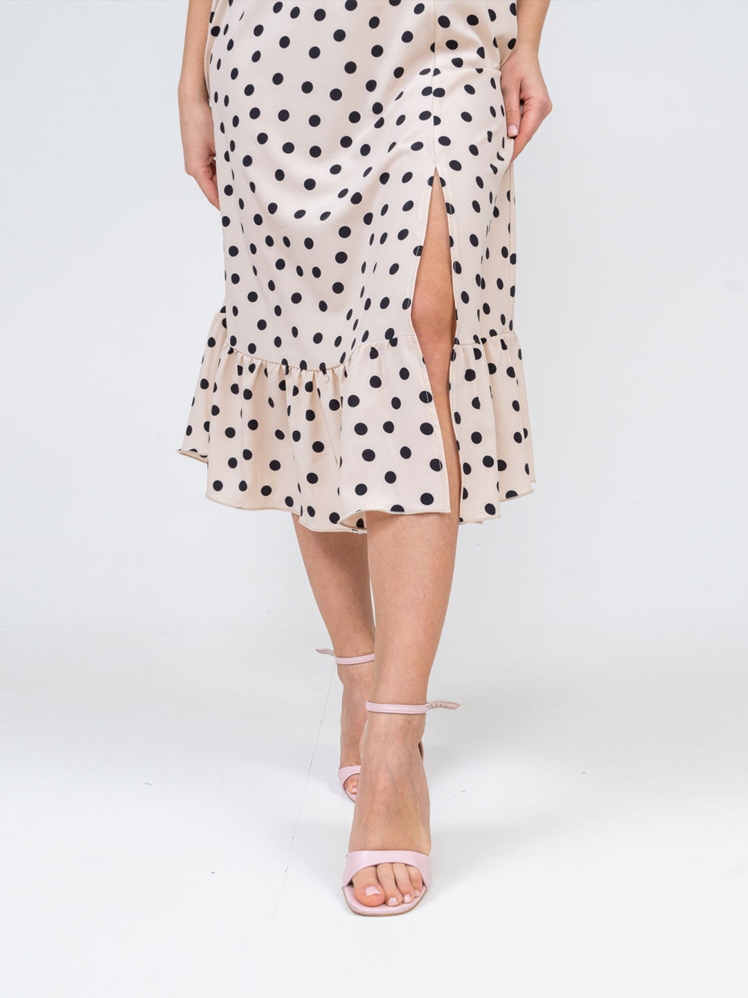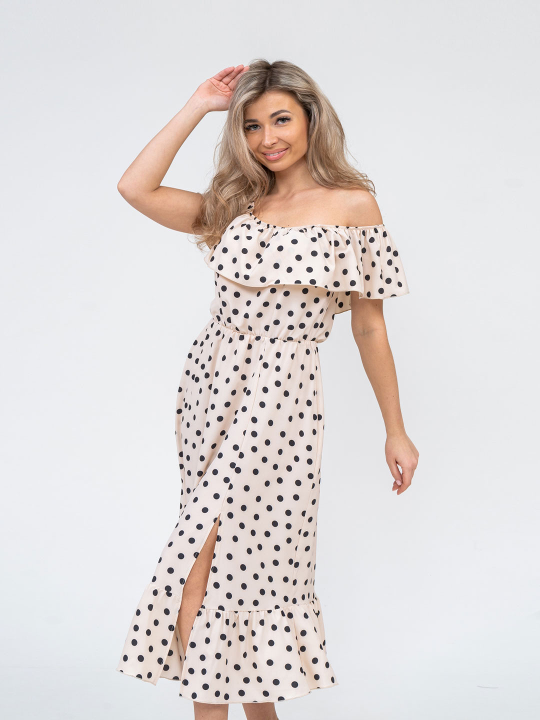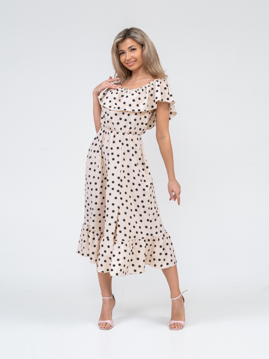 Женское легкое платье полуприлегающего силуэта. Имеет классический, всегда актуальный, рисунок - горошек.