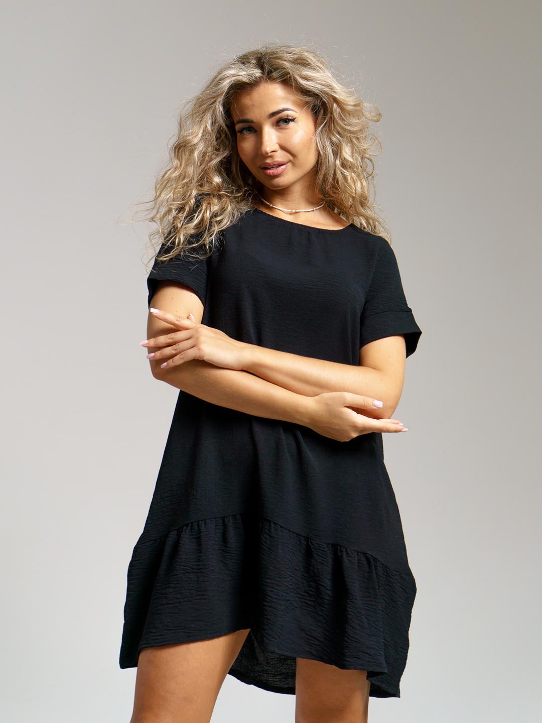 Воздушное платье с легким мятым эффектом, асимметричной линией низа, коротким рукавом и округлой горловиной. Платье подойдет на любой случай, дополните платье сандалями и шляпкой и вот у вас модный лук для пляжа, замените сандали на туфли, возьмите маленькую сумочку и вот отличный образ на работу или свидание.