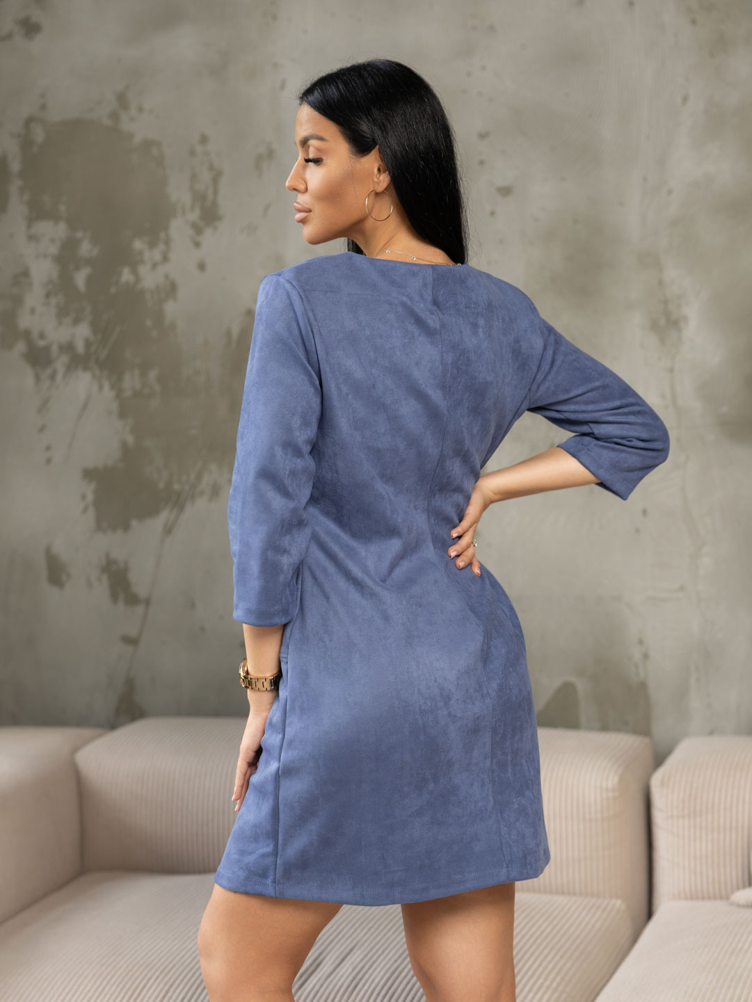 Платье прилегающего силуэта, из искусственной замши, длиной до середины бедра, с V-образной горловиной и рукавом 3/4.Платье отлично впишется в повседневный гардероб, идеально будет смотреться с массивными ботинками, либо с ботфортами.